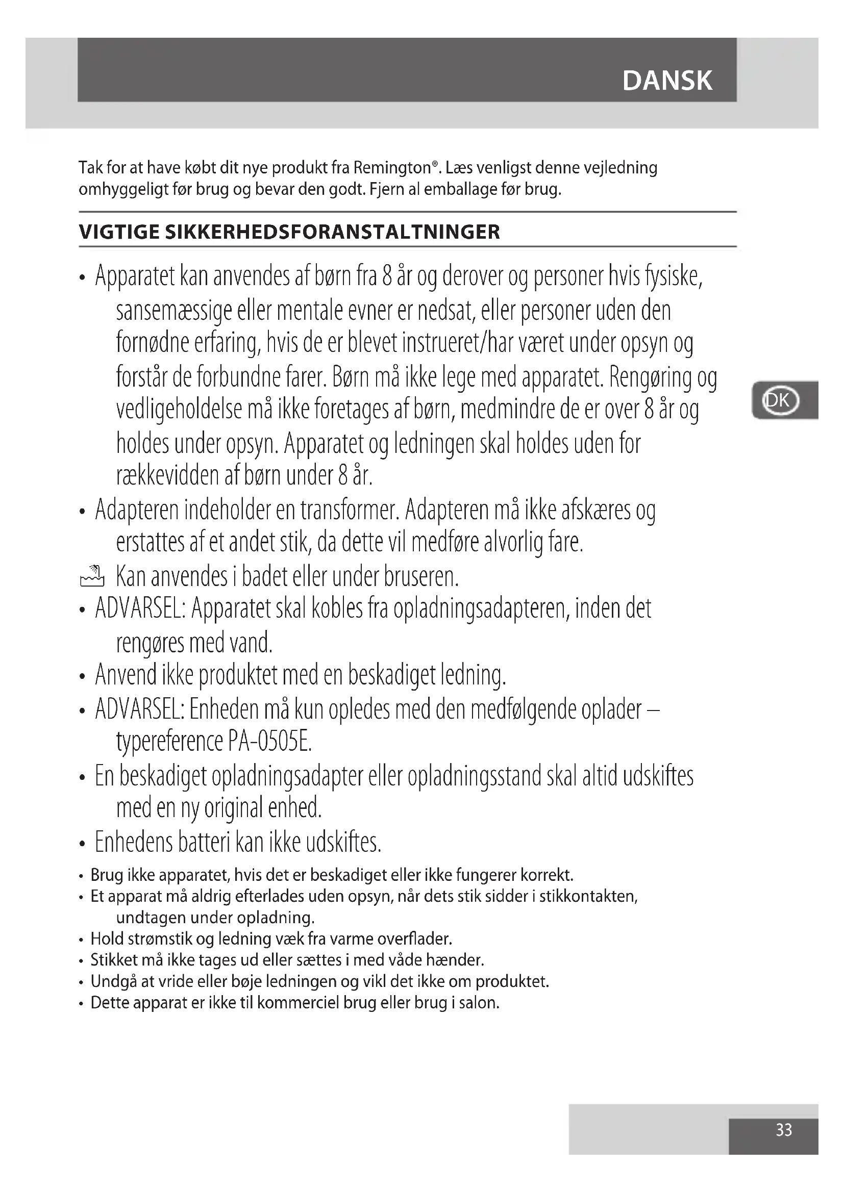 For å unngå miljø- og helseproblemer på grunn av farlige stoer, må apparater og oppladbare og ikke-oppladbare batterier markert med en av disse symbolene ikke kastes i usortert oentlig avfall. Kast alltid elektriske og elektroniske produkter og, hvis relevant, oppladbare og ikke-oppladbare batterier, på et egnet retursted for oentlig resirkulering/innsamling.45 SUOMI Kiitos, että valitsit tämän uuden Remington®-tuotteen. Lue ohjeet huolellisesti ja pidä ne tallessa. Poista kaikki pakkausmateriaali ennen käyttöä.