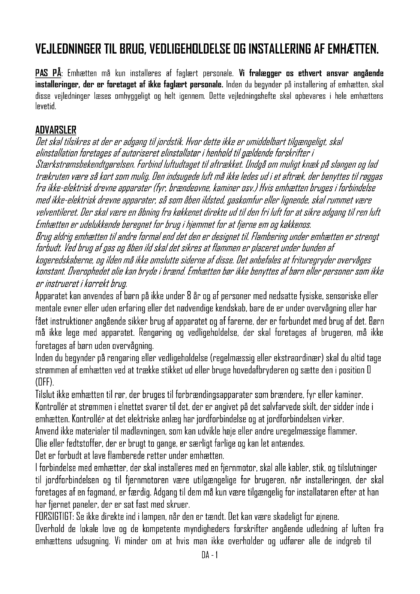 FRDA - 1 VEJLEDNINGER TIL BRUG, VEDLIGEHOLDELSE OG INSTALLERING AF EMHÆTTEN. PAS PÅ: Emhætten må kun installeres af faglært personale. Vi fralægger os ethvert ansvar angående installeringer, der er foretaget af ikke faglært personale. Inden du begynder på installering af emhætten, skal disse vejledninger læses omhyggeligt og helt igennem. Dette vejledningshefte skal opbevares i hele emhættens levetid. ADVARSLER Det skal tilsikres at der er adgang til jordstik. Hvor dette ikke er umiddelbart tilgængeligt, skal elinstallation foretages af autoriseret elinstallatør i henhold til gældende forskrifter i Stærkstrømsbekendtgørelsen. Forbind luftudtaget til aftrækket. Undgå om muligt knæk på slangen og lad trækruten være så kort som mulig. Den indsugede luft må ikke ledes ud i et aftræk, der benyttes til røggas fra ikke-elektrisk drevne apparater (fyr, brændeovne, kaminer osv.) Hvis emhætten bruges i forbindelse med ikke-elektrisk drevne apparater, så som åben ildsted, gaskomfur eller lignende, skal rummet være velventileret. Der skal være en åbning fra køkkenet direkte ud til den fri luft for at sikre adgang til ren luft Emhætten er udelukkende beregnet for brug i hjemmet for at fjerne em og køkkenos. Brug aldrig emhætten til andre formal end det den er designet til. Flambering under emhætten er strengt forbudt. Ved brug af gas og åben ild skal det sikres at flammen er placeret under bunden af kogeredskaberne, og ilden må ikke omslutte siderne af disse. Det anbefales at frituregryder overvåges konstant. Overophedet olie kan bryde i brænd. Emhætten bør ikke benyttes af børn eller personer som ikke er instrueret i korrekt brug. Apparatet kan anvendes af børn på ikke under 8 år og af personer med nedsatte fysiske, sensoriske eller mentale evner eller uden erfaring eller det nødvendige kendskab, bare de er under overvågning eller har fået instruktioner angående sikker brug af apparatet og af farerne, der er forbundet med brug af det. Børn må ikke lege med apparatet. Rengøring og vedligeholdelse, der skal foretages af brugeren, må ikke foretages af børn uden overvågning. Inden du begynder på rengøring eller vedligeholdelse (regelmæssig eller ekstraordinær) skal du altid tage strømmen af emhætten ved at trække stikket ud eller bruge hovedafbryderen og sætte den i position 0 (OFF). Tilslut ikke emhætten til rør, der bruges til forbrændingsapparater som brændere, fyr eller kaminer. Kontrollér at strømmen i elnettet svarer til det, der er angivet på det sølvfarvede skilt, der sidder inde i emhætten. Kontrollér at det elektriske anlæg har jordforbindelse og at jordforbindelsen virker. Anvend ikke materialer til madlavningen, som kan udvikle høje eller andre uregelmæssige flammer. Olie eller fedtstoffer, der er brugt to gange, er særligt farlige og kan let antændes. Det er forbudt at lave flamberede retter under emhætten. I forbindelse med emhætter, der skal installeres med en fjernmotor, skal alle kabler, stik, og tilslutninger til jordforbindelsen og til fjernmotoren være utilgængelige for brugeren, når installeringen, der skal foretages af en fagmand, er færdig. Adgang til dem må kun være tilgængelig for installatøren efter at han har fjernet paneler, der er sat fast med skruer. FORSIGTIGT: Se ikke direkte ind i lampen, når den er tændt. Det kan være skadeligt for øjnene. Overhold de lokale love og de kompetente myndigheders forskrifter angående udledning af luften fra emhættens udsugning. Vi minder om at hvis man ikke overholder og udfører alle de indgreb tilDA - 2 vedligeholdelse og rengøring, der er angivet i dette hefte, er der alvorlig fare for brand. PAS PÅ: De dele, man kan komme i berøring med, kan blive varme når emhætten bruges med madlavningsapparater. INSTALLERING Den mindste sikkerhedsafstand fra emhættens nederste plan til kogeplanet skal være på 65 cm; mindre afstande skal udelukkende autoriseres af fabrikanten (jf. installeringstegninger). Emhætten kan anvendes både i filtrerende og udsugende funktion. Ved filtrerende funktion, dvs. når luften sendes i cirkulation igen, skal man anvende kulfiltre (jf. paragraf KULFILTRE). Ved udsugende funktion, dvs. ved udblæsning udendørs af den filtrerede luft, er det nødvendigt at have et passende kompenseringssystem i overensstemmelse med de gældende love. Røgens udblæsningsrør skal have den samme diameter eller være større end den, der er i emhættens tilslutning. Lokalet, hvor emhætten installeres, skal have tilstrækkelig ventilation, når der samtidig anvendes andre apparater der bruger gas eller andre brændstoffer. Emhætter indrettet til fjernmotor Emhætter, der er indrettet til fjernmotor, er udstyret med et stik til tilslutning til fjernmotorens kabel. Dette stik sidder inde i emhætten. Sæt fjernmotorens kabel ind i emhætten gennem åbningen i emhætten (sædvanligvis ved siden af hullet til røg/damp udblæsningen) og forbind de to stik med hinanden. For at gøre dette, skal man følge tegningerne i vejledningsheftet til fjernmotoren. Emhætter uden motor (Art.*0***) må kun installeres og tilsluttes til den udsugeenhed, der leveres og angives af fabrikanten med max kraft på 690W. I forbindelse med emhætter, der skal installeres med en fjernmotor, skal alle kabler, stik, og tilslutninger til jordforbindelsen og til fjernmotoren være utilgængelige for brugeren, når installeringen, der skal foretages af en fagmand, er færdig. Adgang til dem må kun være tilgængelig for installatøren efter at han har fjernet paneler, der er sat fast med skruer.