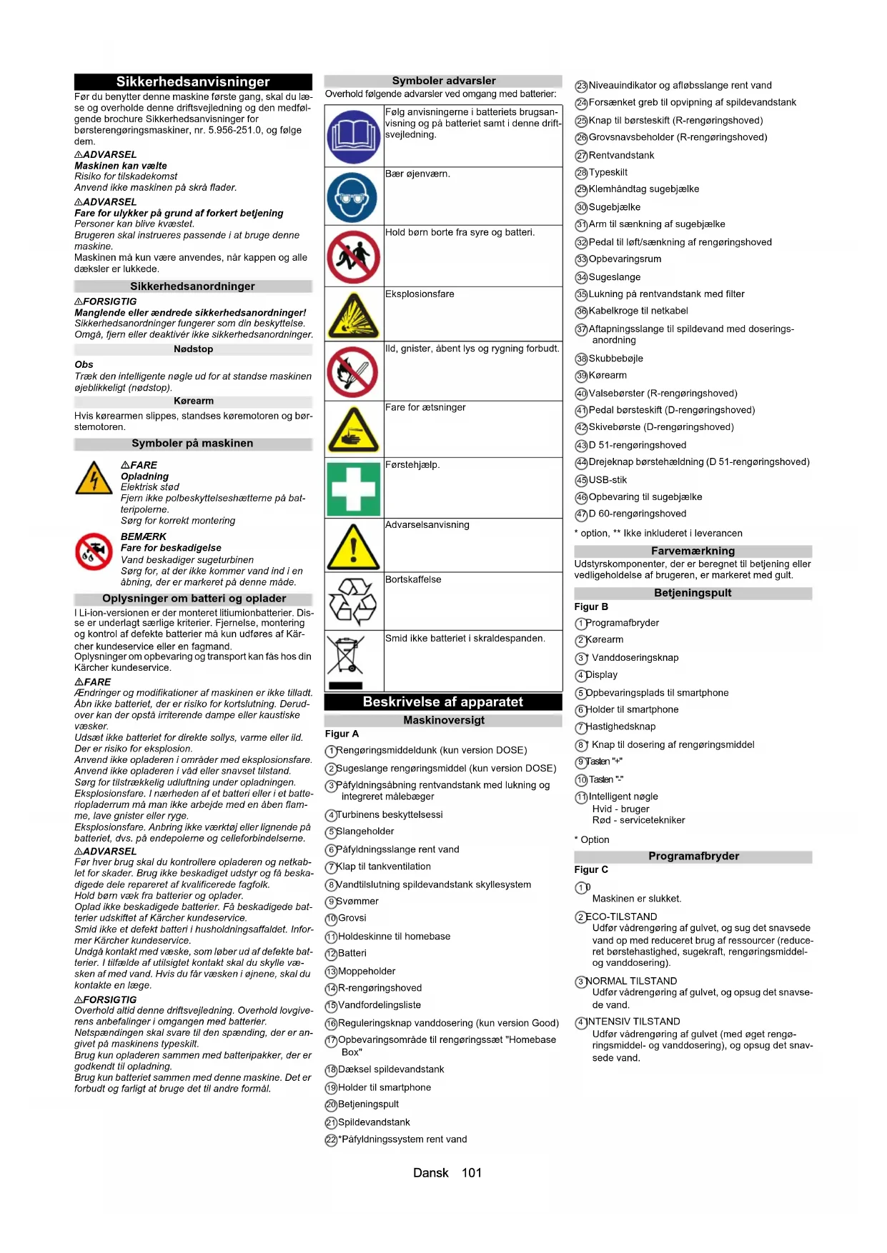• EU-overensstemmelseserklæring Dansk 101 Sikkerhedsanvisninger Før du benytter denne maskine første gang, skal du læ- se og overholde denne driftsvejledning og den medføl- gende brochure Sikkerhedsanvisninger for børsterengøringsmaskiner, nr. 5.956-251.0, og følge dem. 몇 ADVARSEL Maskinen kan vælte Risiko for tilskadekomst Anvend ikke maskinen på skrå flader. 몇 ADVARSEL Fare for ulykker på grund af forkert betjening Personer kan blive kvæstet. Brugeren skal instrueres passende i at bruge denne maskine. Maskinen må kun være anvendes, når kappen og alle dæksler er lukkede. Sikkerhedsanordninger 몇 FORSIGTIG Manglende eller ændrede sikkerhedsanordninger! Sikkerhedsanordninger fungerer som din beskyttelse. Omgå, fjern eller deaktivér ikke sikkerhedsanordninger. Nødstop Obs Træk den intelligente nøgle ud for at standse maskinen øjeblikkeligt (nødstop). Kørearm Hvis kørearmen slippes, standses køremotoren og bør- stemotoren. Symboler på maskinen Oplysninger om batteri og oplader I Li-ion-versionen er der monteret litiumionbatterier. Dis- se er underlagt særlige kriterier. Fjernelse, montering og kontrol af defekte batterier må kun udføres af Kär- cher kundeservice eller en fagmand. Oplysninger om opbevaring og transport kan fås hos din Kärcher kundeservice. FARE Ændringer og modifikationer af maskinen er ikke tilladt. Åbn ikke batteriet, der er risiko for kortslutning. Derud- over kan der opstå irriterende dampe eller kaustiske væsker. Udsæt ikke batteriet for direkte sollys, varme eller ild. Der er risiko for eksplosion. Anvend ikke opladeren i områder med eksplosionsfare. Anvend ikke opladeren i våd eller snavset tilstand. Sørg for tilstrækkelig udluftning under opladningen. Eksplosionsfare. I nærheden af et batteri eller i et batte- riopladerrum må man ikke arbejde med en åben flam- me, lave gnister eller ryge. Eksplosionsfare. Anbring ikke værktøj eller lignende på batteriet, dvs. på endepolerne og celleforbindelserne. 몇 ADVARSEL Før hver brug skal du kontrollere opladeren og netkab- let for skader. Brug ikke beskadiget udstyr og få beska- digede dele repareret af kvalificerede fagfolk. Hold børn væk fra batterier og oplader. Oplad ikke beskadigede batterier. Få beskadigede bat- terier udskiftet af Kärcher kundeservice. Smid ikke et defekt batteri i husholdningsaffaldet. Infor- mer Kärcher kundeservice. Undgå kontakt med væske, som løber ud af defekte bat- terier. I tilfælde af utilsigtet kontakt skal du skylle væ- sken af med vand. Hvis du får væsken i øjnene, skal du kontakte en læge. 몇 FORSIGTIG Overhold altid denne driftsvejledning. Overhold lovgive- rens anbefalinger i omgangen med batterier. Netspændingen skal svare til den spænding, der er an- givet på maskinens typeskilt. Brug kun opladeren sammen med batteripakker, der er godkendt til opladning. Brug kun batteriet sammen med denne maskine. Det er forbudt og farligt at bruge det til andre formål. Symboler advarsler Overhold følgende advarsler ved omgang med batterier: Beskrivelse af apparatet Maskinoversigt Figur A 1 Rengøringsmiddeldunk (kun version DOSE) 2 Sugeslange rengøringsmiddel (kun version DOSE) 3 Påfyldningsåbning rentvandstank med lukning og integreret målebæger 4 Turbinens beskyttelsessi 5 Slangeholder 6 Påfyldningsslange rent vand 7 Klap til tankventilation 8 Vandtilslutning spildevandstank skyllesystem 9 Svømmer 10 Grovsi 11 Holdeskinne til homebase 12 Batteri 13 Moppeholder 14 R-rengøringshoved 15 Vandfordelingsliste 16 Reguleringsknap vanddosering (kun version Good) 17 Opbevaringsområde til rengøringssæt "Homebase Box" 18 Dæksel spildevandstank 19 Holder til smartphone 20 Betjeningspult 21 Spildevandstank 22 *Påfyldningssystem rent vand 23 Niveauindikator og afløbsslange rent vand 24 Forsænket greb til opvipning af spildevandstank 25 Knap til børsteskift (R-rengøringshoved) 26 Grovsnavsbeholder (R-rengøringshoved) 27 Rentvandstank 28 Typeskilt 29 Klemhåndtag sugebjælke 30 Sugebjælke 31 Arm til sænkning af sugebjælke 32 Pedal til løft/sænkning af rengøringshoved 33 Opbevaringsrum 34 Sugeslange 35 Lukning på rentvandstank med filter 36 Kabelkroge til netkabel 37 Aftapningsslange til spildevand med doserings- anordning 38 Skubbebøjle 39 Kørearm 40 Valsebørster (R-rengøringshoved) 41 Pedal børsteskift (D-rengøringshoved) 42 Skivebørste (D-rengøringshoved) 43 D 51-rengøringshoved 44 Drejeknap børstehældning (D 51-rengøringshoved) 45 USB-stik 46 Opbevaring til sugebjælke 47 D 60-rengøringshoved p. 108