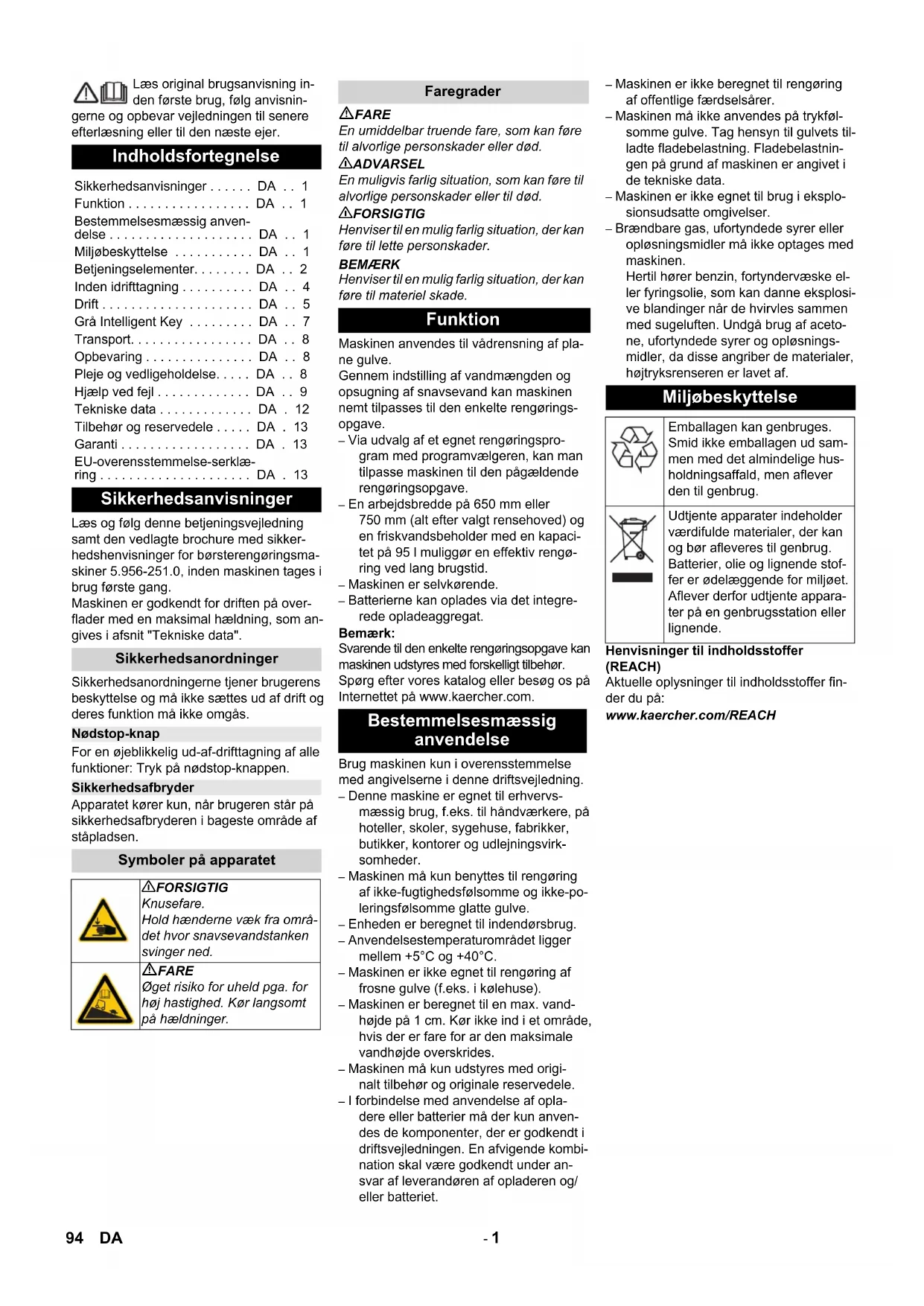 Chairman of the Board of Management Director Regulatory Affairs & Certification 93PT- 1 Læs original brugsanvisning in- den første brug, følg anvisnin- gerne og opbevar vejledningen til senere efterlæsning eller til den næste ejer. Læs og følg denne betjeningsvejledning samt den vedlagte brochure med sikker- hedshenvisninger for børsterengøringsma- skiner 5.956-251.0, inden maskinen tages i brug første gang. Maskinen er godkendt for driften på over- flader med en maksimal hældning, som an- gives i afsnit "Tekniske data". Sikkerhedsanordningerne tjener brugerens beskyttelse og må ikke sættes ud af drift og deres funktion må ikke omgås. For en øjeblikkelig ud-af-drifttagning af alle funktioner: Tryk på nødstop-knappen. Apparatet kører kun, når brugeren står på sikkerhedsafbryderen i bageste område af ståpladsen. FARE En umiddelbar truende fare, som kan føre til alvorlige personskader eller død. 몇 ADVARSEL En muligvis farlig situation, som kan føre til alvorlige personskader eller til død. 몇 FORSIGTIG Henviser til en mulig farlig situation, der kan føre til lette personskader. BEMÆRK Henviser til en mulig farlig situation, der kan føre til materiel skade. Maskinen anvendes til vådrensning af pla- ne gulve. Gennem indstilling af vandmængden og opsugning af snavsevand kan maskinen nemt tilpasses til den enkelte rengørings- opgave. – Via udvalg af et egnet rengøringspro- gram med programvælgeren, kan man tilpasse maskinen til den pågældende rengøringsopgave. – En arbejdsbredde på 650 mm eller 750 mm (alt efter valgt rensehoved) og en friskvandsbeholder med en kapaci- tet på 95 l muliggør en effektiv rengø- ring ved lang brugstid. – Maskinen er selvkørende. – Batterierne kan oplades via det integre- rede opladeaggregat. Bemærk: Svarende til den enkelte rengøringsopgave kan maskinen udstyres med forskelligt tilbehør. Spørg efter vores katalog eller besøg os på Internettet på www.kaercher.com. Brug maskinen kun i overensstemmelse med angivelserne i denne driftsvejledning. – Denne maskine er egnet til erhvervs- mæssig brug, f.eks. til håndværkere, på hoteller, skoler, sygehuse, fabrikker, butikker, kontorer og udlejningsvirk- somheder. – Maskinen må kun benyttes til rengøring af ikke-fugtighedsfølsomme og ikke-po- leringsfølsomme glatte gulve. – Enheden er beregnet til indendørsbrug. – Anvendelsestemperaturområdet ligger mellem +5°C og +40°C. – Maskinen er ikke egnet til rengøring af frosne gulve (f.eks. i kølehuse). – Maskinen er beregnet til en max. vand- højde på 1 cm. Kør ikke ind i et område, hvis der er fare for ar den maksimale vandhøjde overskrides. – Maskinen må kun udstyres med origi- nalt tilbehør og originale reservedele. – I forbindelse med anvendelse af opla- dere eller batterier må der kun anven- des de komponenter, der er godkendt i driftsvejledningen. En afvigende kombi- nation skal være godkendt under an- svar af leverandøren af opladeren og/ eller batteriet. – Maskinen er ikke beregnet til rengøring af offentlige færdselsårer. – Maskinen må ikke anvendes på trykføl- somme gulve. Tag hensyn til gulvets til- ladte fladebelastning. Fladebelastnin- gen på grund af maskinen er angivet i de tekniske data. – Maskinen er ikke egnet til brug i eksplo- sionsudsatte omgivelser. – Brændbare gas, ufortyndede syrer eller opløsningsmidler må ikke optages med maskinen. Hertil hører benzin, fortyndervæske el- ler fyringsolie, som kan danne eksplosi- ve blandinger når de hvirvles sammen med sugeluften. Undgå brug af aceto- ne, ufortyndede syrer og opløsnings- midler, da disse angriber de materialer, højtryksrenseren er lavet af. Henvisninger til indholdsstoffer (REACH) Aktuelle oplysninger til indholdsstoffer fin- der du på: www.kaercher.com/REACH Indholdsfortegnelse Sikkerhedsanvisninger . . . . . . DA . . 1 Funktion . . . . . . . . . . . . . . . . . DA . . 1 Bestemmelsesmæssig anven- delse . . . . . . . . . . . . . . . . . . . . DA . . 1 Miljøbeskyttelse . . . . . . . . . . . DA . . 1 Betjeningselementer. . . . . . . . DA . . 2 Inden idrifttagning . . . . . . . . . . DA . . 4 Drift . . . . . . . . . . . . . . . . . . . . . DA . . 5 Grå Intelligent Key . . . . . . . . . DA . . 7 Transport. . . . . . . . . . . . . . . . . DA . . 8 Opbevaring . . . . . . . . . . . . . . . DA . . 8 Pleje og vedligeholdelse. . . . . DA . . 8 Hjælp ved fejl . . . . . . . . . . . . . DA . . 9 Tekniske data . . . . . . . . . . . . . DA . 12 Tilbehør og reservedele . . . . . DA . 13 Garanti . . . . . . . . . . . . . . . . . . DA . 13 EU-overensstemmelse-serklæ- ring . . . . . . . . . . . . . . . . . . . . . DA . 13 Sikkerhedsanvisninger Sikkerhedsanordninger Nødstop-knap Sikkerhedsafbryder Symboler på apparatet 몇 FORSIGTIG Knusefare. Hold hænderne væk fra områ- det hvor snavsevandstanken svinger ned. FARE Øget risiko for uheld pga. for høj hastighed. Kør langsomt på hældninger. Faregrader Funktion Bestemmelsesmæssig anvendelse Miljøbeskyttelse Emballagen kan genbruges. Smid ikke emballagen ud sam- men med det almindelige hus- holdningsaffald, men aflever den til genbrug. Udtjente apparater indeholder værdifulde materialer, der kan og bør afleveres til genbrug. Batterier, olie og lignende stof- fer er ødelæggende for miljøet. Aflever derfor udtjente appara- ter på en genbrugsstation eller lignende. 94 DA- 2 1 Rat 2 Påfyldningssystem 3 Låg, snavsevandstank 4 Dæksel til snavsevandsbeholder 5 Turbinebeskyttelsessi (under svømme- ren) 6 Svømmerventil 7 Fnugfilter 8 Beskyttelse mod grov snavs 9 Snavsevandsbeholder 10 Afledningsslange for snavsevand 11 Dæksel ferskvandstank med filter fersk- vand 12 Højdejustering sugebjælke 13 Vingemøtrikker til fastgørelse af suge- bjælken 14 Sugebjælke * 15 Klemmegreb til hældning af sugebjæl- ken 16 Rensemiddeldunk (kun variant Dose) 17 Dæksel til friskvandsbeholder 18 Åbningshåndtag stopbremse 19 Sikkerhedsafbryder 20 K