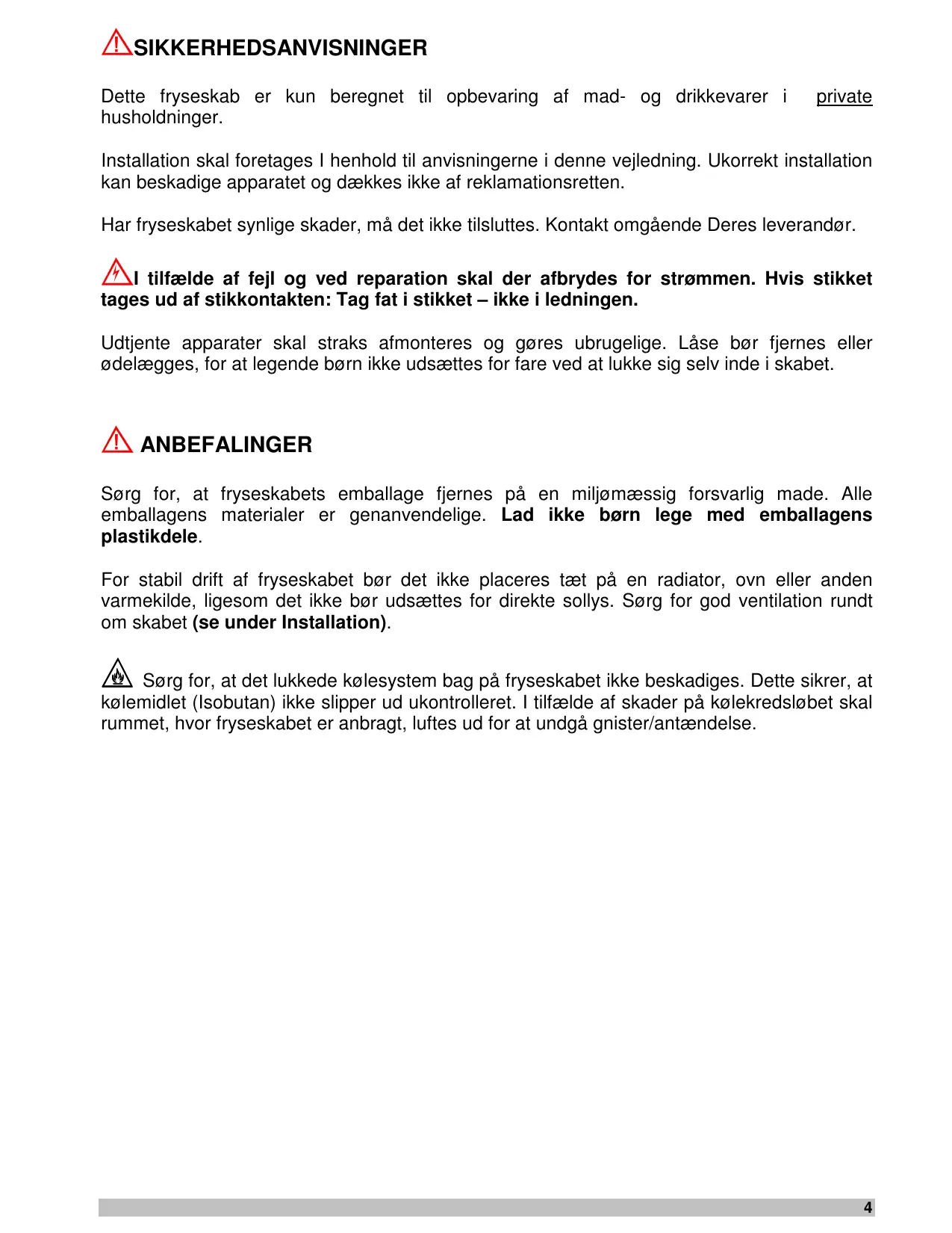 SIKKERHEDSANVISNINGER Dette fryseskab er kun beregnet til opbevaring af mad- og drikkevarer i husholdninger. private Installation skal foretages I henhold til anvisningerne i denne vejledning. Ukorrekt installation kan beskadige apparatet og dækkes ikke af reklamationsretten. Har fryseskabet synlige skader, må det ikke tilsluttes. Kontakt omgående Deres leverandør. I tilfælde af fejl og ved reparation skal der afbrydes for strømmen. Hvis stikket tages ud af stikkontakten: Tag fat i stikket – ikke i ledningen. Udtjente apparater skal straks afmonteres og gøres ubrugelige. Låse bør fjernes eller ødelægges, for at legende børn ikke udsættes for fare ved at lukke sig selv inde i skabet. ANBEFALINGER Sørg for, at fryseskabets emballage fjernes på en miljømæssig forsvarlig made. Alle emballagens materialer er genanvendelige. Lad ikke børn lege med emballagens plastikdele. For stabil drift af fryseskabet bør det ikke placeres tæt på en radiator, ovn eller anden varmekilde, ligesom det ikke bør udsættes for direkte sollys. Sørg for god ventilation rundt om skabet (se under Installation). Sørg for, at det lukkede kølesystem bag på fryseskabet ikke beskadiges. Dette sikrer, at kølemidlet (Isobutan) ikke slipper ud ukontrolleret. I tilfælde af skader på kølekredsløbet skal rummet, hvor fryseskabet er anbragt, luftes ud for at undgå gnister/antændelse.