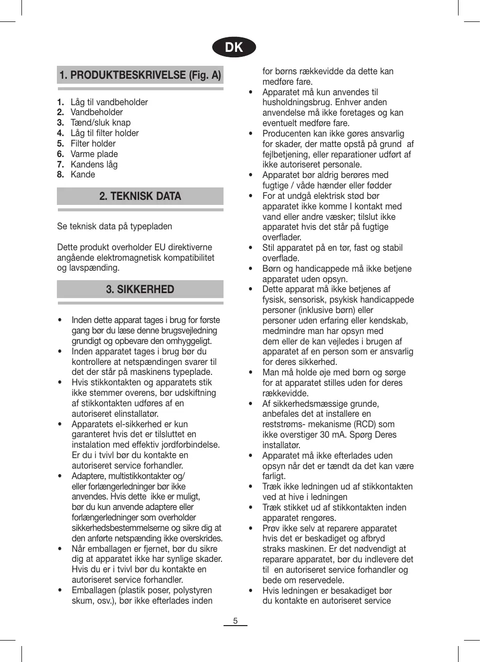 forhandler og anmode at få den skiftet ud. Apparatet må ikke bruges udendørs og udsættes for regn, sol, is, osv. Apparatet må ikke efterlades på eller være I nærheden af varmekilder (gas eller el-kogeplade eller en ovn). Brug ikke “svære” eller slibende rengøringsmidler når apparatet skal renses. Varme overflader må ikke berøres. Anvend håndtagene. Undgå at ledningen kommer I kontakt med varme overflader. Undgå at al væsken fordamper. Kanden må ikke opvarmes når den er tom. Brug ikke en ituslået kande eller en kande, som har et løst eller svagt håndtag/grep. Udskift en defekt kande. En lille rævne i glasset kan ituslå kanden eller man kan risikere at glaspartikler blandes med kaffen. Rengør ikke kanden med ståluld eller slibende rensemidler som kan ridse og beskadige glasset. Kanden må kun anvendes med dette apparat. Sæt aldrig kanden på et varm underlag eller i nærheden af varmekilder som f.eks. en brændeovn, komfurplade, en varm ovn, mikroovn eller lign. Apparatet bør håndteres forsigtigt.