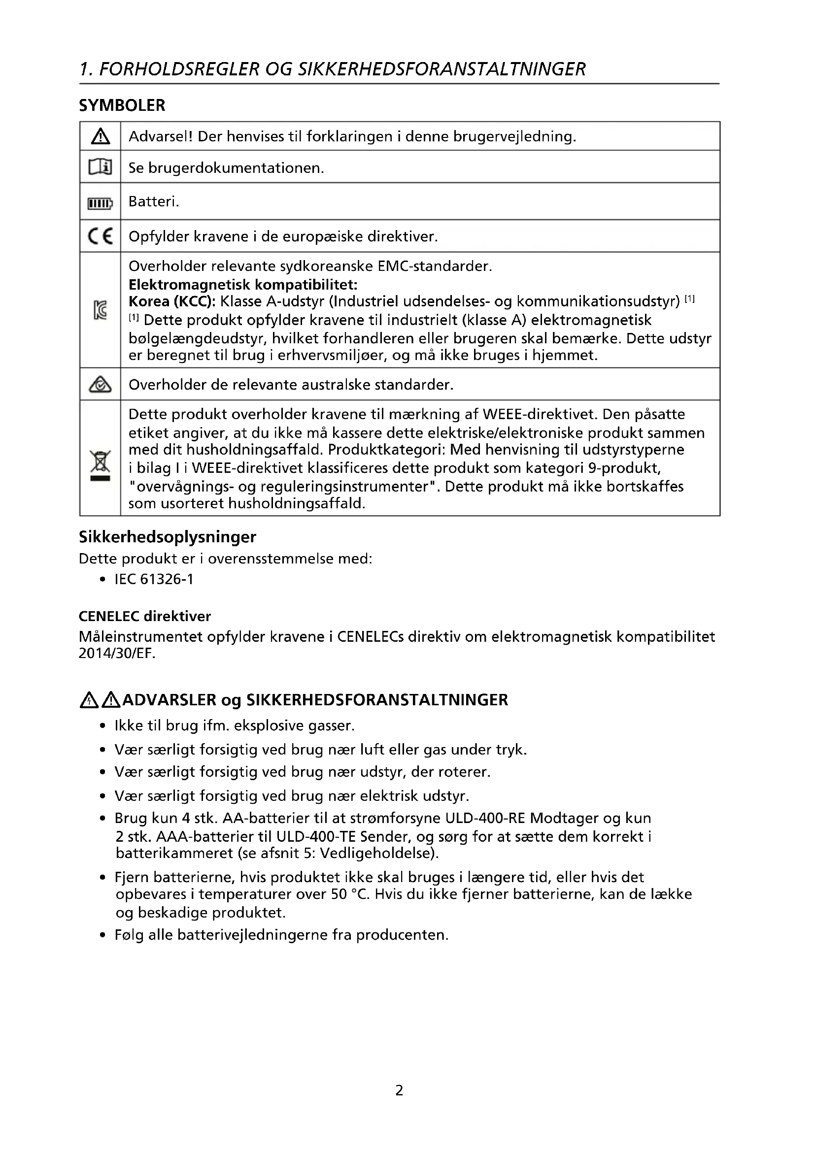 - IEC 61326-1 CENELEC direktiver Måleinstrumentet opfylder kravene i CENELECs direktiv om elektromagnetisk kompatibilitet 2014/30/EF. ADVARSLER og SIKKERHEDSFORANSTALTNINGER