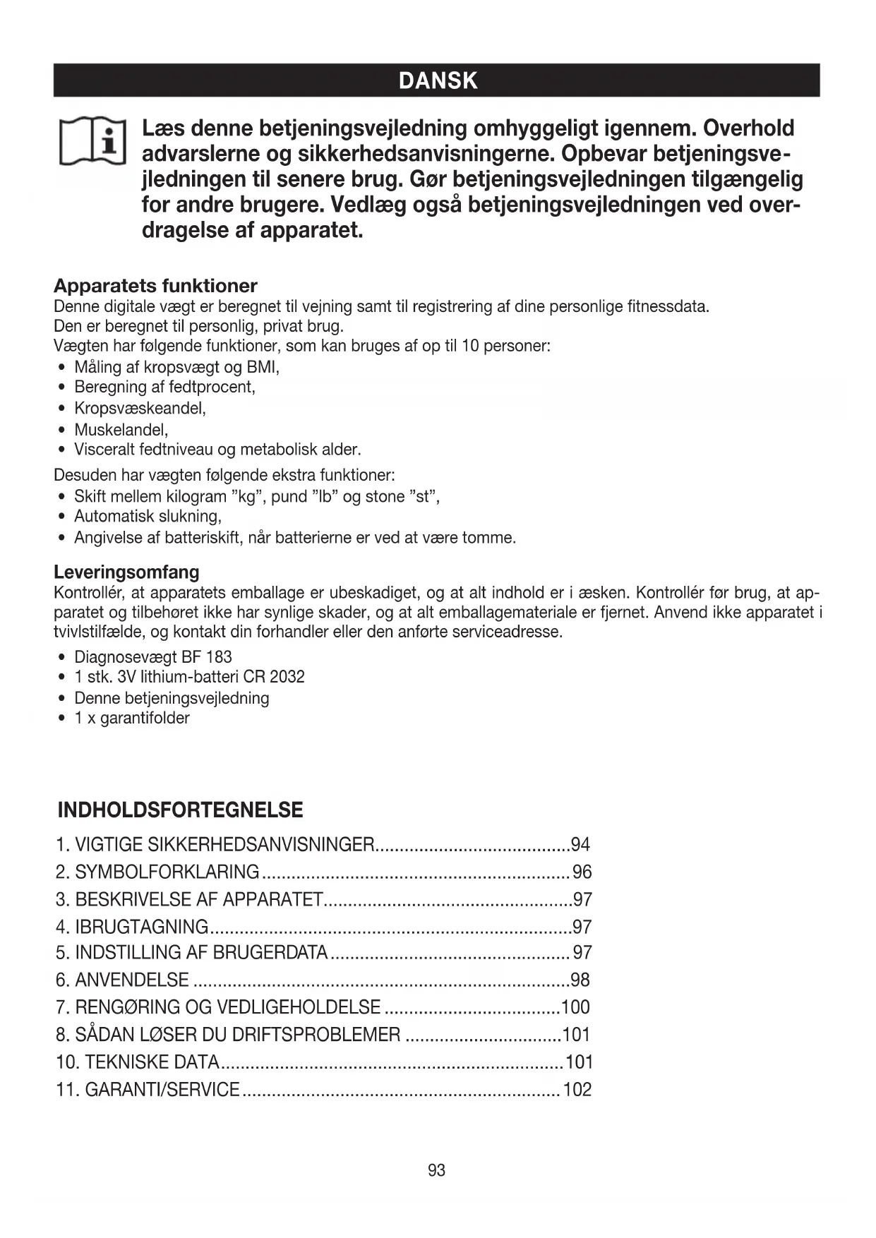 INDHOLDSFORTEGNELSE Apparatets funktioner Denne digitale vægt er beregnet til vejning samt til registrering af dine personlige fitnessdata. Den er beregnet til personlig, privat brug. Vægten har følgende funktioner, som kan bruges af op til 10 personer: