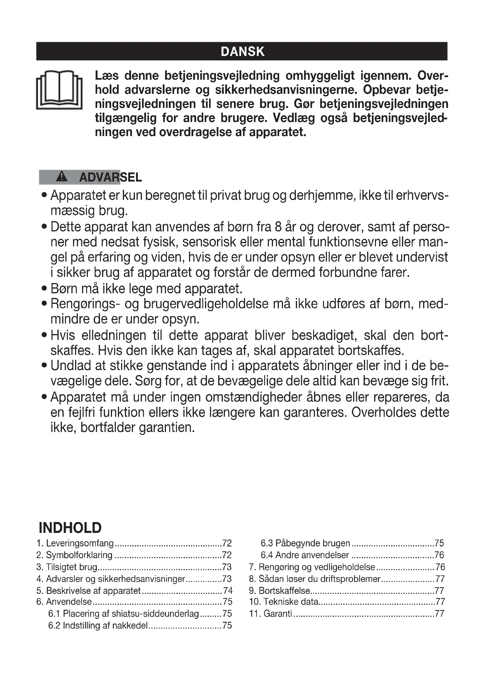 Apparatet er udelukkende beregnet til massage af ryggen og nakken på mennesker. Det kan ikke erstatte lægebehandling. Brug ikke massageapparatet, hvis en eller flere af de følgende advarsler gælder for dig. ADVARSEL Anvend ikke massageapparatet