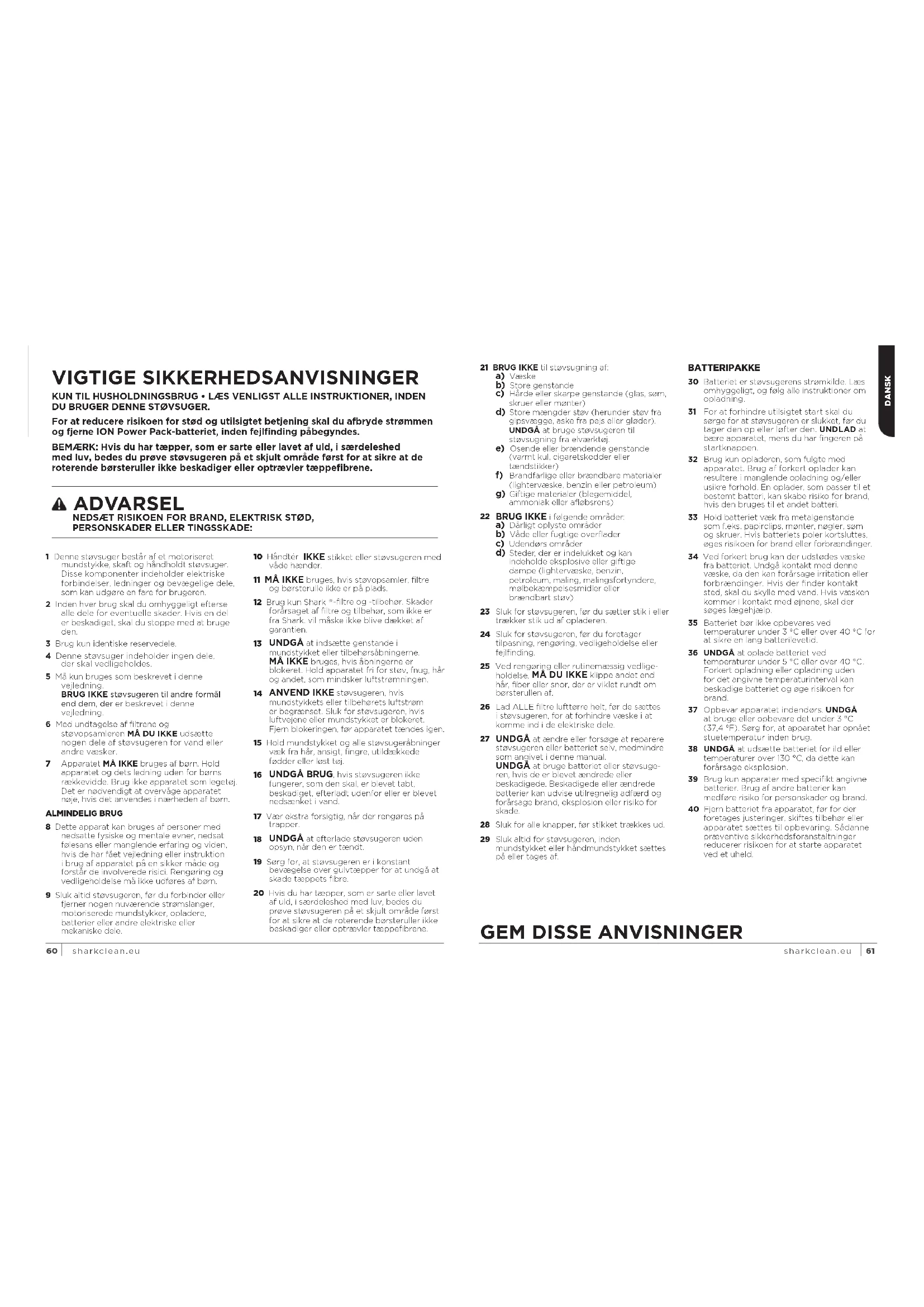 UNDGÅ at ændre eller forsøge at reparere støvsugeren eller batteriet selv, medmindre som angivet i denne manual. UNDGÅ at bruge batteriet eller støvsuge- ren, hvis de er blevet ændrede eller beskadigede. Beskadigede eller ændrede batterier kan udvise utilregnelig adfærd og forårsage brand, eksplosion eller risiko for skade. 28 Sluk for alle knapper, før stikket trækkes ud. 29 Sluk altid for støvsugeren, inden mundstykket eller håndmundstykket sættes på eller tages af. BATTERIPAKKE 30 Batteriet er støvsugerens strømkilde. Læs omhyggeligt, og følg alle instruktioner om opladning. 31 For at forhindre utilsigtet start skal du sørge for at støvsugeren er slukket, før du tager den op eller løfter den. UNDLAD at bære apparatet, mens du har fingeren på startknappen. 32 Brug kun opladeren, som fulgte med apparatet. Brug af forkert oplader kan resultere i manglende opladning og/eller usikre forhold. En oplader, som passer til et bestemt batteri, kan skabe risiko for brand, hvis den bruges til et andet batteri. 33 Hold batteriet væk fra metalgenstande som f.eks. papirclips, mønter, nøgler, søm og skruer. Hvis batteriets poler kortsluttes, øges risikoen for brand eller forbrændinger. 34 Ved forkert brug kan der udstødes væske fra batteriet. Undgå kontakt med denne væske, da den kan forårsage irritation eller forbrændinger. Hvis der finder kontakt sted, skal du skylle med vand. Hvis væsken kommer i kontakt med øjnene, skal der søges lægehjælp. 35 Batteriet bør ikke opbevares ved temperaturer under 3 °C eller over 40 °C for at sikre en lang batterilevetid. 36 UNDGÅ at oplade batteriet ved temperaturer under 5 °C eller over 40 °C. Forkert opladning eller opladning uden for det angivne temperaturinterval kan beskadige batteriet og øge risikoen for brand. 37 Opbevar apparatet indendørs. UNDGÅ at bruge eller opbevare det under 3 °C (37,4 °F). Sørg for, at apparatet har opnået stuetemperatur inden brug. 38 UNDGÅ at udsætte batteriet for ild eller temperaturer over 130 °C, da dette kan forårsage eksplosion. 39 Brug kun apparater med specifikt angivne batterier. Brug af andre batterier kan medføre risiko for personskader og brand. 40 Fjern batteriet fra apparatet, før for der foretages justeringer, skiftes tilbehør eller apparatet sættes til opbevaring. Sådanne præventive sikkerhedsforanstaltninger reducerer risikoen for at starte apparatet ved et uheld. ADVARSEL NEDSÆT RISIKOEN FOR BRAND, ELEKTRISK STØD, PERSONSKADER ELLER TINGSSKADE: VIGTIGE SIKKERHEDSANVISNINGER KUN TIL HUSHOLDNINGSBRUG • LÆS VENLIGST ALLE INSTRUKTIONER, INDEN DU BRUGER DENNE STØVSUGER. For at reducere risikoen for stød og utilsigtet betjening skal du afbryde strømmen og fjerne ION Power Pack-batteriet, inden fejlfinding påbegyndes. BEMÆRK: Hvis du har tæpper, som er sarte eller lavet af uld, i særdeleshed med luv, bedes du prøve støvsugeren på et skjult område først for at sikre at de roterende børsteruller ikke beskadiger eller optrævler tæppefibrene.63sharkclean.eu62 sharkclean.eu DANSK SAMLING