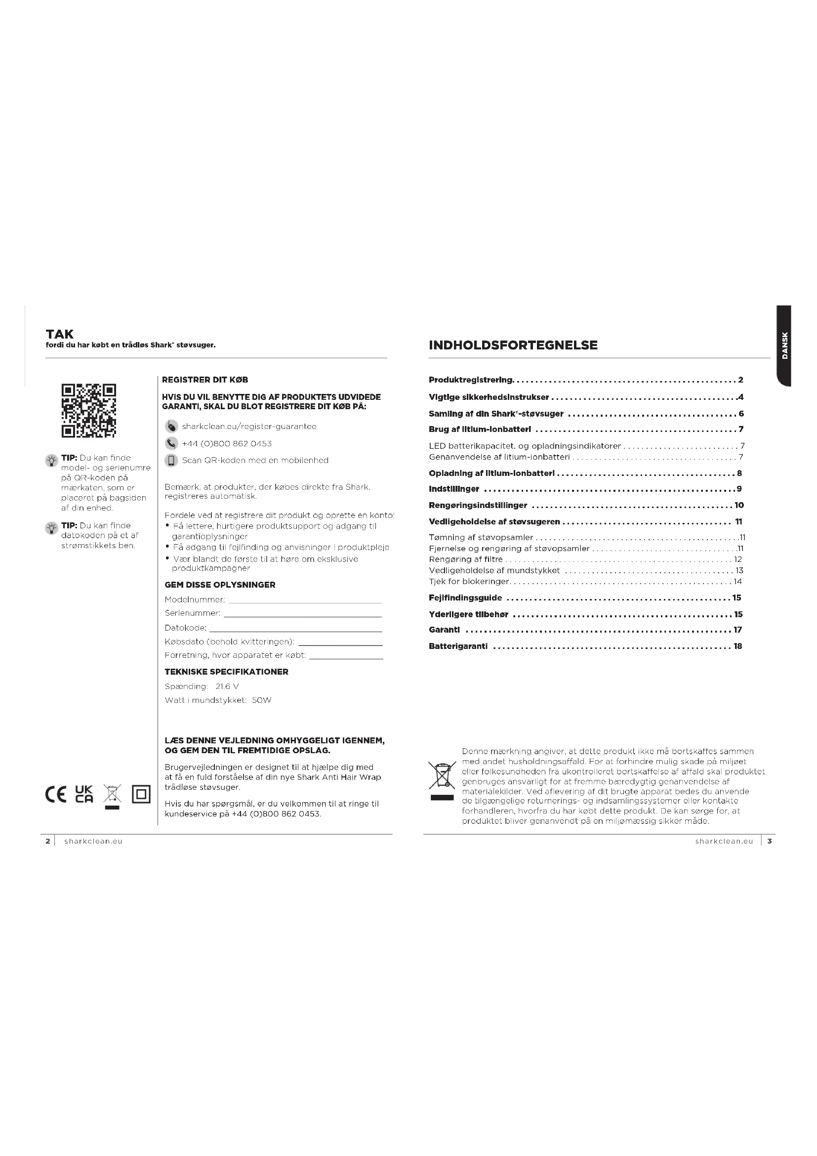 HVIS DU VIL BENYTTE DIG AF PRODUKTETS UDVIDEDE GARANTI, SKAL DU BLOT REGISTRERE DIT KØB PÅ: sharkclean.eu/register-guarantee +44 (0)800 862 0453 Scan QR-koden med en mobilenhed TAK fordi du har købt en trådløs Shark® støvsuger. LÆS DENNE VEJLEDNING OMHYGGELIGT IGENNEM, OG GEM DEN TIL FREMTIDIGE OPSLAG. Brugervejledningen er designet til at hjælpe dig med at få en fuld forståelse af din nye Shark Anti Hair Wrap trådløse støvsuger. Hvis du har spørgsmål, er du velkommen til at ringe til kundeservice på +44 (0)800 862 0453. Fordele ved at registrere dit produkt og oprette en konto: