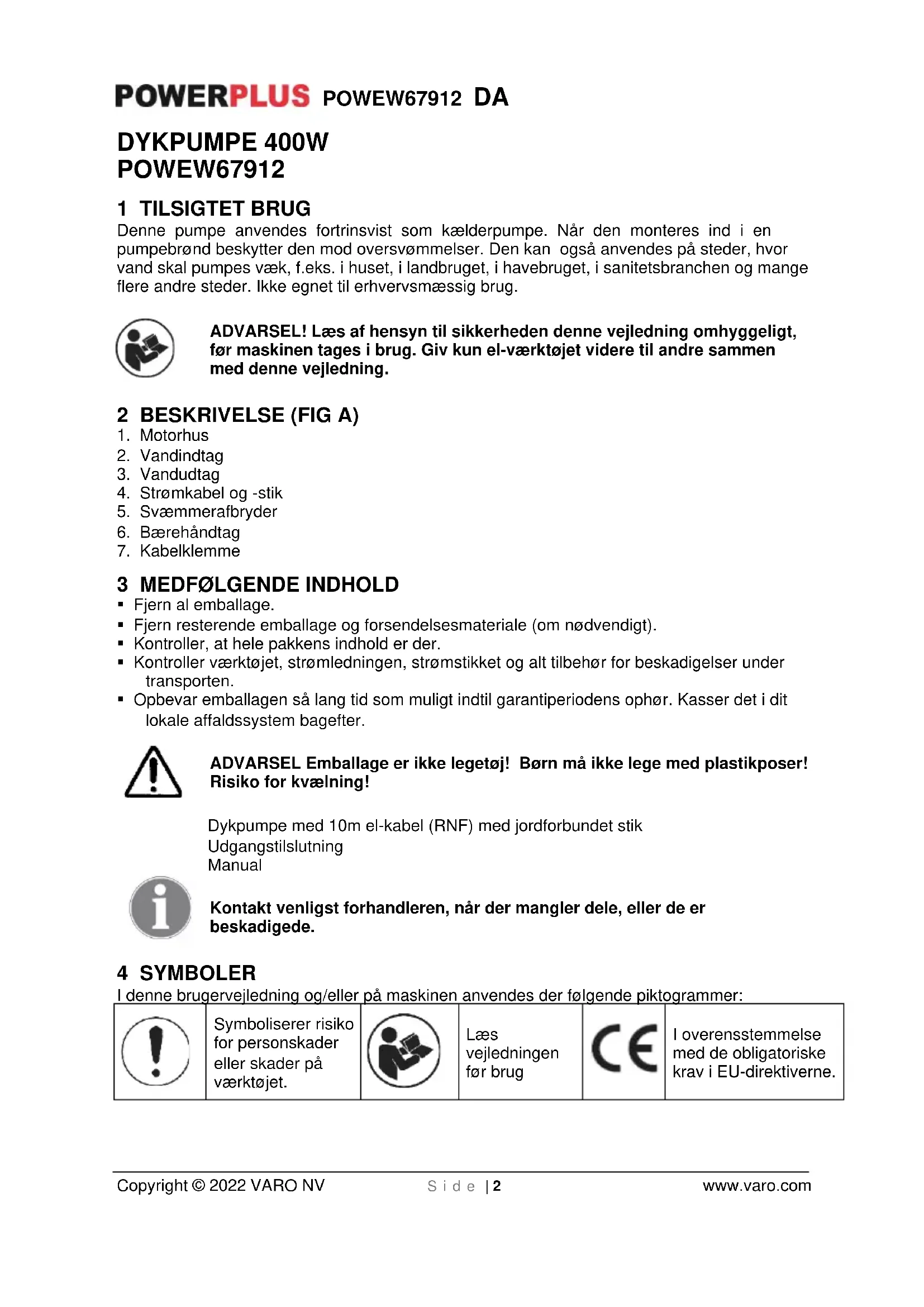 Copyright © 2022 VARO NV S i d e | 2 www.varo.com DYKPUMPE 400W POWEW67912 1 TILSIGTET BRUG Denne pumpe anvendes fortrinsvist som kælderpumpe. Når den monteres ind i en pumpebrønd beskytter den mod oversvømmelser. Den kan også anvendes på steder, hvor vand skal pumpes væk, f.eks. i huset, i landbruget, i havebruget, i sanitetsbranchen og mange flere andre steder. Ikke egnet til erhvervsmæssig brug. ADVARSEL! Læs af hensyn til sikkerheden denne vejledning omhyggeligt, før maskinen tages i brug. Giv kun el-værktøjet videre til andre sammen med denne vejledning. 2 BESKRIVELSE (FIG A)