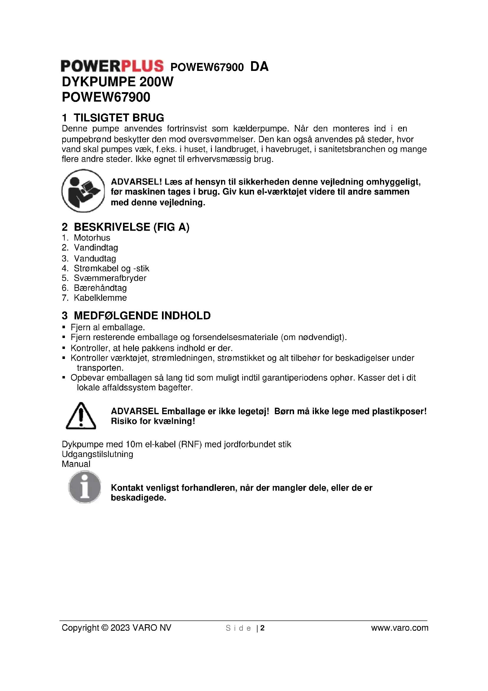 Copyright © 2023 VARO NV S i d e | 2 www.varo.com DYKPUMPE 200W POWEW67900 1 TILSIGTET BRUG Denne pumpe anvendes fortrinsvist som kælderpumpe. Når den monteres ind i en pumpebrønd beskytter den mod oversvømmelser. Den kan også anvendes på steder, hvor vand skal pumpes væk, f.eks. i huset, i landbruget, i havebruget, i sanitetsbranchen og mange flere andre steder. Ikke egnet til erhvervsmæssig brug. ADVARSEL! Læs af hensyn til sikkerheden denne vejledning omhyggeligt, før maskinen tages i brug. Giv kun el-værktøjet videre til andre sammen med denne vejledning. 2 BESKRIVELSE (FIG A)