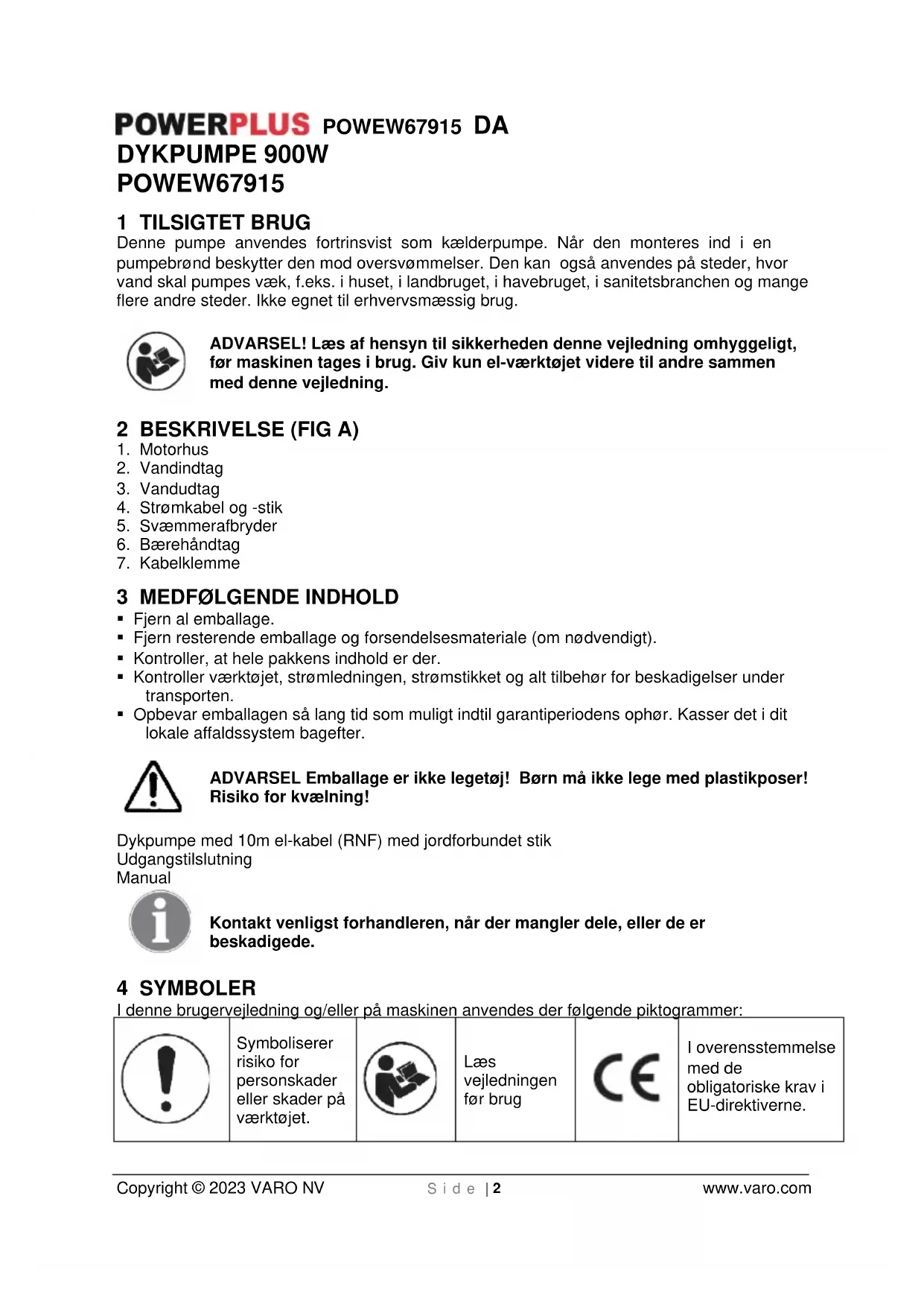 Copyright © 2023 VARO NV S i d e | 2 www.varo.com DYKPUMPE 900W POWEW67915 1 TILSIGTET BRUG Denne pumpe anvendes fortrinsvist som kælderpumpe. Når den monteres ind i en pumpebrønd beskytter den mod oversvømmelser. Den kan også anvendes på steder, hvor vand skal pumpes væk, f.eks. i huset, i landbruget, i havebruget, i sanitetsbranchen og mange flere andre steder. Ikke egnet til erhvervsmæssig brug. ADVARSEL! Læs af hensyn til sikkerheden denne vejledning omhyggeligt, før maskinen tages i brug. Giv kun el-værktøjet videre til andre sammen med denne vejledning. 2 BESKRIVELSE (FIG A)
