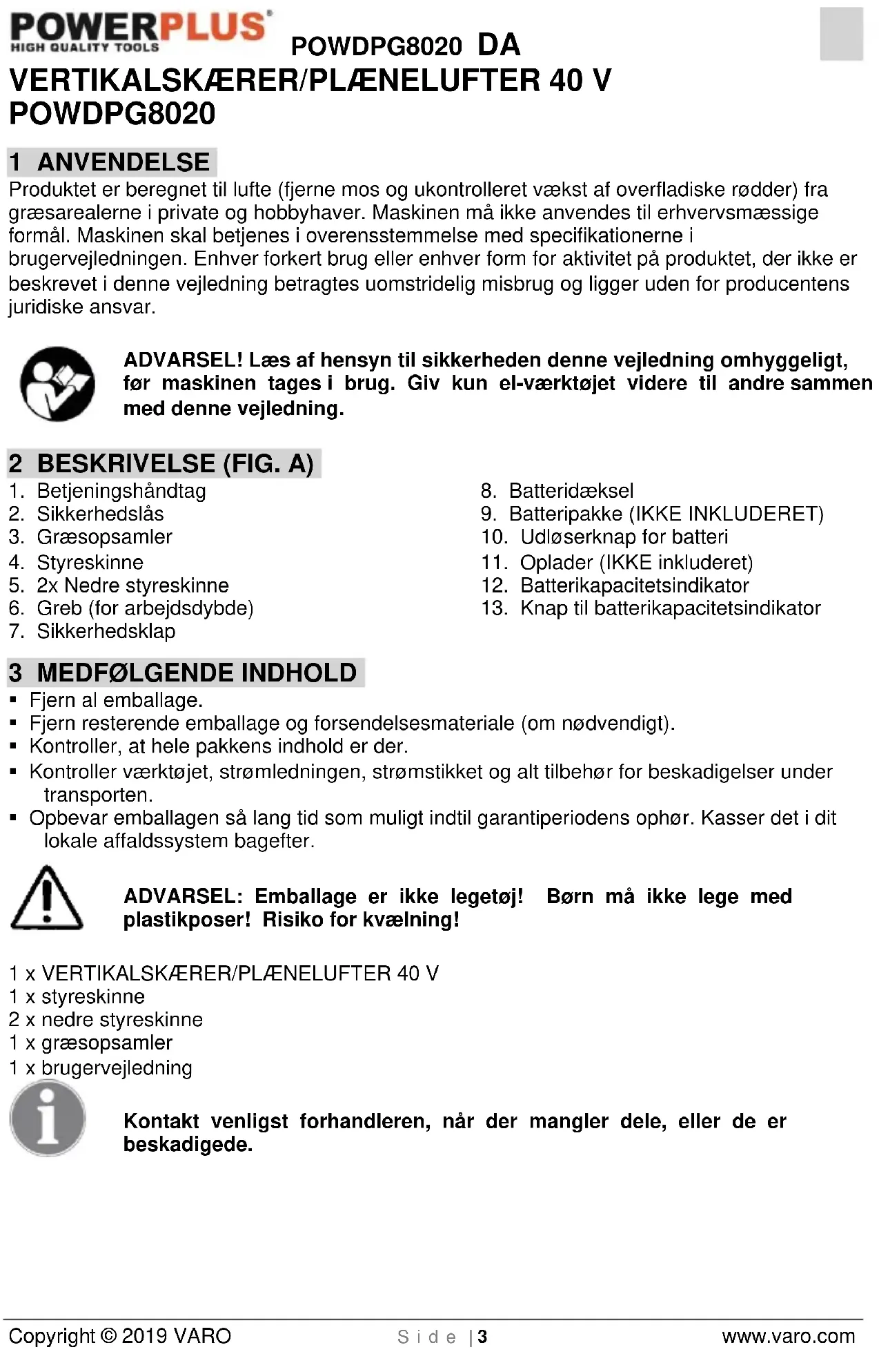 - Brug aldrig produktet, hvis sikkerhedsanordninger er beskadiget eller mangler, for eksempel uden sikkerhedsklap og/eller græsopsamler.POWDPG8020 DA Copyright © 2019 VARO S i d e | 7 www.varo.com