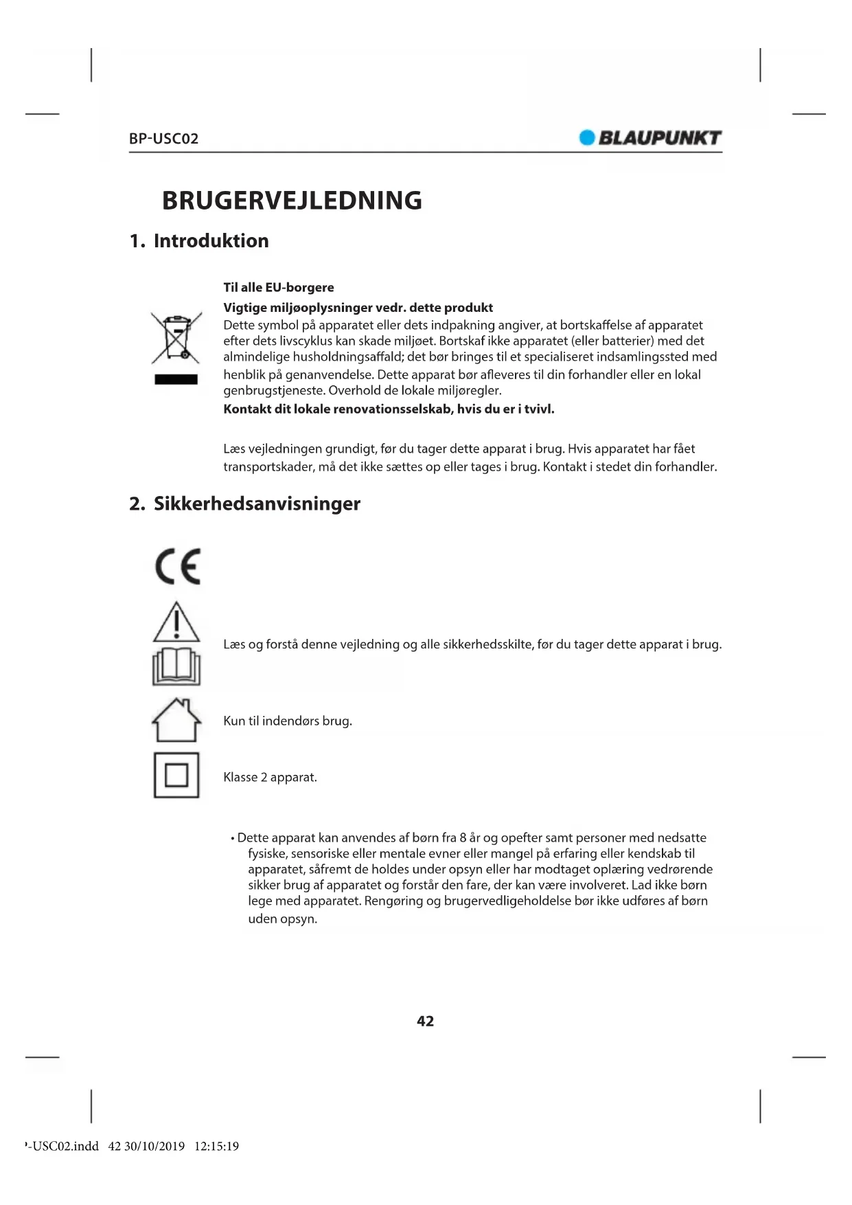 - Dette apparat kan anvendes af børn fra 8 år og opefter samt personer med nedsatte fysiske, sensoriske eller mentale evner eller mangel på erfaring eller kendskab til apparatet, såfremt de holdes under opsyn eller har modtaget oplæring vedrørende sikker brug af apparatet og forstår den fare, der kan være involveret. Lad ikke børn lege med apparatet. Rengøring og brugervedligeholdelse bør ikke udføres af børn uden opsyn. BP-USC02.indd 42 30/10/2019 12:15:19BP-USC02