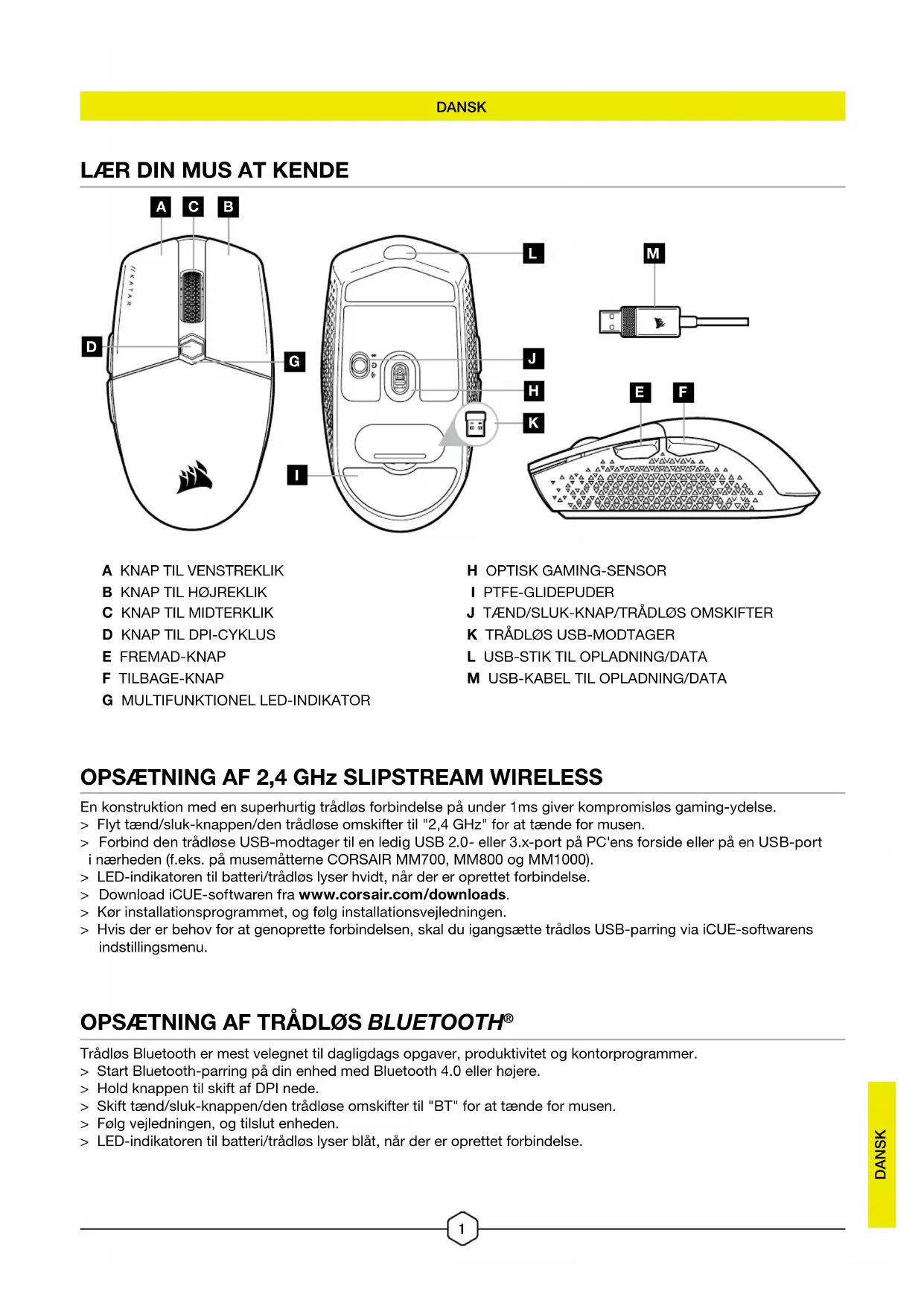 OPSÆTNING AF 2,4 GHz SLIPSTREAM WIRELESS En konstruktion med en superhurtig trådløs forbindelse på under 1ms giver kompromisløs gaming-ydelse. > Flyt tænd/sluk-knappen/den trådløse omskifter til "2,4 GHz" for at tænde for musen. > Forbind den trådløse USB-modtager til en ledig USB 2.0- eller 3.x-port på PC'ens forside eller på en USB-port i nærheden (f.eks. på musemåtterne CORSAIR MM700, MM800 og MM1000). > LED-indikatoren til batteri/trådløs lyser hvidt, når der er oprettet forbindelse. > Download iCUE-softwaren fra www.corsair.com/downloads. > Kør installationsprogrammet, og følg installationsvejledningen. > Hvis der er behov for at genoprette forbindelsen, skal du igangsætte trådløs USB-parring via iCUE-softwarens indstillingsmenu. OPSÆTNING AF TRÅDLØS BLUETOOTH