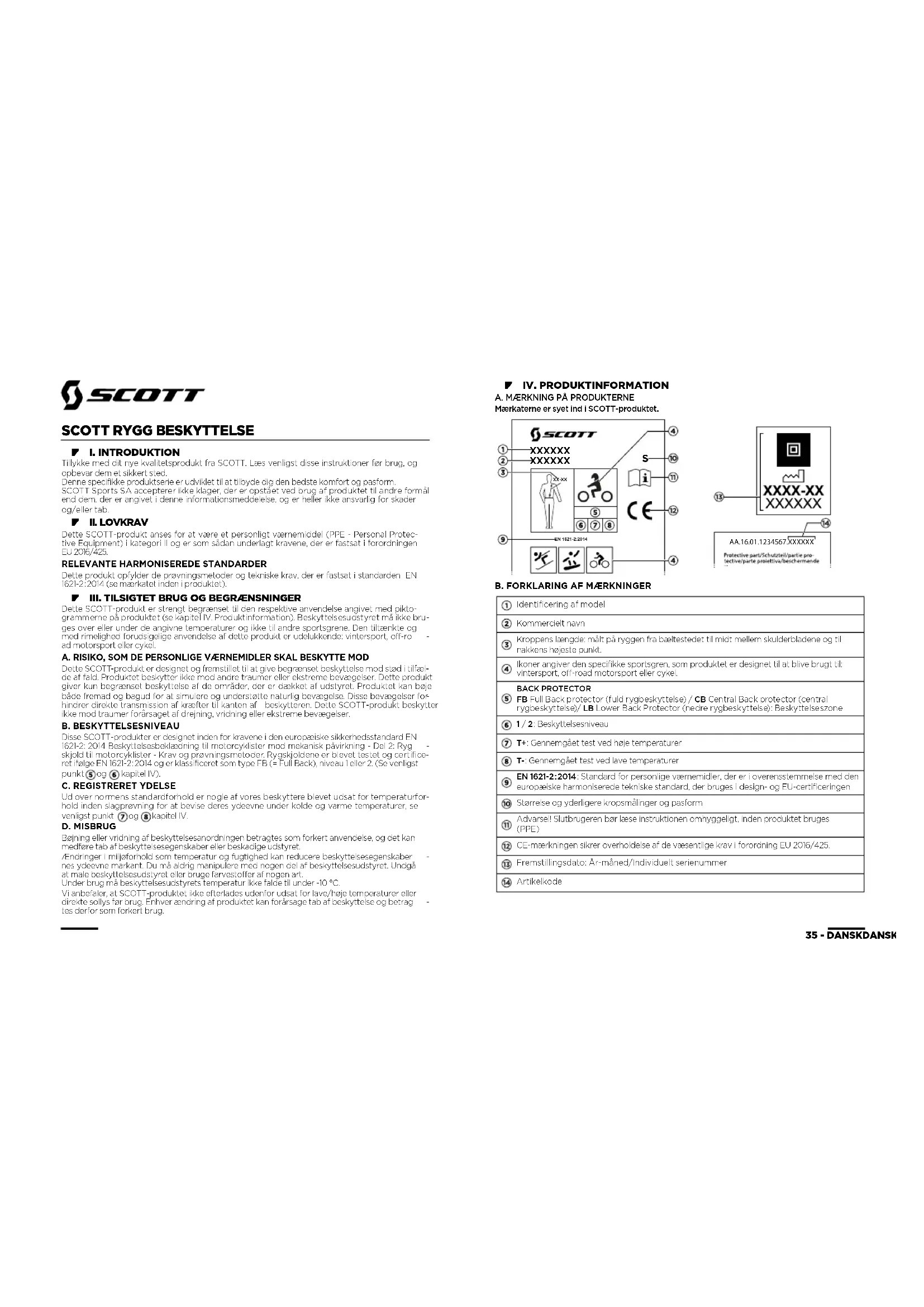 - III. TILSIGTET BRUG OG BEGRÆNSNINGER Dette SCOTT-produkt er strengt begrænset til den respektive anvendelse angivet med pikto- grammerne på produktet (se kapitel IV. Produktinformation). Beskyttelsesudstyret må ikke bru- ges over eller under de angivne temperaturer og ikke til andre sportsgrene. Den tiltænkte og med rimelighed forudsigelige anvendelse af dette produkt er udelukkende: vintersport, off-ro ad motorsport eller cykel. A. RISIKO, SOM DE PERSONLIGE VÆRNEMIDLER SKAL BESKYTTE MOD Dette SCOTT-produkt er designet og fremstillet til at give begrænset beskyttelse mod stød i tilfæl- de af fald. Produktet beskytter ikke mod andre traumer eller ekstreme bevægelser. Dette produkt giver kun begrænset beskyttelse af de områder, der er dækket af udstyret. Produktet kan bøje både fremad og bagud for at simulere og understøtte naturlig bevægelse. Disse bevægelser for hindrer direkte transmission af kræfter til kanten af beskytteren. Dette SCOTT-produkt beskytter ikke mod traumer forårsaget af drejning, vridning eller ekstreme bevægelser. B. BESKYTTELSESNIVEAU Disse SCOTT-produkter er designet inden for kravene i den europæiske sikkerhedsstandard EN 1621-2: 2014 Beskyttelsesbeklædning til motorcyklister mod mekanisk påvirkning - Del 2: Ryg