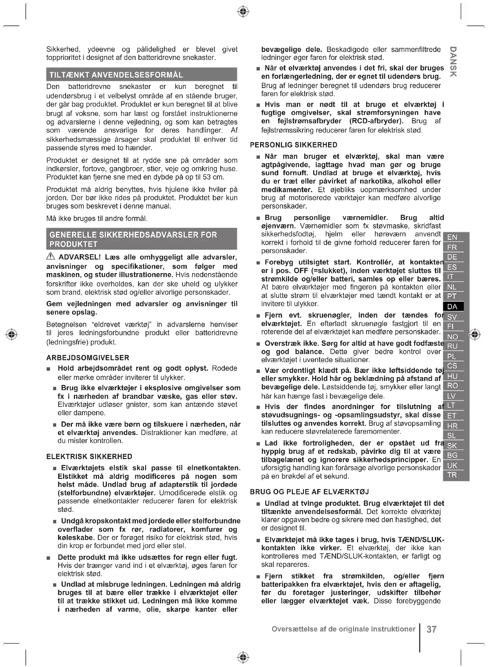 Den batteridrevne snekaster er kun beregnet til udendørsbrug i et velbelyst område af en stående bruger, der går bag produktet. Produktet er kun beregnet til at blive brugt af voksne, som har læst og forstået instruktionerne og advarslerne i denne vejledning, og som kan betragtes som værende ansvarlige for deres handlinger. Af sikkerhedsmæssige årsager skal produktet til enhver tid passende styres med to hænder. Produktet er designet til at rydde sne på områder som indkørsler, fortove, gangbroer, stier, veje og omkring huse. Produktet kan fjerne sne med en dybde på op til 53 cm. Produktet må aldrig benyttes, hvis hjulene ikke hviler på jorden. Der bør ikke rides på produktet. Produktet bør kun bruges som beskrevet i denne manual. Må ikke bruges til andre formål.