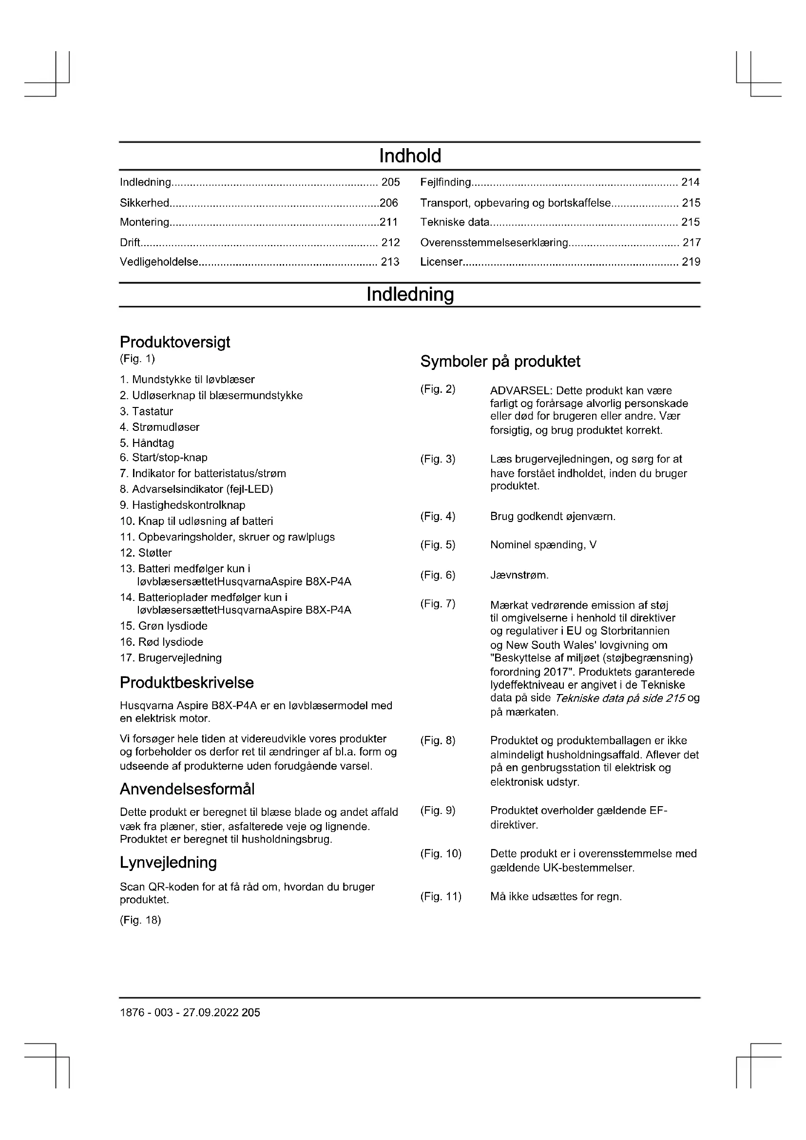 på mærkaten. (Fig. 8) Produktet og produktemballagen er ikke almindeligt husholdningsaffald. Aflever det på en genbrugsstation til elektrisk og elektronisk udstyr. (Fig. 9) Produktet overholder gældende EF- direktiver. (Fig. 10) Dette produkt er i overensstemmelse med gældende UK-bestemmelser. (Fig. 11) Må ikke udsættes for regn. 1876 - 003 - 27.09.2022 205(Fig. 15) Føreren af løvblæseren skal sørge for, at ingen mennesker eller dyr kom- mer nærmere end 15 meter. Når flere førere arbejder på det samme sted, skal sikkerhedsafstanden være mindst 15 meter. Løvblæseren kan kaste gen- stande af sted med voldsom kraft, og disse genstande kan slå tilbage. Det- te kan medføre alvorlige øjenskader, hvis du ikke anvender det anbefalede beskyttelsesudstyr. yyyy wwxxxxx Typeskiltet viser serienummeret. yyyy er produktionsåret, ww er produktions- ugen. Bemærk: Andre symboler/etiketter på produktet refererer til specifikke krav for certificering på visse markeder. Symboler på batteriet og/eller på batteriopladeren (Fig. 16) Aflever produktet på en genbrugsstation for elektrisk og elek- tronisk udstyr. (Gæl- der kun Europa) (Fig. 17) Brug kun batteriet i produkter fra POWER FOR ALL-systempart- nere. (Fig. 12) Fejlsikker transformer. (Fig. 13) Brug og opbevar kun batteriopladeren indendørs. (Fig. 14) Dobbelt isolering. Produktansvar Som nævnt i produktansvarsbestemmelserne hæfter vi ikke for skader forårsaget af vores produkt, hvis: