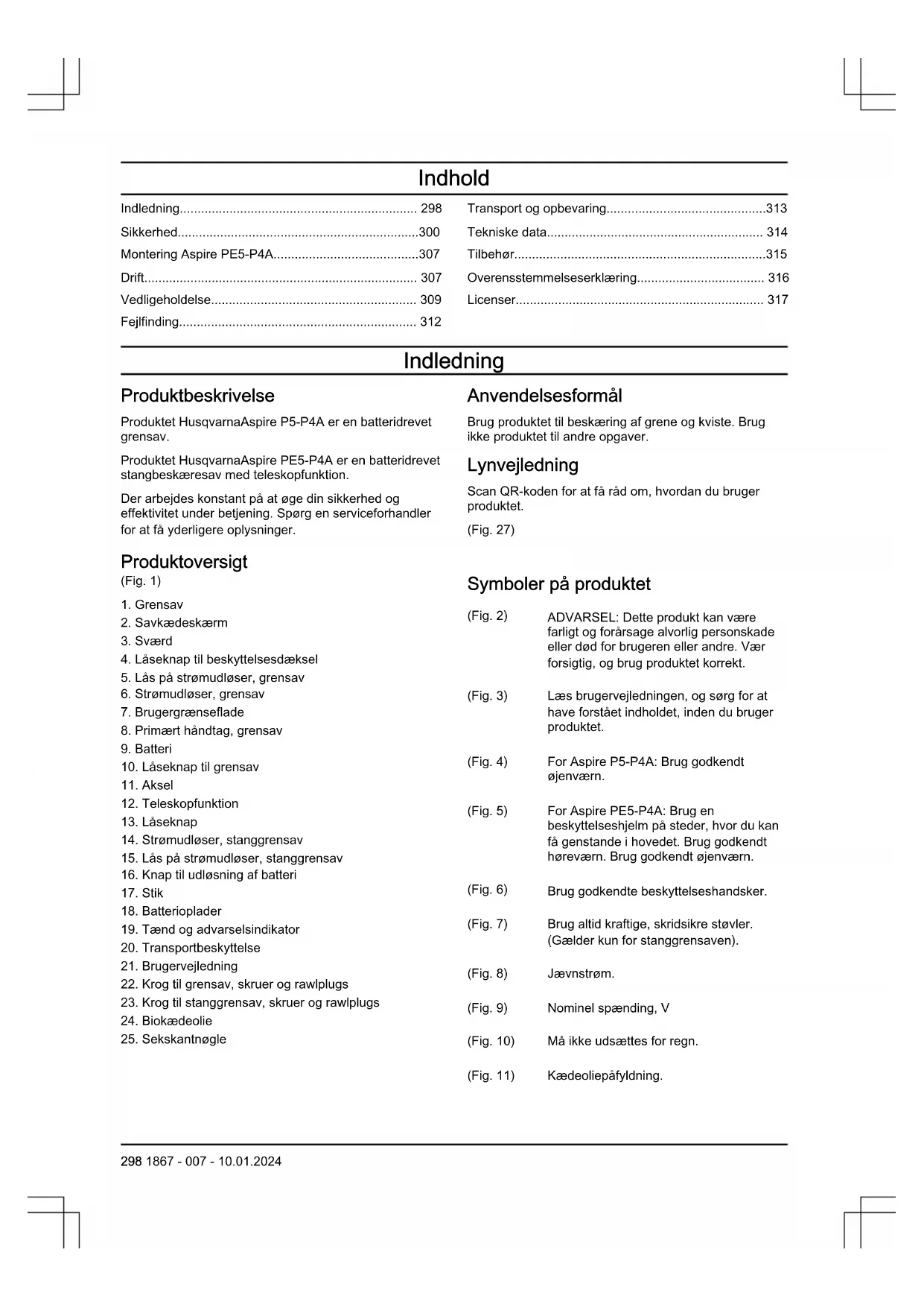 Symboler på produktet (Fig. 2) ADVARSEL: Dette produkt kan være farligt og forårsage alvorlig personskade eller død for brugeren eller andre. Vær forsigtig, og brug produktet korrekt. (Fig. 3) Læs brugervejledningen, og sørg for at have forstået indholdet, inden du bruger produktet. (Fig. 4) For Aspire P5-P4A: Brug godkendt øjenværn. (Fig. 5) For Aspire PE5-P4A: Brug en beskyttelseshjelm på steder, hvor du kan få genstande i hovedet. Brug godkendt høreværn. Brug godkendt øjenværn. (Fig. 6) Brug godkendte beskyttelseshandsker. (Fig. 7) Brug altid kraftige, skridsikre støvler. (Gælder kun for stanggrensaven). (Fig. 8) Jævnstrøm. (Fig. 9) Nominel spænding, V (Fig. 10) Må ikke udsættes for regn. (Fig. 11) Kædeoliepåfyldning. 298 1867 - 007 - 10.01.2024(Fig. 12) Savkædens rotationsretning. (Fig. 13) Risiko for personskade. Hold hænderne væk fra savkæden. (Fig. 14) Drej grebet til venstre for at løsne, drej grebet til højre for at spænde. (Fig. 15) Produktet overholder gældende EU- direktiver. (Fig. 16) Dette produkt er i overensstemmelse med gældende UK-bestemmelser. (Fig. 17) Mærkat vedrørende emission af støj til omgivelserne i henhold til direktiver og regulativer i EU og Storbritannien og New South Wales' lovgivning om "Beskyttelse af miljøet (støjbegrænsning) forordning 2017". Produktets garanterede lydeffektniveau er angivet i de Tekniske data på side Tekniske data på side 314