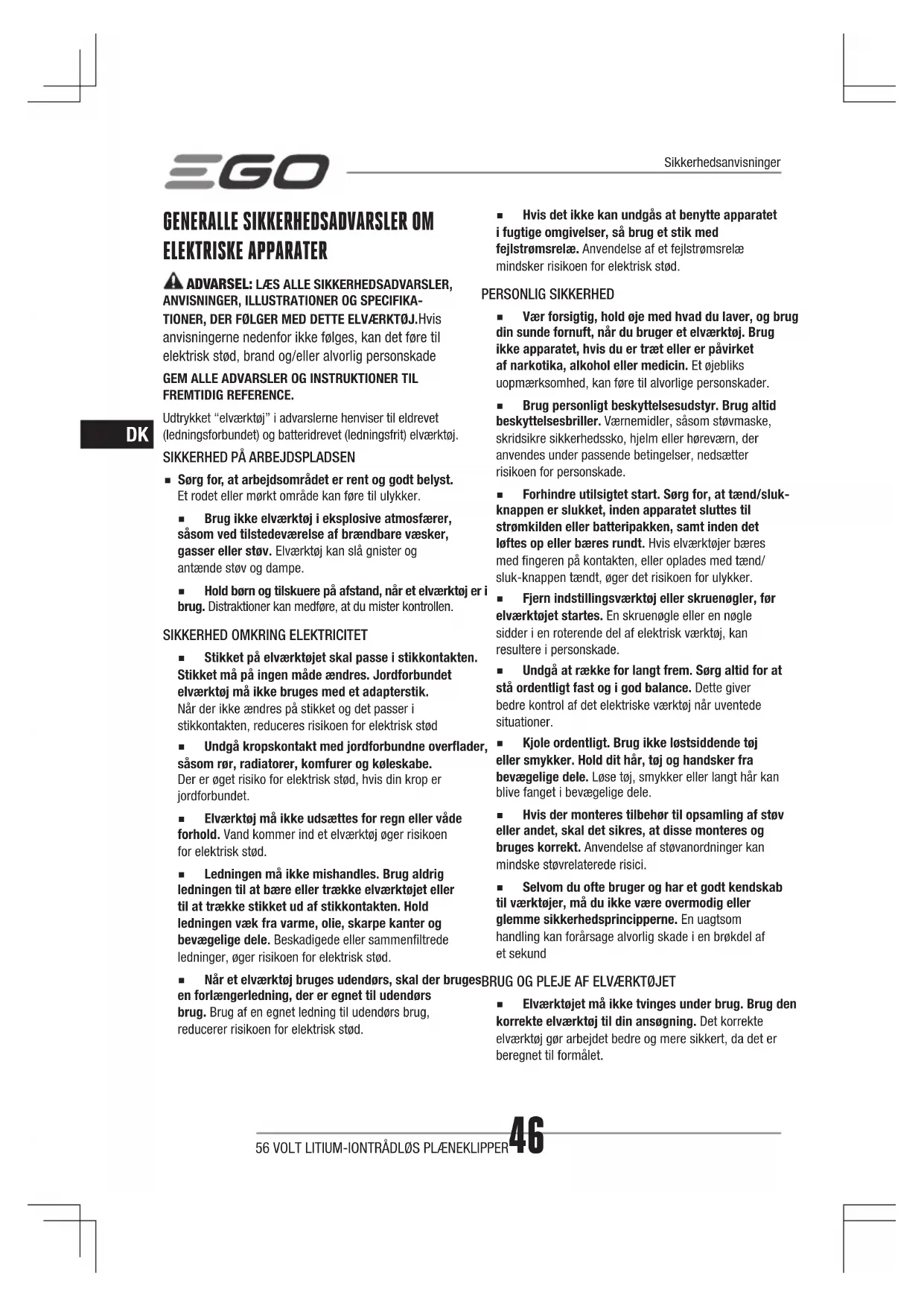 ◾ Stikket på elværktøjet skal passe i stikkontakten. Stikket må på ingen måde ændres. Jordforbundet elværktøj må ikke bruges med et adapterstik. Når der ikke ændres på stikket og det passer i stikkontakten, reduceres risikoen for elektrisk stød ◾ Undgå kropskontakt med jordforbundne overader, såsom rør, radiatorer, komfurer og køleskabe. Der er øget risiko for elektrisk stød, hvis din krop er jordforbundet. ◾ Elværktøj må ikke udsættes for regn eller våde forhold. Vand kommer ind et elværktøj øger risikoen for elektrisk stød. ◾ Ledningen må ikke mishandles. Brug aldrig ledningen til at bære eller trække elværktøjet eller til at trække stikket ud af stikkontakten. Hold ledningen væk fra varme, olie, skarpe kanter og bevægelige dele. Beskadigede eller sammenfiltrede ledninger, øger risikoen for elektrisk stød. ◾ Når et elværktøj bruges udendørs, skal der bruges en forlængerledning, der er egnet til udendørs brug. Brug af en egnet ledning til udendørs brug, reducerer risikoen for elektrisk stød. ◾ Hvis det ikke kan undgås at benytte apparatet i fugtige omgivelser, så brug et stik med fejlstrømsrelæ. Anvendelse af et fejlstrømsrelæ mindsker risikoen for elektrisk stød. PERSONLIG SIKKERHED ◾ Vær forsigtig, hold øje med hvad du laver, og brug din sunde fornuft, når du bruger et elværktøj. Brug ikke apparatet, hvis du er træt eller er påvirket af narkotika, alkohol eller medicin. Et øjebliks uopmærksomhed, kan føre til alvorlige personskader. ◾ Brug personligt beskyttelsesudstyr. Brug altid beskyttelsesbriller. Værnemidler, såsom støvmaske, skridsikre sikkerhedssko, hjelm eller høreværn, der anvendes under passende betingelser, nedsætter risikoen for personskade. ◾ Forhindre utilsigtet start. Sørg for, at tænd/sluk- knappen er slukket, inden apparatet sluttes til strømkilden eller batteripakken, samt inden det løftes op eller bæres rundt. Hvis elværktøjer bæres med fingeren på kontakten, eller oplades med tænd/sluk-knappen tændt, øger det risikoen for ulykker. ◾ Fjern indstillingsværktøj eller skruenøgler, før elværktøjet startes. En skruenøgle eller en nøgle sidder i en roterende del af elektrisk værktøj, kan resultere i personskade. ◾ Undgå at række for langt frem. Sørg altid for at stå ordentligt fast og i god balance. Dette giver bedre kontrol af det elektriske værktøj når uventede situationer. ◾ Kjole ordentligt. Brug ikke løstsiddende tøj eller smykker. Hold dit hår, tøj og handsker fra bevægelige dele. Løse tøj, smykker eller langt hår kan blive fanget i bevægelige dele. ◾ Hvis der monteres tilbehør til opsamling af støv eller andet, skal det sikres, at disse monteres og bruges korrekt. Anvendelse af støvanordninger kan mindske støvrelaterede risici. ◾ Selvom du ofte bruger og har et godt kendskab til værktøjer, må du ikke være overmodig eller glemme sikkerhedsprincipperne. En uagtsom handling kan forårsage alvorlig skade i en brøkdel af et sekund BRUG OG PLEJE AF ELVÆRKTØJET ◾ Elværktøjet må ikke tvinges under brug. Brug den korrekte elværktøj til din ansøgning. Det korrekte elværktøj gør arbejdet bedre og mere sikkert, da det er beregnet til formålet.Sikkerhedsanvisninger56 VOLT LITIUM-IONTRÅDLØS PLÆNEKLIPPER