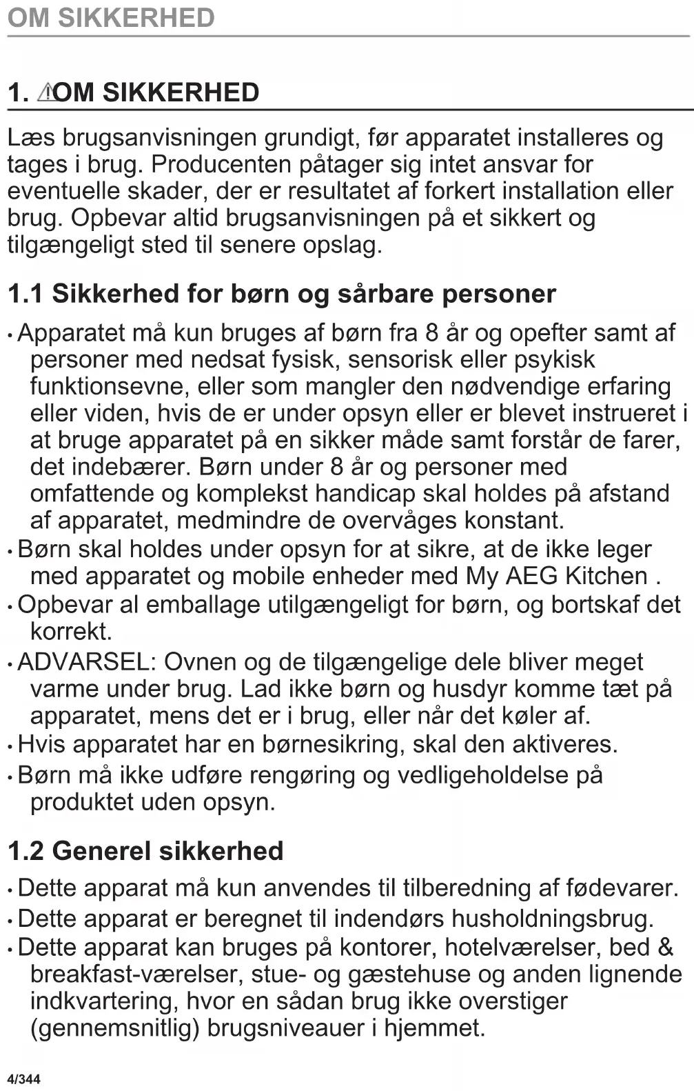 - Børn skal holdes under opsyn for at sikre, at de ikke leger med apparatet og mobile enheder med My AEG Kitchen .