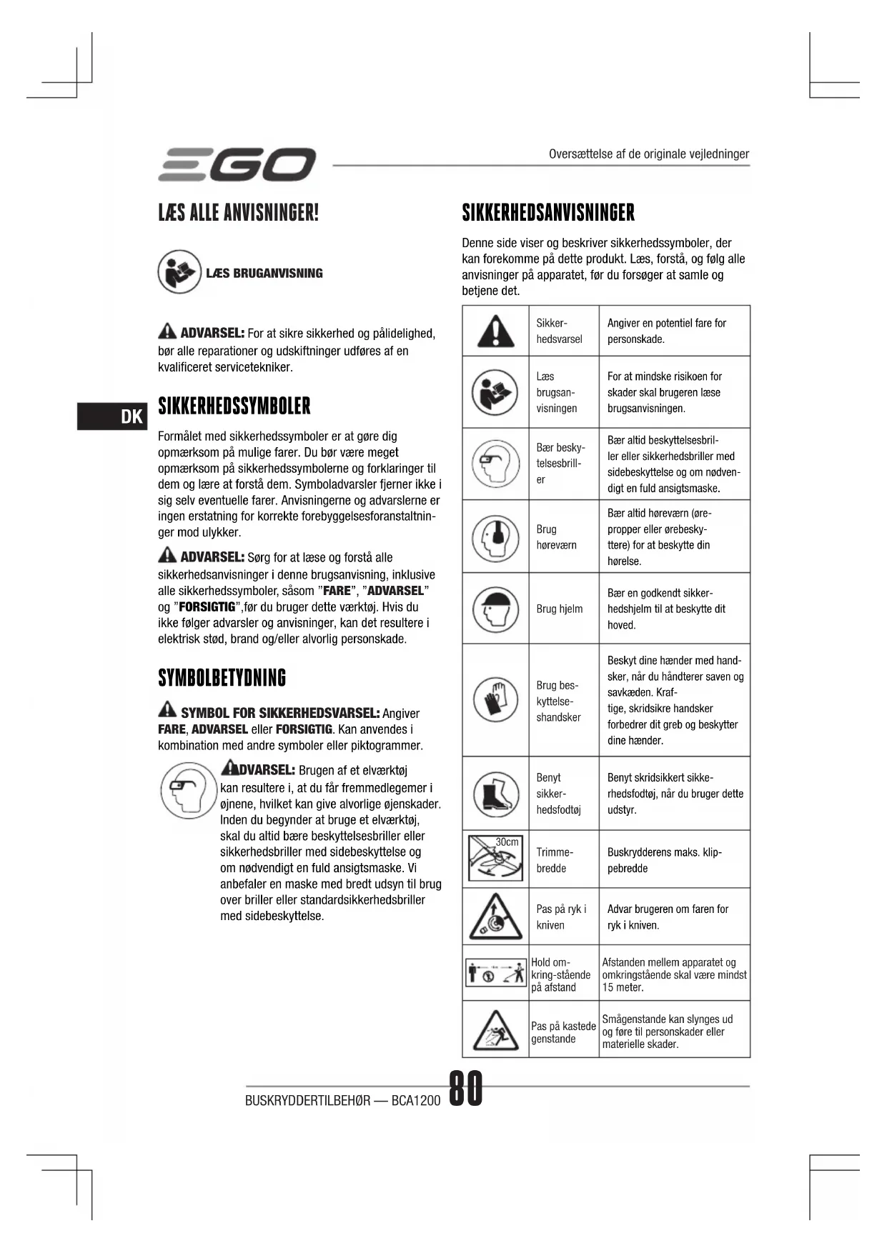 ADVARSEL: For at sikre sikkerhed og pålidelighed, bør alle reparationer og udskiftninger udføres af en kvaliceret servicetekniker. SIKKERHEDSSYMBOLER Formålet med sikkerhedssymboler er at gøre dig opmærksom på mulige farer. Du bør være meget opmærksom på sikkerhedssymbolerne og forklaringer til dem og lære at forstå dem. Symboladvarsler fjerner ikke i sig selv eventuelle farer. Anvisningerne og advarslerne er ingen erstatning for korrekte forebyggelsesforanstaltnin- ger mod ulykker. ADVARSEL: Sørg for at læse og forstå alle sikkerhedsanvisninger i denne brugsanvisning, inklusive alle sikkerhedssymboler, såsom ”FARE”, ”ADVARSEL” og ”FORSIGTIG”,før du bruger dette værktøj. Hvis du ikke følger advarsler og anvisninger, kan det resultere i elektrisk stød, brand og/eller alvorlig personskade. SYMBOLBETYDNING SYMBOL FOR SIKKERHEDSVARSEL: Angiver FARE, ADVARSEL eller FORSIGTIG. Kan anvendes i kombination med andre symboler eller piktogrammer. ADVARSEL: Brugen af et elværktøj kan resultere i, at du får fremmedlegemer i øjnene, hvilket kan give alvorlige øjenskader. Inden du begynder at bruge et elværktøj, skal du altid bære beskyttelsesbriller eller sikkerhedsbriller med sidebeskyttelse og om nødvendigt en fuld ansigtsmaske. Vi anbefaler en maske med bredt udsyn til brug over briller eller standardsikkerhedsbriller med sidebeskyttelse. SIKKERHEDSANVISNINGER Denne side viser og beskriver sikkerhedssymboler, der kan forekomme på dette produkt. Læs, forstå, og følg alle anvisninger på apparatet, før du forsøger at samle og betjene det. Sikker- hedsvarselAngiver en potentiel fare for personskade. Læs brugsan- visningenFor at mindske risikoen for skader skal brugeren læse brugsanvisningen.Bær besky- telsesbrill- Bær altid beskyttelsesbril- ler eller sikkerhedsbriller med sidebeskyttelse og om nødven-digt en fuld ansigtsmaske.Brug høreværnBær altid høreværn (øre- propper eller ørebesky- ttere) for at beskytte din hørelse.Brug hjelmBær en godkendt sikker- hedshjelm til at beskytte dit hoved.Brug bes- kyttelse- shandskerBeskyt dine hænder med hand-sker, når du håndterer saven og savkæden. Kraf- tige, skridsikre handsker forbedrer dit greb og beskytter dine hænder.Benyt sikker- hedsfodtøjBenyt skridsikkert sikke- rhedsfodtøj, når du bruger dette udstyr. 30cm Trimme- breddeBuskrydderens maks. klip-pebreddePas på ryk i knivenAdvar brugeren om faren for ryk i kniven. Hold om-kring-stående på afstandAfstanden mellem apparatet og omkringstående skal være mindst 15 meter.Pas på kastede genstandeSmågenstande kan slynges ud og føre til personskader eller materielle skader. Oversættelse af de originale vejledningerBUSKRYDDERTILBEHØR — BCA1200 81