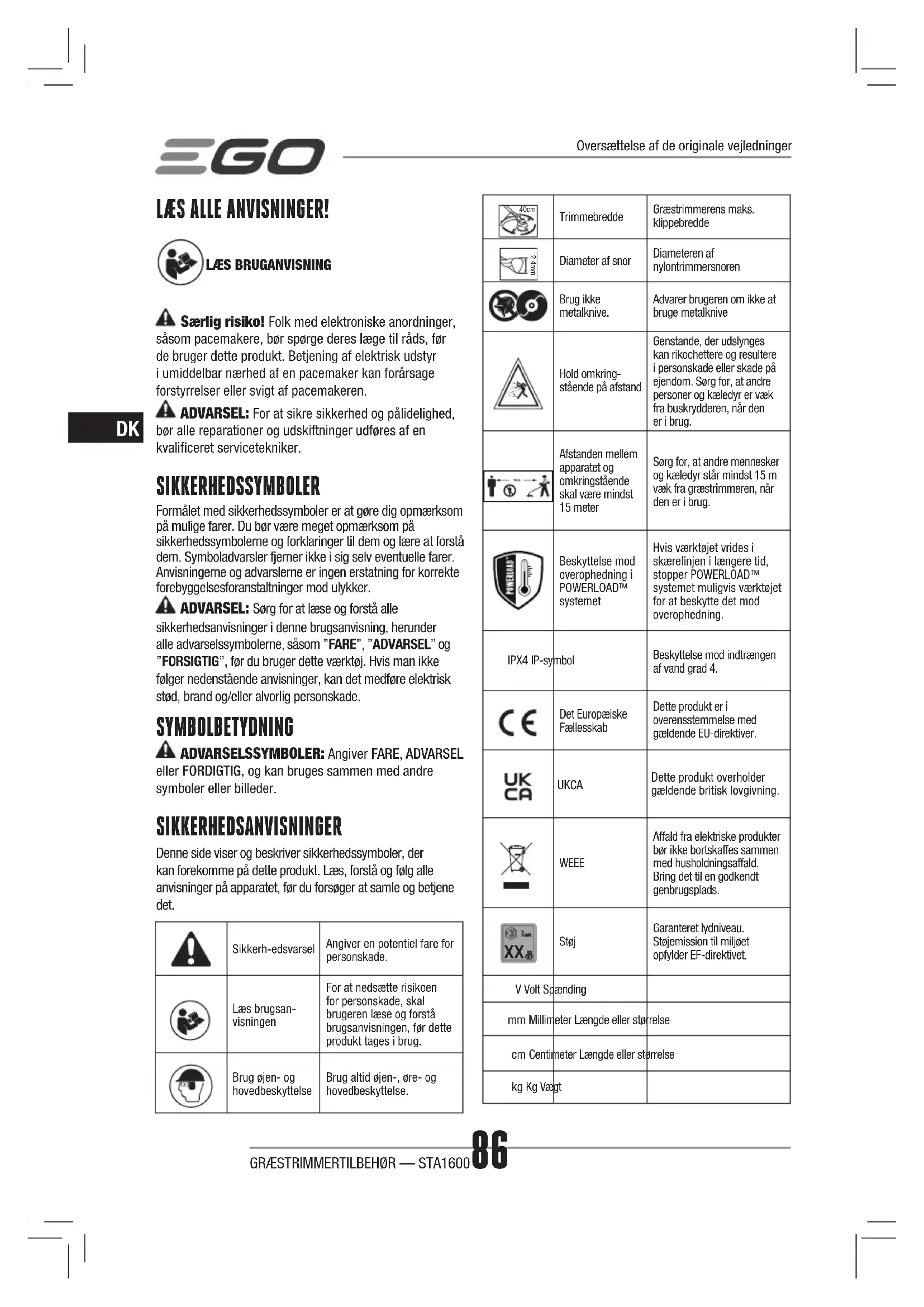systemet muligvis værktøjet for at beskytte det mod overophedning. ◾ Vent, indtil værktøjet har kølet ned, hvorefter det kan startes igen. GARANTI EGO’s GARANTIPOLITIK Besøg venligst hjemmesiden egopowerplus.eu for fuldstændige vilkår og betingelser for EGO’s garantipolitik.TILLBEHÖR FÖR KANTTRIMMER — STA1600 97