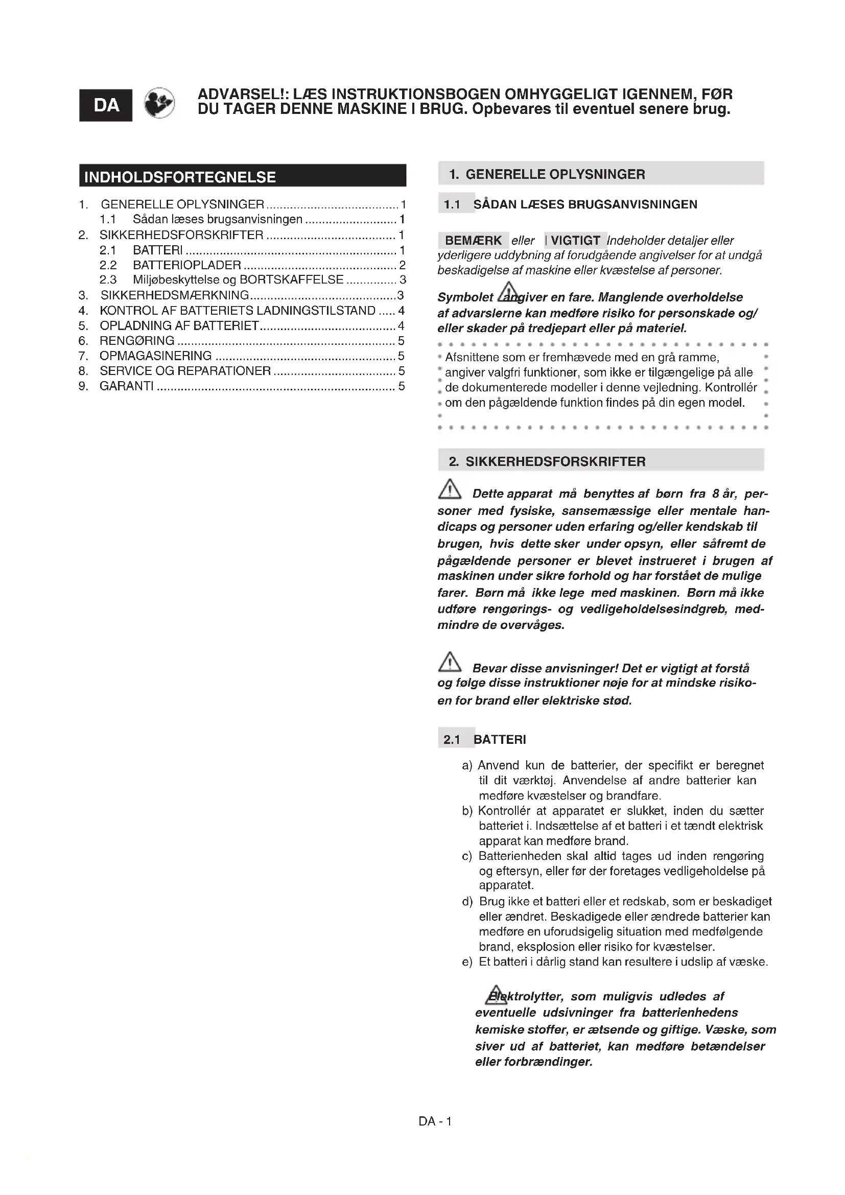 Battery / Batterioplader - BRUGSANVISNING ADVARSEL: læs instruktionsbogen omhyggeligt igennem, før du tager denne maskine i brug.