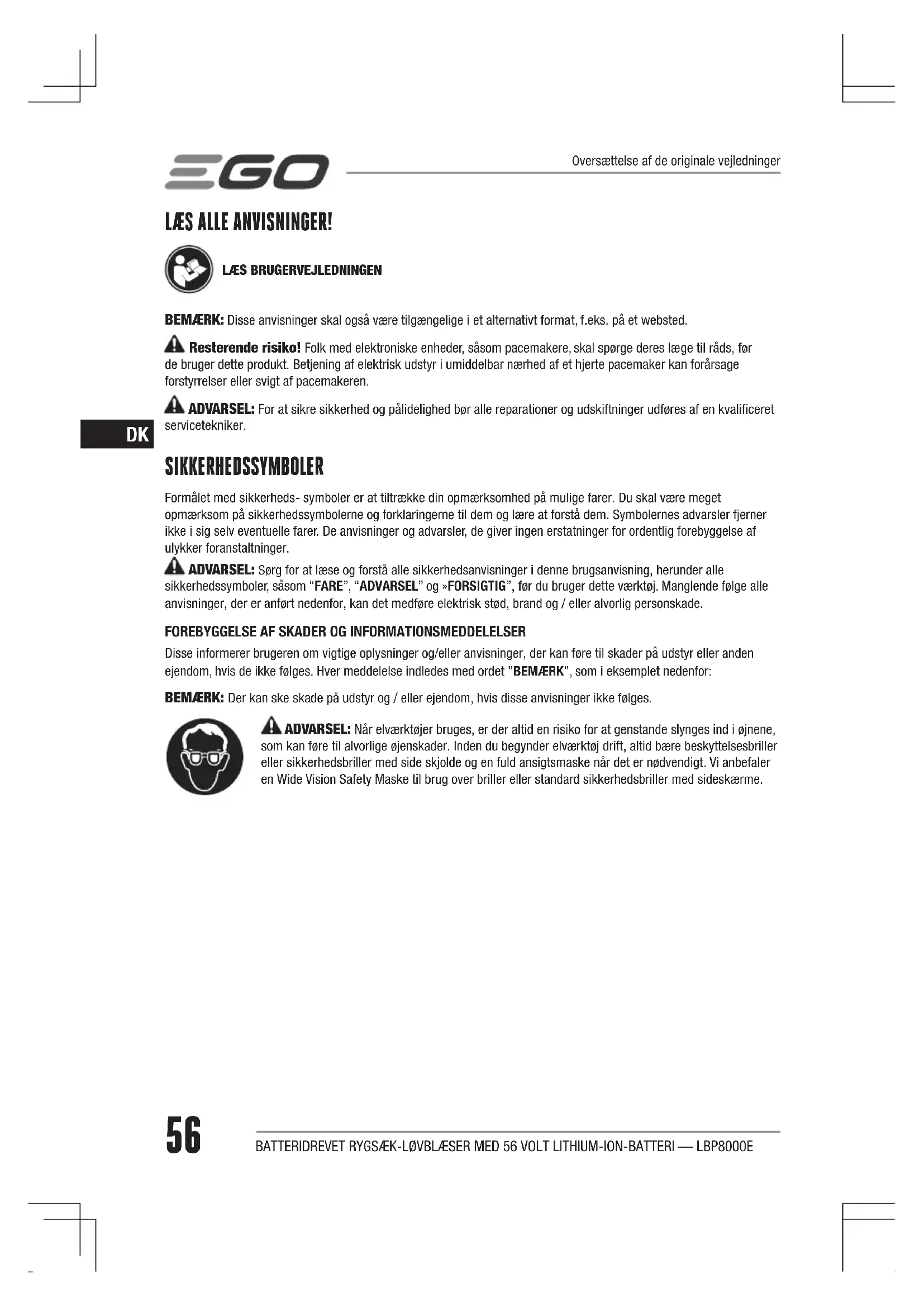 BATTERIDREVET RYGSÆK-LØVBLÆSER MED 56 VOLT LITHIUM-ION-BATTERI — LBP8000E SIKKERHEDSANVISNINGER Denne side viser og beskriver sikkerhedssymboler, der kan være på dette produkt. Læs, forstå og følg alle anvisninger på maskinen, før du forsøger at samle og betjene. Sikkerhedsadvarsel Bær altid beskyttelsesbriller eller sikkerhedsbriller med side skjolde og en fuld ansigtsskærm, når du betjener dette produkt. Bær altid høreværn ved betjening af dette produkt. For at mindske risikoen for skade skal brugeren læse brugervejledningen, inden produktet tages i brug. Hold alle omkringstående mindst 15m væk. Dette produkt er i overensstemmelse med gældende EU-direktiver. Dette produkt er i overensstemmelse med lovgivningen i Storbritannien. Elektriske affaldsprodukter må ikke bortskaffes sammen med husholdningsaffald. Tag det til en godkendt genbrugsplads. V Volt A Ampere Hz Hertz W Watt min Minutter m