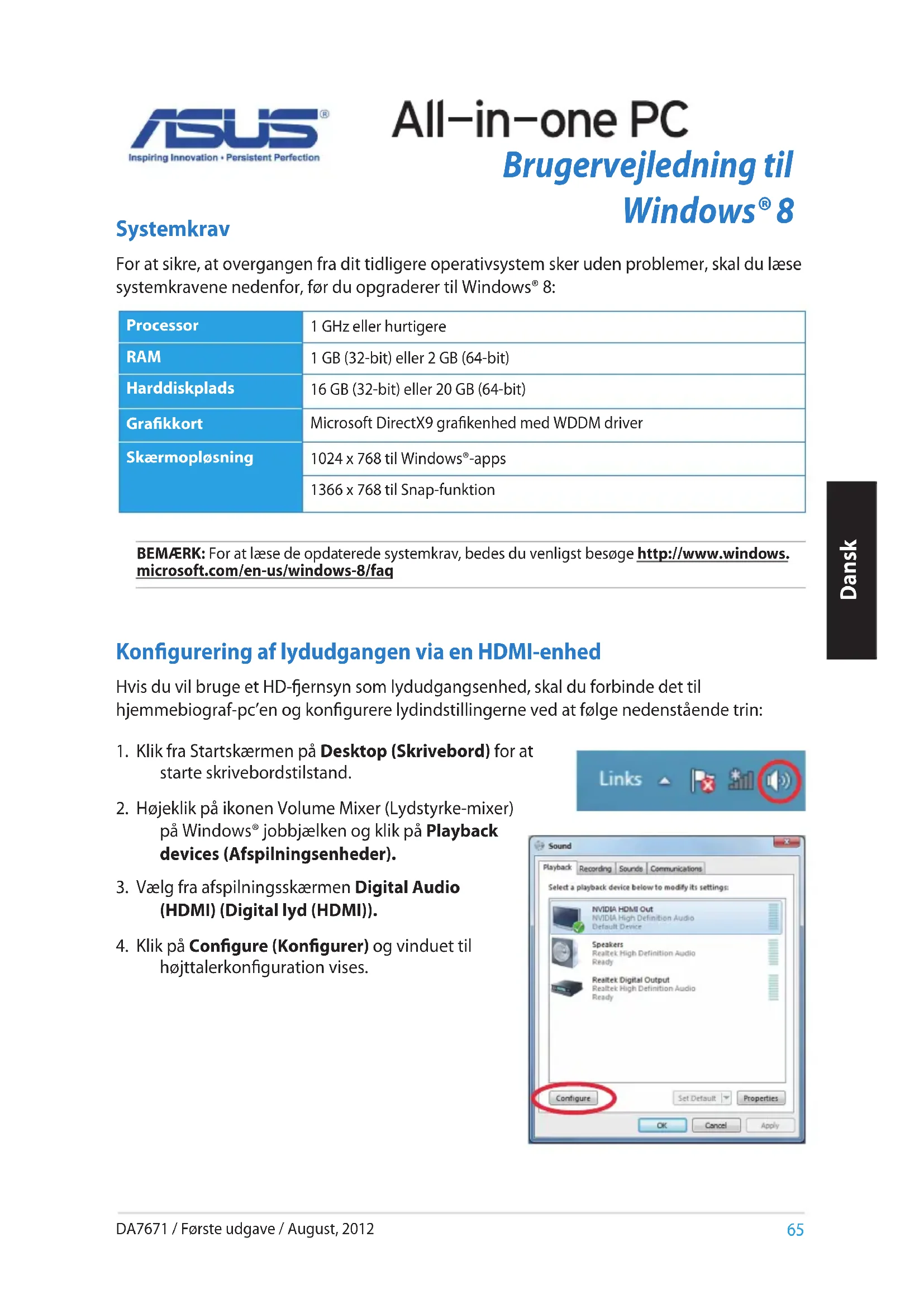Čeština POZN.: Tuto příručku si můžete stáhnout ve více jazycích z webu podpory ASUS na adrese http://support.asus.com65 Brugervejledning til Windows® 8 BEMÆRK: For at læse de opdaterede systemkrav, bedes du venligst besøge http://www.windows. microsoft.com/en-us/windows-8/faq Processor 1 GHz eller hurtigere RAM 1 GB (32-bit) eller 2 GB (64-bit) Harddiskplads 16 GB (32-bit) eller 20 GB (64-bit) Grakkort Microsoft DirectX9 grakenhed med WDDM driver Skærmopløsning 1024 x 768 til Windows®-apps 1366 x 768 til Snap-funktion Systemkrav For at sikre, at overgangen fra dit tidligere operativsystem sker uden problemer, skal du læse systemkravene nedenfor, før du opgraderer til Windows® 8: Kongurering af lydudgangen via en HDMI-enhed Hvis du vil bruge et HD-ernsyn som lydudgangsenhed, skal du forbinde det til hjemmebiograf-pc’en og kongurere lydindstillingerne ved at følge nedenstående trin: