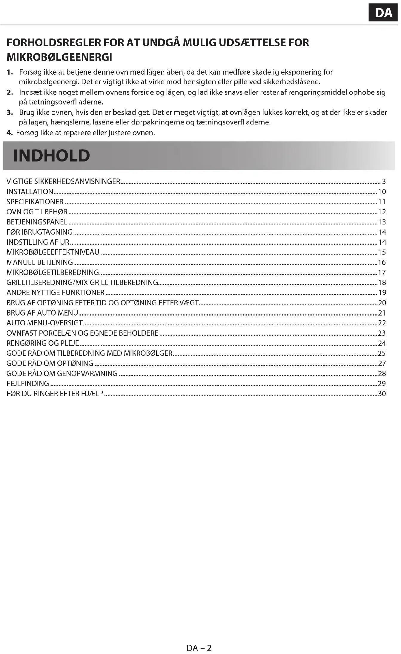- på lågen, hængslerne, låsene eller dørpakningerne og tætningsover aderne.4. Forsøg ikke at reparere eller justere ovnen. INDHOLD VIGTIGE SIKKERHEDSANVISNINGER p. 3