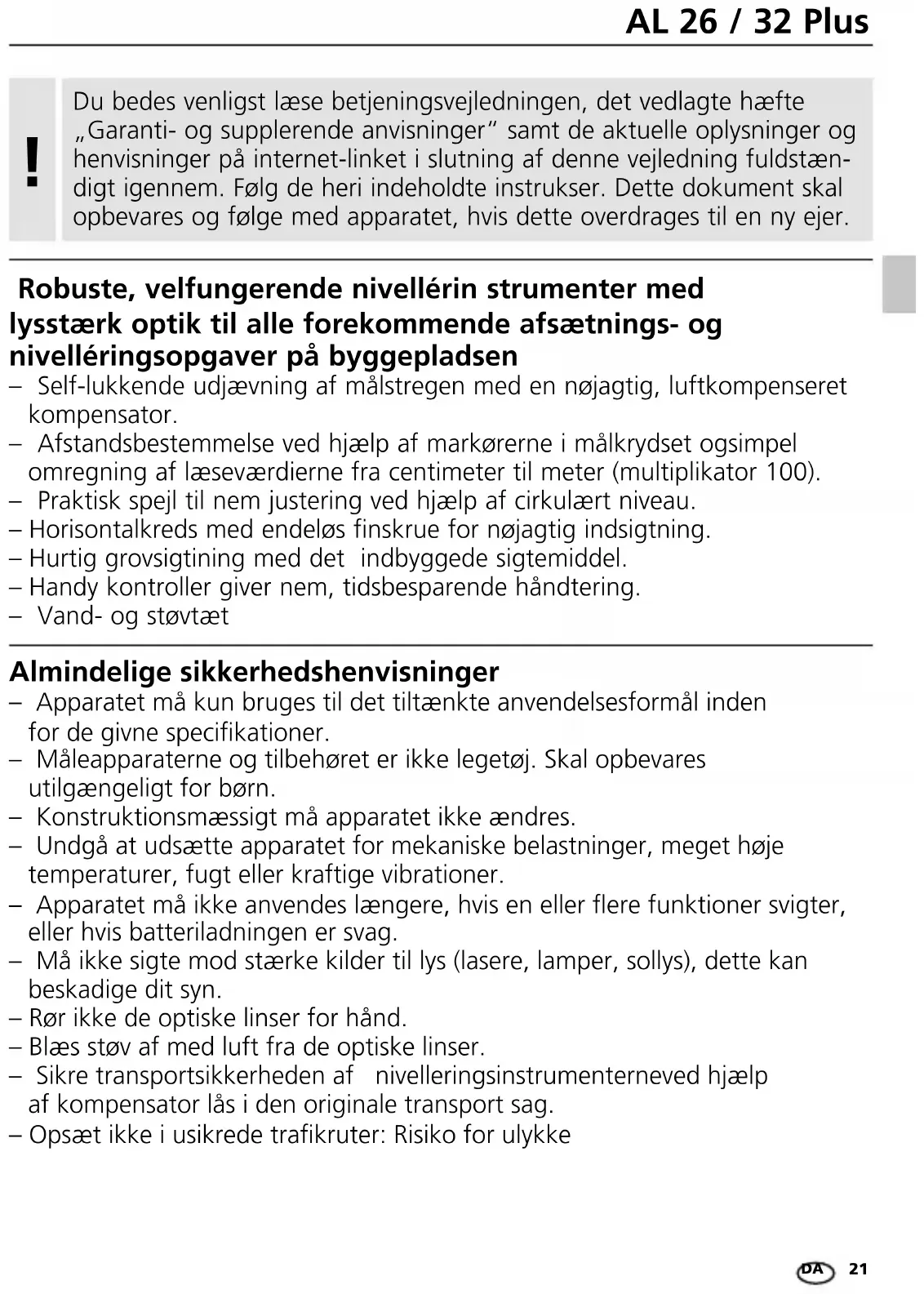 Almindelige sikkerhedshenvisninger – Apparatet må kun bruges til det tiltænkte anvendelsesformål inden for de givne specikationer. – Måleapparaterne og tilbehøret er ikke legetøj. Skal opbevares utilgængeligt for børn. – Konstruktionsmæssigt må apparatet ikke ændres. – Undgå at udsætte apparatet for mekaniske belastninger, meget høje temperaturer, fugt eller kraftige vibrationer. – Apparatet må ikke anvendes længere, hvis en eller ere funktioner svigter, eller hvis batteriladningen er svag. – Må ikke sigte mod stærke kilder til lys (lasere, lamper, sollys), dette kan beskadige dit syn. – Rør ikke de optiske linser for hånd. – Blæs støv af med luft fra de optiske linser. – Sikre transportsikkerheden af nivelleringsinstrumenterneved hjælp af kompensator lås i den originale transport sag. – Opsæt ikke i usikrede trakruter: Risiko for ulykke Robuste, velfungerende nivellérin strumenter med lysstærk optik til alle forekommende afsætnings- og nivelléringsopgaver på byggepladsen – Self-lukkende udjævning af målstregen med en nøjagtig, luftkompenseret kompensator. – Afstandsbestemmelse ved hjælp af markørerne i målkrydset ogsimpel omregning af læseværdierne fra centimeter til meter (multiplikator 100). – Praktisk spejl til nem justering ved hjælp af cirkulært niveau. – Horisontalkreds med endeløs finskrue for nøjagtig indsigtning. – Hurtig grovsigtining med det indbyggede sigtemiddel. – Handy kontroller giver nem, tidsbesparende håndtering. – Vand- og støvtæt Du bedes venligst læse betjeningsvejledningen, det vedlagte hæfte „Garanti- og supplerende anvisninger“ samt de aktuelle oplysninger og henvisninger på internet-linket i slutning af denne vejledning fuldstæn- digt igennem. Følg de heri indeholdte instrukser. Dette dokument skal opbevares og følge med apparatet, hvis dette overdrages til en ny ejer.