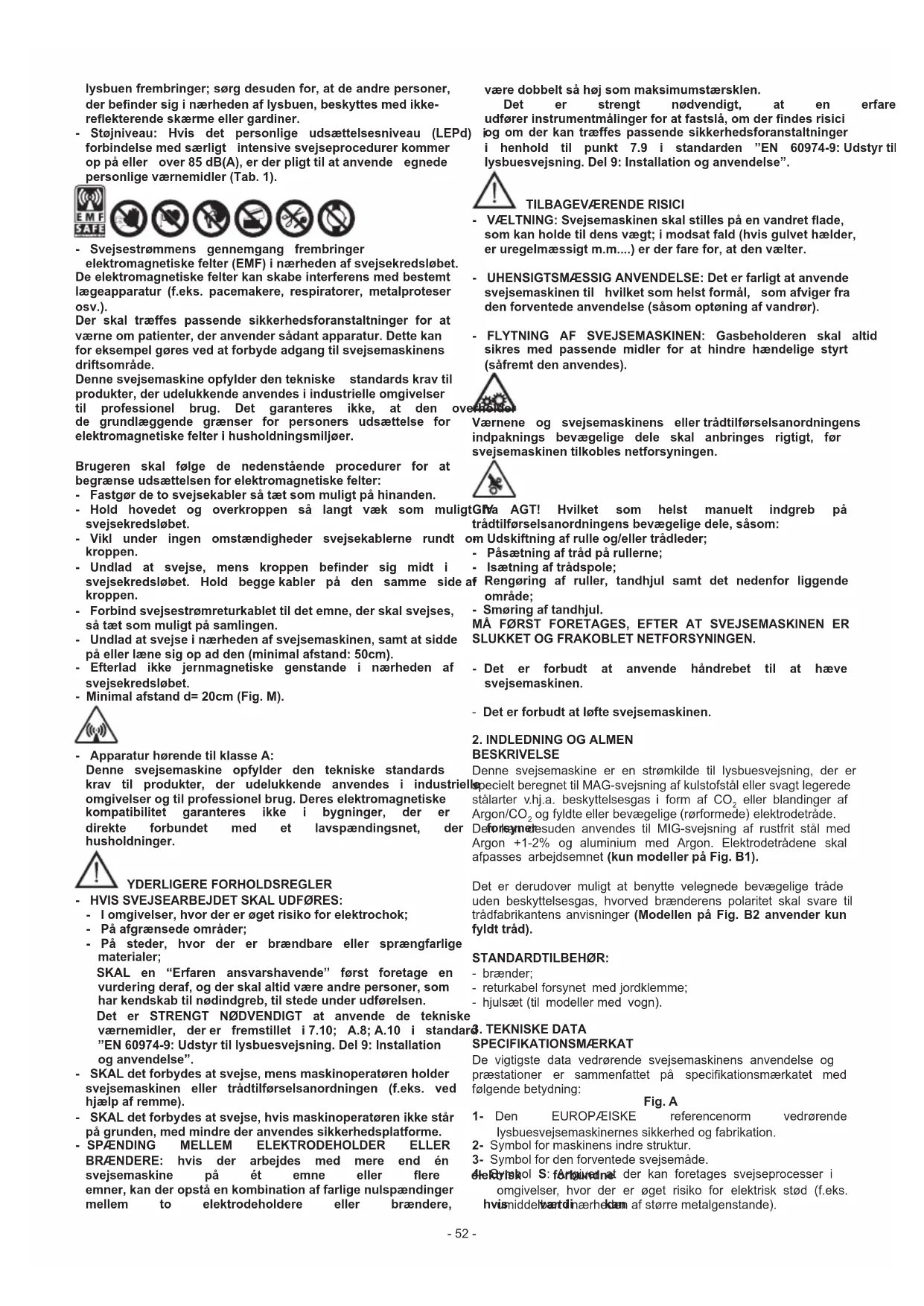 LYSBUESVEJSNING Operatøren skal sættes tilstrækkeligt ind i, hvordan svejsemaskinen anvendes på sikker vis samt oplyses om risiciene forbundet med buesvejsningsprocedurerne samt de påkrævedesikkerhedsforanstaltningerognødprocedurer. (Jævnførstandard”EN60974-9:Udstyrtillysbuesvejsning.Del 9:Installationoganvendelse”). - Undgådirekteberøringmedsvejsekredsløbet;nulspændingen frasvejsemaskinenkanIvissetilfældeværefarlig. - Svejsemaskinen skal slukkes og frakobles netforsyningen, førsvejsekablernetilsluttesellerderforetageseftersyneller reparationer. - Sluk for svejsemaskinen og frakobl den netforsyningen, før brænderens sliddele udskiftes. - Denelektriskeinstallationskalværeioverensstemmelsemed degældendeulykkesforebyggendenormeroglove. - Svejsemaskinen må udelukkende forbindes til et forsyningssystem med en jordforbundet, neutral ledning. - Man skal sørge for, at netstikkontakten er rigitgt forbundet med jordbeskyttelsesanlægget. - Svejsemaskinenmåikkeanvendesifugtige,vådeomgivelser ellerudendørsiregnvejr. - Dermåikkeanvendesledningermeddårligisoleringellerløse forbindelser. - Der må ikke svejses på beholdere, dunke eller rør, der indeholder eller har indeholdt brændbare væsker eller gasarter. - Man skal undlade at arbejde på materialer, der er renset med klorbrinteholdige opløsningsmidler eller i nærheden af lignende stoffer. - Dermåikkesvejsespåbeholdereundertryk. - Samtligebrændbarestoffer(såsomtræ,papir,kludeosv.)skal fjernesfraarbejdsområdet. - Manskalsørgefor,atderertilstrækkeligudluftningellerndes egnede midler til fjernelse af svejsedampene i nærheden af svejsebuen;derskaliværksættesensystematiskprocedure tilvurderingafgrænsenforudsættelseforsvejsedampenealt efter deres sammensætning, koncentration og udsættelsens varighed. - Gasbeholderen skal holdes væk fra varmekilder, inklusiv solstråler(såfremtdenanvendes). - Den elektriske isolering skal passe til brænderen, arbejdsemnet og de (tilgængelige) jordforbundne metaldele, sombendersiginærheden. Dette gøres almindeligvis ved at benytte formålstjenlige handsker, sko, hovedbeklædning og tøj samt isolerende trinbrætellermåtter. - Beskytaltidøjnenemedsærligeltre,deropfylderkravenei UNIEN169ellerUNIEN379,ogsomermonteretpåmasker ellerhjelmeioverensstemmelsemedUNIEN175. Anvendvandtætte beskyttelsesklæder (ifølge UNI EN11611) og svejsehandsker (ifølge UNI EN 12477) , så huden ikke udsættes for de ultraviolette eller infrarøde stråler, som- 52 - lysbuen frembringer; sørg desuden for, at de andre personer, derbendersiginærhedenaflysbuen,beskyttesmedikke- reekterendeskærmeellergardiner. - Støjniveau: Hvis det personlige udsættelsesniveau (LEPd) i forbindelsemedsærligt intensivesvejseprocedurerkommer oppåeller over85dB(A),erderpligttilatanvende egnede personligeværnemidler(Tab.1). - Svejsestrømmens gennemgang frembringer elektromagnetiskefelter(EMF)inærhedenafsvejsekredsløbet. De elektromagnetiske felter kan skabe interferens med bestemt lægeapparatur (f.eks. pacemakere, respiratorer, metalproteser osv.). Der skal træffes passende sikkerhedsforanstaltninger for at værneompatienter,deranvendersådantapparatur.Dettekan foreksempelgøresvedatforbydeadgangtilsvejsemaskinens driftsområde. Dennesvejsemaskineopfylderdentekniske standardskravtil produkter,derudelukkendeanvendesiindustrielleomgivelser til professionel brug. Det garanteres ikke, at den overholder de grundlæggende grænser for personers udsættelse for elektromagnetiske felter i husholdningsmiljøer. Brugeren skal følge de nedenstående procedurer for at begrænseudsættelsenforelektromagnetiskefelter: - Fastgørdetosvejsekablersåtætsommuligtpåhinanden. - Hold hovedet og overkroppen så langt væk som muligt fra svejsekredsløbet. - Vikl under ingen omstændigheder svejsekablerne rundt om kroppen. - Undlad at svejse, mens kroppen bender sig midt i svejsekredsløbet. Hold beggekabler på den samme sideaf kroppen. - Forbindsvejsestrømreturkablettildetemne,derskalsvejses, såtætsommuligtpåsamlingen. - Undladatsvejseinærhedenafsvejsemaskinen,samtatsidde påellerlænesigopadden(minimalafstand:50cm). - Efterlad ikke jernmagnetiske genstande i nærheden af svejsekredsløbet. - Minimal afstand d= 20cm (Fig. M). - ApparaturhørendetilklasseA: Denne svejsemaskine opfylder den tekniske standards krav til produkter, der udelukkende anvendes i industrielle omgivelserogtilprofessionelbrug.Dereselektromagnetiske kompatibilitet garanteres ikke i bygninger, der er direkte forbundet med et lavspændingsnet, der forsyner husholdninger. YDERLIGERE FORHOLDSREGLER - HVISSVEJSEARBEJDETSKALUDFØRES: - Iomgivelser,hvordererøgetrisikoforelektrochok; - Påafgrænsedeområder; - På steder, hvor der er brændbare eller sprængfarlige materialer; SKAL en “Erfaren ansvarshavende” først foretage en vurderingderaf,ogderskalaltidværeandrepersoner,som har kendskab til nødindgreb, til stede under udførelsen. Det er STRENGT NØDVENDIGT at anvende de tekniske værnemidler, derer fremstillet i7.10; A.8;A.10 i standard ”EN60974-9:Udstyrtillysbuesvejsning.Del9:Installation oganvendelse”. - SKALdetforbydesatsvejse,mensmaskinoperatørenholder svejsemaskinen eller trådtilførselsanordningen (f.eks. ved hjælp af remme). - SKALdetforbydesatsvejse,hvismaskinoperatørenikkestår pågrunden,medmindrederanvendessikkerhedsplatforme.