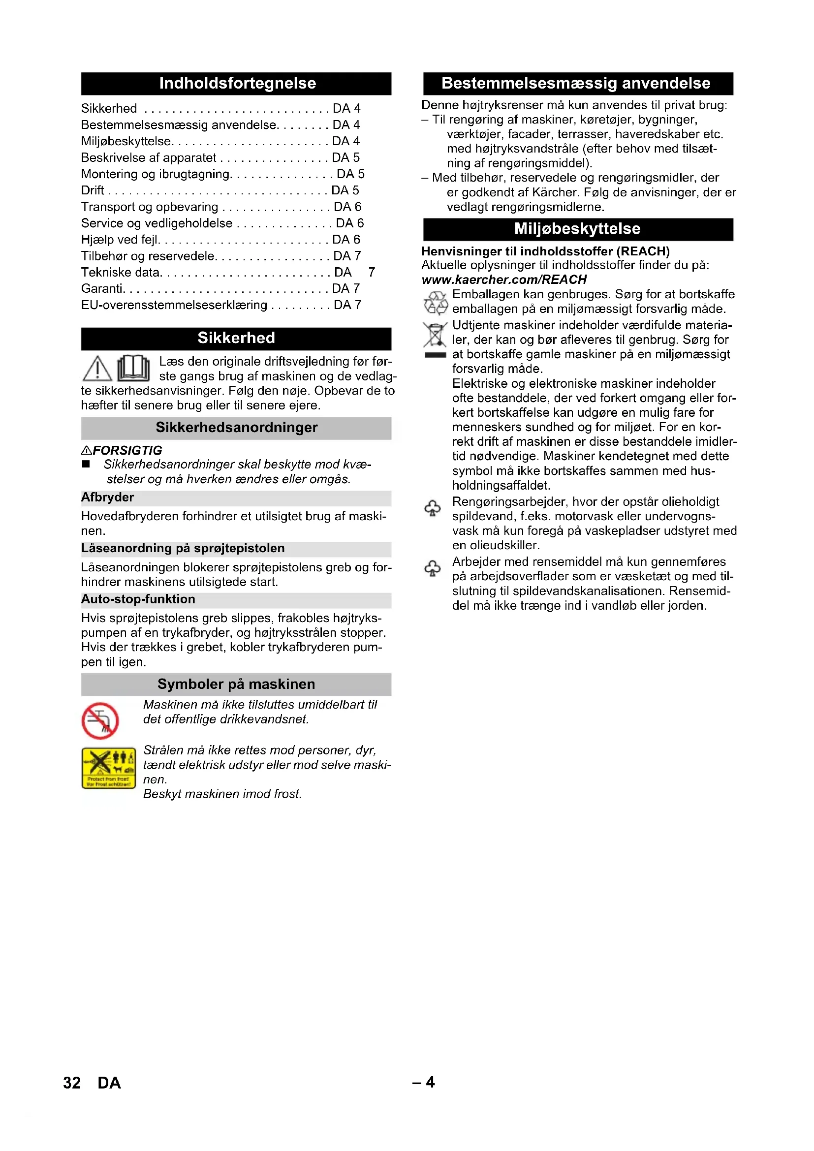88 dB(A) O fabricante reserva-se o direito de proceder a quaisquer altera- ções técnicas. Garantia Declaração UE de conformidade Produto: Lavadora de alta pressão Tipo: 1.676-xxx Respectivas Directrizes da UE 2000/14/CE 2014/30/UE 2006/42/CE (+2009/127/CE) 2011/65/UE Normas harmonizadas aplicadas EN 50581 EN 55014–1: 2006+A1: 2009+A2: 2011 EN 55014–2: 2015 EN 60335–1 EN 60335–2–79 EN 61000–3–2: 2014 EN 61000–3–3: 2013 EN 62233: 2008 Processo aplicado de avaliação de conformidade 2000/14/CE: Anexo V Nível de potência acústica dB(A) Medido: 85 Garantido: 88 Winnenden, 2018/08/01 Chairman of the Board of Management Director Regulatory Affairs & Certification 31PT– 4 Læs den originale driftsvejledning før før- ste gangs brug af maskinen og de vedlag- te sikkerhedsanvisninger. Følg den nøje. Opbevar de to hæfter til senere brug eller til senere ejere. 몇 FORSIGTIG Sikkerhedsanordninger skal beskytte mod kvæ- stelser og må hverken ændres eller omgås. Hovedafbryderen forhindrer et utilsigtet brug af maski- nen. Låseanordningen blokerer sprøjtepistolens greb og for- hindrer maskinens utilsigtede start. Hvis sprøjtepistolens greb slippes, frakobles højtryks- pumpen af en trykafbryder, og højtryksstrålen stopper. Hvis der trækkes i grebet, kobler trykafbryderen pum- pen til igen. Denne højtryksrenser må kun anvendes til privat brug: – Til rengøring af maskiner, køretøjer, bygninger, værktøjer, facader, terrasser, haveredskaber etc. med højtryksvandstråle (efter behov med tilsæt- ning af rengøringsmiddel). – Med tilbehør, reservedele og rengøringsmidler, der er godkendt af Kärcher. Følg de anvisninger, der er vedlagt rengøringsmidlerne. Henvisninger til indholdsstoffer (REACH) Aktuelle oplysninger til indholdsstoffer finder du på: www.kaercher.com/REACH Indholdsfortegnelse Sikkerhed . . . . . . . . . . . . . . . . . . . . . . . . . . . DA 4 Bestemmelsesmæssig anvendelse. . . . . . . . DA 4 Miljøbeskyttelse. . . . . . . . . . . . . . . . . . . . . . . DA 4 Beskrivelse af apparatet . . . . . . . . . . . . . . . . DA 5 Montering og ibrugtagning. . . . . . . . . . . . . . . DA 5 Drift . . . . . . . . . . . . . . . . . . . . . . . . . . . . . . . . DA 5 Transport og opbevaring . . . . . . . . . . . . . . . . DA 6 Service og vedligeholdelse . . . . . . . . . . . . . . DA 6 Hjælp ved fejl. . . . . . . . . . . . . . . . . . . . . . . . . DA 6 Tilbehør og reservedele. . . . . . . . . . . . . . . . . DA 7 Tekniske data. . . . . . . . . . . . . . . . . . . . . . . . . DA7 Garanti. . . . . . . . . . . . . . . . . . . . . . . . . . . . . . DA 7 EU-overensstemmelseserklæring . . . . . . . . . DA 7 Sikkerhed Sikkerhedsanordninger Afbryder Låseanordning på sprøjtepistolen Auto-stop-funktion Symboler på maskinen Maskinen må ikke tilsluttes umiddelbart til det offentlige drikkevandsnet. Strålen må ikke rettes mod personer, dyr, tændt elektrisk udstyr eller mod selve maski- nen. Beskyt maskinen imod frost. Bestemmelsesmæssig anvendelse Miljøbeskyttelse Emballagen kan genbruges. Sørg for at bortskaffe emballagen på en miljømæssigt forsvarlig måde. Udtjente maskiner indeholder værdifulde materia- ler, der kan og bør afleveres til genbrug. Sørg for at bortskaffe gamle maskiner på en miljømæssigt forsvarlig måde. Elektriske og elektroniske maskiner indeholder ofte bestanddele, der ved forkert omgang eller for- kert bortskaffelse kan udgøre en mulig fare for menneskers sundhed og for miljøet. For en kor- rekt drift af maskinen er disse bestanddele imidler- tid nødvendige. Maskiner kendetegnet med dette symbol må ikke bortskaffes sammen med hus- holdningsaffaldet. Rengøringsarbejder, hvor der opstår olieholdigt spildevand, f.eks. motorvask eller undervogns- vask må kun foregå på vaskepladser udstyret med en olieudskiller. Arbejder med rensemiddel må kun gennemføres på arbejdsoverflader som er væsketæt og med til- slutning til spildevandskanalisationen. Rensemid- del må ikke trænge ind i vandløb eller jorden. 32 DA– 5 Apparatets leveringsomfang (afhængig af model) vises på emballagen. I denne driftsvejledning beskrives alle optionsmuligheder. Figurer, se siderne med grafik 1 Højtrykstilslutning 2 Hovedafbryder „0/OFF“ / „I/ON“ 3 Opbevaringskrog 4Bæregreb 5 Transportgreb, som kan trækkes ud 6 Sugeslange til rengøringsmiddel med rengørings- middelfilter og låg 7 Rensemiddeltank 8 Tilkoblingsdel til vandforsyning 9 Vandtilslutning med integreret si 10 Opbevaring til strålerøret 11 Opbevaring til højtrykpistol 12 Strømledning med netstik 13 Tranporthjul 14 Full Control sprøjtepistol 15 Trykindikator