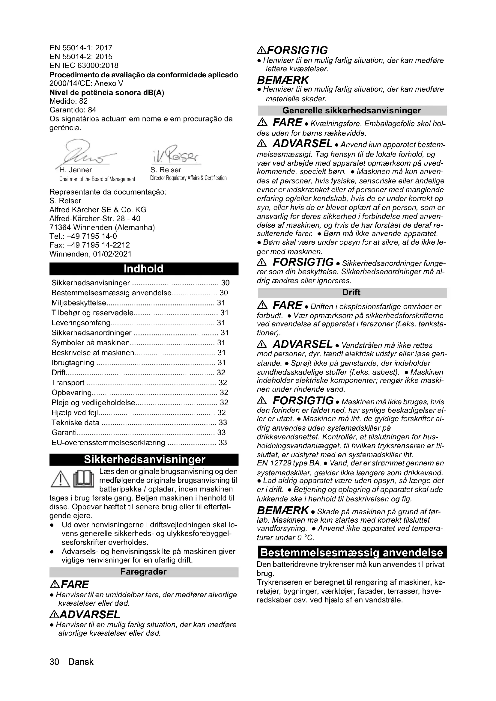 - dB(A) 8430 Dansk EN 55014-1: 2017 EN 55014-2: 2015 EN IEC 63000:2018 Procedimento de avaliação da conformidade aplicado 2000/14/CE: Anexo V Nível de potência sonora dB(A) Medido: 82 Garantido: 84 Os signatários actuam em nome e em procuração da gerência. Representante da documentação: S. Reiser Alfred Kärcher SE & Co. KG Alfred-Kärcher-Str. 28 - 40 71364 Winnenden (Alemanha) Tel.: +49 7195 14-0 Fax: +49 7195 14-2212 Winnenden, 01/02/2021 Indhold Sikkerhedsanvisninger Læs den originale brugsanvisning og den medfølgende originale brugsanvisning til batteripakke / oplader, inden maskinen tages i brug første gang. Betjen maskinen i henhold til disse. Opbevar hæftet til senere brug eller til efterføl- gende ejere. ● Ud over henvisningerne i driftsvejledningen skal lo- vens generelle sikkerheds- og ulykkesforebyggel- sesforskrifter overholdes. ● Advarsels- og henvisningsskilte på maskinen giver vigtige henvisninger for en ufarlig drift. Faregrader FARE ● Henviser til en umiddelbar fare, der medfører alvorlige kvæstelser eller død. 몇 ADVARSEL ● Henviser til en mulig farlig situation, der kan medføre alvorlige kvæstelser eller død. 몇 FORSIGTIG ● Henviser til en mulig farlig situation, der kan medføre lettere kvæstelser. BEMÆRK ● Henviser til en mulig farlig situation, der kan medføre materielle skader. Generelle sikkerhedsanvisninger FARE ● Kvælningsfare. Emballagefolie skal hol- des uden for børns rækkevidde. 몇 ADVARSEL ● Anvend kun apparatet bestem- melsesmæssigt. Tag hensyn til de lokale forhold, og vær ved arbejde med apparatet opmærksom på uved- kommende, specielt børn. ● Maskinen må kun anven- des af personer, hvis fysiske, sensoriske eller åndelige evner er indskrænket eller af personer med manglende erfaring og/eller kendskab, hvis de er under korrekt op- syn, eller hvis de er blevet oplært af en person, som er ansvarlig for deres sikkerhed i forbindelse med anven- delse af maskinen, og hvis de har forstået de deraf re- sulterende farer. ● Børn må ikke anvende apparatet. ● Børn skal være under opsyn for at sikre, at de ikke le- ger med maskinen. 몇 FORSIGTIG ● Sikkerhedsanordninger funge- rer som din beskyttelse. Sikkerhedsanordninger må al- drig ændres eller ignoreres. Drift FARE ● Driften i eksplosionsfarlige områder er forbudt. ● Vær opmærksom på sikkerhedsforskrifterne ved anvendelse af apparatet i farezoner (f.eks. tanksta- tioner). 몇 ADVARSEL ● Vandstrålen må ikke rettes mod personer, dyr, tændt elektrisk udstyr eller løse gen- stande. ● Sprøjt ikke på genstande, der indeholder sundhedsskadelige stoffer (f.eks. asbest). ● Maskinen indeholder elektriske komponenter; rengør ikke maski- nen under rindende vand. 몇 FORSIGTIG ● Maskinen må ikke bruges, hvis den forinden er faldet ned, har synlige beskadigelser el- ler er utæt. ● Maskinen må iht. de gyldige forskrifter al- drig anvendes uden systemadskiller på drikkevandsnettet. Kontrollér, at tilslutningen for hus- holdningsvandanlægget, til hvilken tryksrenseren er til- sluttet, er udstyret med en systemadskiller iht. EN 12729 type BA. ● Vand, der er strømmet gennem en systemadskiller, gælder ikke længere som drikkevand. ● Lad aldrig apparatet være uden opsyn, så længe det er i drift. ● Betjening og oplagring af apparatet skal ude- lukkende ske i henhold til beskrivelsen og fig. BEMÆRK ● Skade på maskinen på grund af tør- løb. Maskinen må kun startes med korrekt tilsluttet vandforsyning. ● Anvend ikke apparatet ved tempera- turer under 0 °C. Bestemmelsesmæssig anvendelse Den batteridrevne trykrenser må kun anvendes til privat brug. Trykrenseren er beregnet til rengøring af maskiner, kø- retøjer, bygninger, værktøjer, facader, terrasser, have- redskaber osv. ved hjælp af en vandstråle. Sikkerhedsanvisninger p. 30