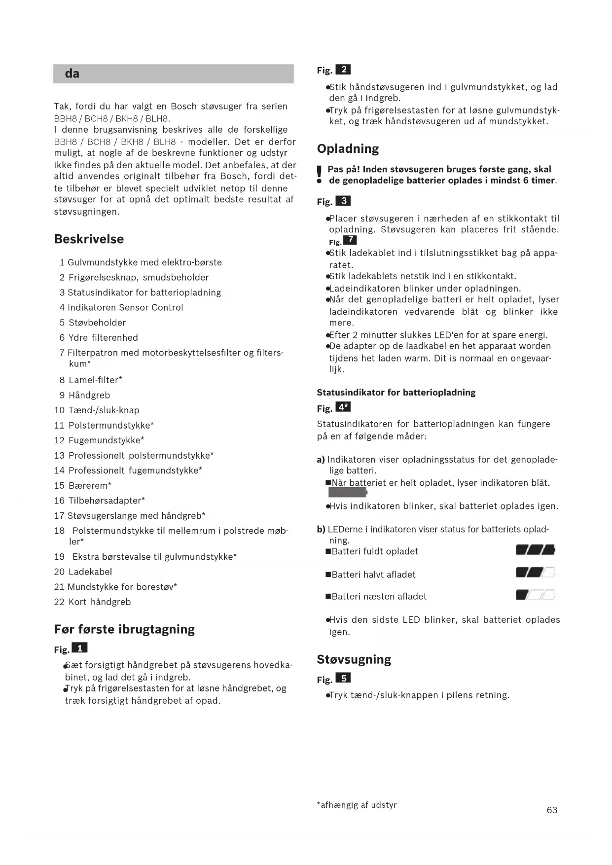 Tak, fordi du har valgt en Bosch støvsuger fra serien BBH8 / BCH8 / BKH8 / BLH8. I denne brugsanvisning beskrives alle de forskellige BBH8 / BCH8 / BKH8 / BLH8 - modeller. Det er derfor muligt, at nogle af de beskrevne funktioner og udstyr ikke findes på den aktuelle model. Det anbefales, at der altid anvendes originalt tilbehør fra Bosch, fordi det- te tilbehør er blevet specielt udviklet netop til denne støvsuger for at opnå det optimalt bedste resultat af støvsugningen. Beskrivelse 1 Gulvmundstykke med elektro-børste 2 Frigørelsesknap, smudsbeholder 3 Statusindikator for batteriopladning 4 Indikatoren Sensor Control 5 Støvbeholder 6 Ydre filterenhed 7 Filterpatron med motorbeskyttelsesfilter og filters- kum* 8 Lamel-filter* 9 Håndgreb 10 Tænd-/sluk-knap 11 Polstermundstykke* 12 Fugemundstykke* 13 Professionelt polstermundstykke* 14 Professionelt fugemundstykke* 15 Bærerem* 16 Tilbehørsadapter* 17 Støvsugerslange med håndgreb* 18 Polstermundstykke til mellemrum i polstrede møb- ler* 19 Ekstra børstevalse til gulvmundstykke* 20 Ladekabel 21 Mundstykke for borestøv* 22 Kort håndgreb Før første ibrugtagning Fig.
