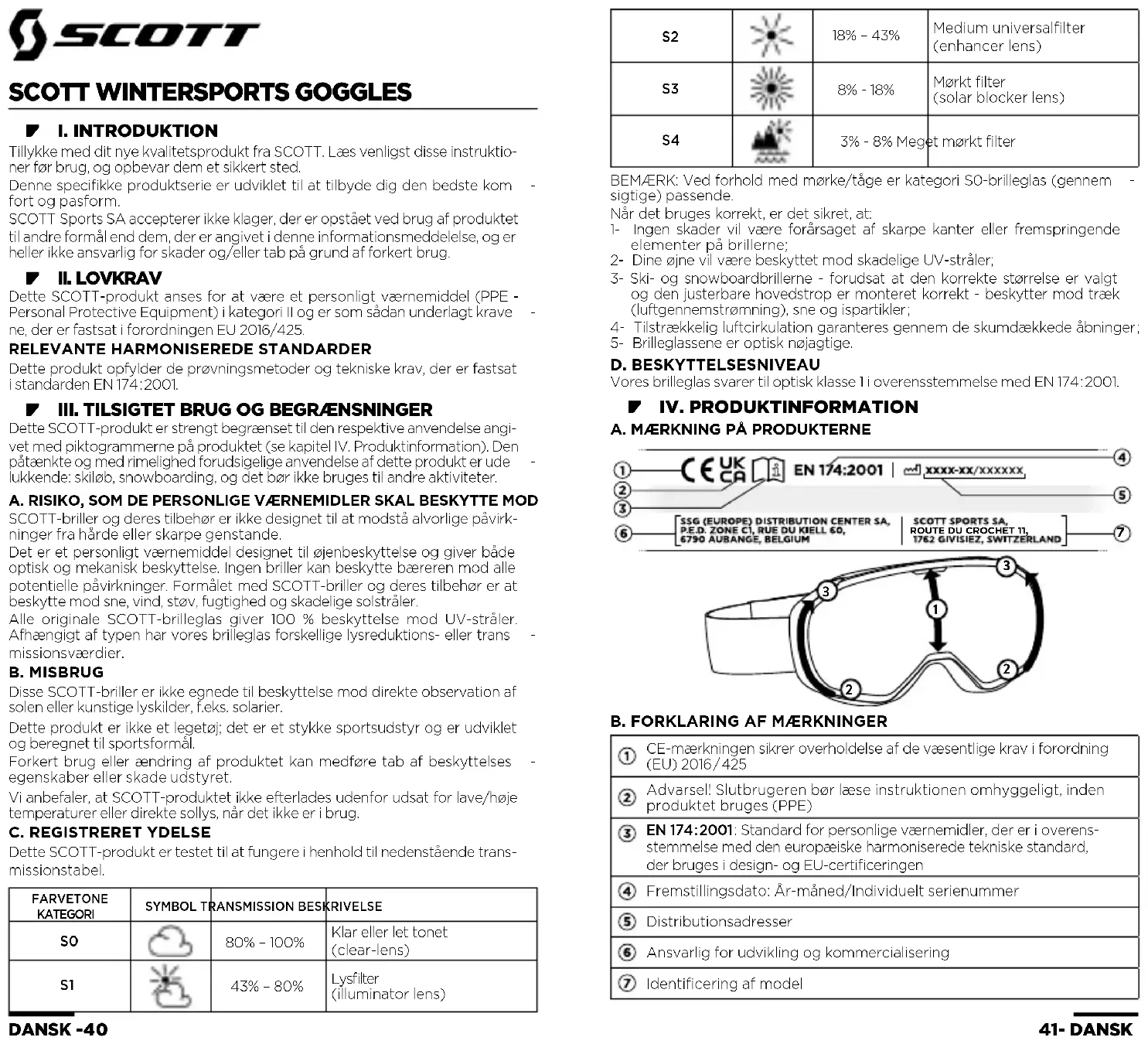 lukkende: skiløb, snowboarding, og det bør ikke bruges til andre aktiviteter. A. RISIKO, SOM DE PERSONLIGE VÆRNEMIDLER SKAL BESKYTTE MOD SCOTT-briller og deres tilbehør er ikke designet til at modstå alvorlige påvirk- ninger fra hårde eller skarpe genstande. Det er et personligt værnemiddel designet til øjenbeskyttelse og giver både optisk og mekanisk beskyttelse. Ingen briller kan beskytte bæreren mod alle potentielle påvirkninger. Formålet med SCOTT-briller og deres tilbehør er at beskytte mod sne, vind, støv, fugtighed og skadelige solstråler. Alle originale SCOTT-brilleglas giver 100 % beskyttelse mod UV-stråler. Afhængigt af typen har vores brilleglas forskellige lysreduktions- eller trans