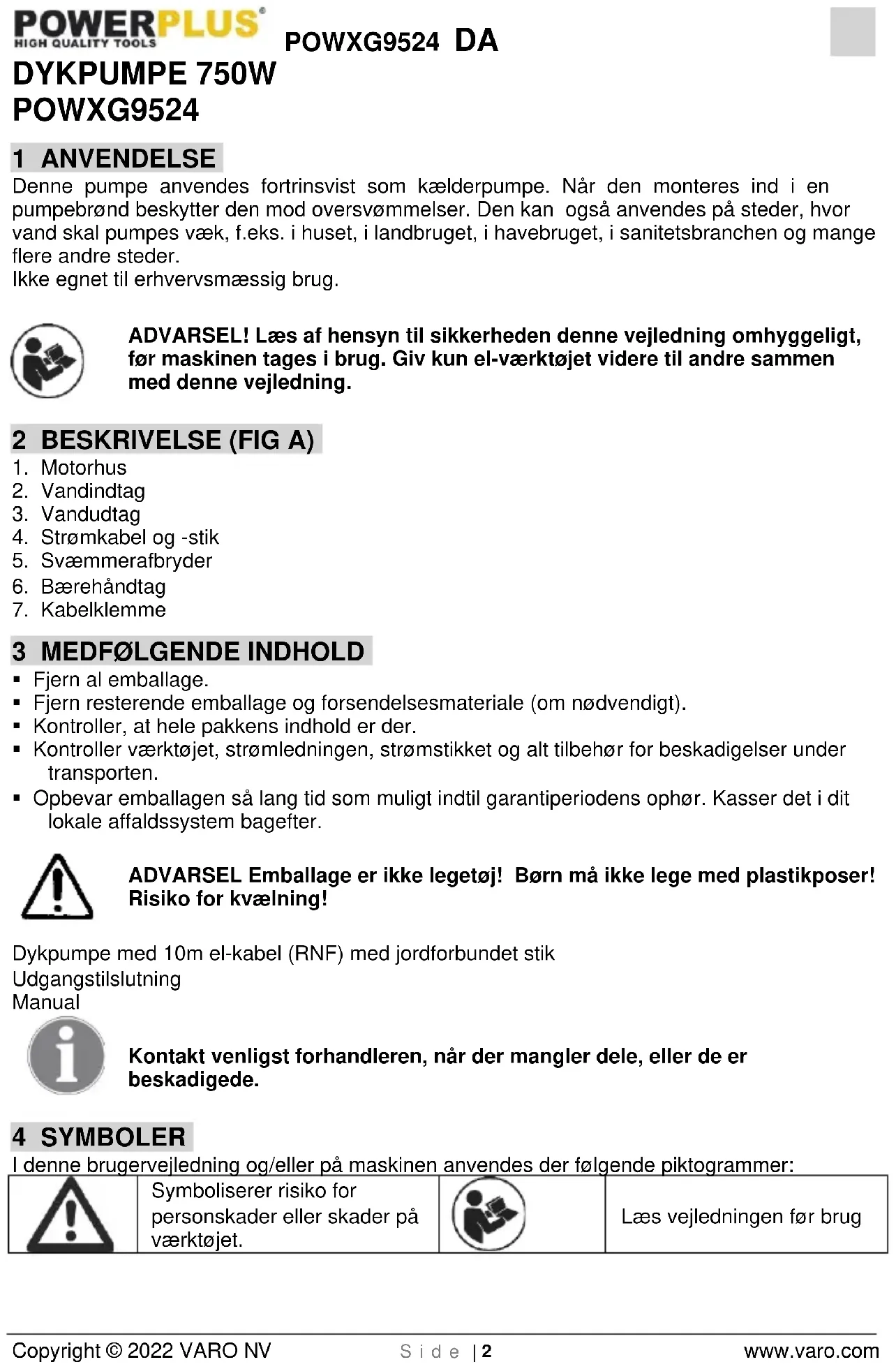 Copyright © 2022 VARO NV S i d e | 2 www.varo.com DYKPUMPE 750W POWXG9524 1 ANVENDELSE Denne pumpe anvendes fortrinsvist som kælderpumpe. Når den monteres ind i en pumpebrønd beskytter den mod oversvømmelser. Den kan også anvendes på steder, hvor vand skal pumpes væk, f.eks. i huset, i landbruget, i havebruget, i sanitetsbranchen og mange flere andre steder. Ikke egnet til erhvervsmæssig brug. ADVARSEL! Læs af hensyn til sikkerheden denne vejledning omhyggeligt, før maskinen tages i brug. Giv kun el-værktøjet videre til andre sammen med denne vejledning. 2 BESKRIVELSE (FIG A)