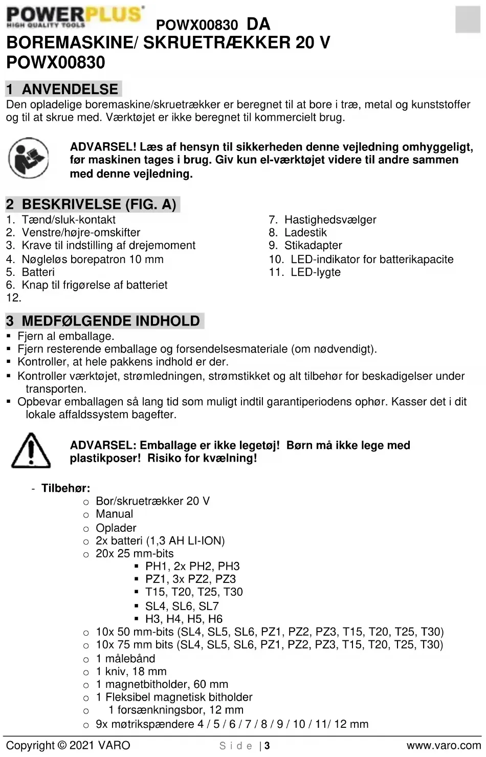 - Værktøjet skal oplades mindst en gang om måneden for at sikre, at det fungerer optimalt.POWX00830 DA Copyright © 2021 VARO S i d e | 10 www.varo.com 15 MILJØ Hvis maskinen skal skiftes ud efter lang tids brug, må den ikke bortskaffes som husholdningsaffald, men skal bortskaffes på en miljømæssigt forsvarlig måde. Affald produceret af de elektriske maskiner må ikke behandles som normalt husaffald. Sørg for at genbruge det, hvor der findes egnede anlæg til det. Kontakt den lokale instans eller forhandleren for at få rådgivning om indsamling og bortskaffelse. 16 BATTERIPAKKE Dette produkt indeholder Li-ion. For at bevare naturen skal batterierne genbruges eller bortskaffes på korrekt vis. Lokale eller nationale regler kan gøre det forbudt at bortskaffe Li- ion-batterier sammen med almindeligt affald. Forhør dig hos dit lokale affaldsdepot for yderligere information om genbrugs- og bortskaffelsesmuligheder. 17 KONFORMITETSERKLÆRING VARO N.V. – Vic. Van Rompuy N.V. Joseph Van Instraat 9 – BE2500 Lier – Belgien, erklærer hermed, at Apparatbeskrivelse: Boremaskine/Skruetrækker Varemærke: POWERplus Varenummer: POWX00830 er i overensstemmelse med de væsentlige krav og andre relevante bestemmelser i gældende europæiske direktiver, der er baseret på anvendelse af europæiske harmoniserede standarder. Enhver uautoriseret modifikation af apparatet ugyldiggør denne erklæring. EU-direktiver (herunder eventuelle tillæg frem til datoen for undertegnelsen): 2011/65/EU 2006/42/EC 2014/30/EU Harmoniserede europæiske standarder (herunder eventuelle tillæg frem til datoen for undertegnelsen): EN62841-1 : 2015 EN62841-2-1 : 2018 EN55014-1 : 2017 EN55014-2 : 2015 Indehaver af den tekniske dokumentation: Philippe Vankerkhove, VARO - Vic. Van Rompuy N.V. Undertegnede handler på vegne af selskabets administrerende direktør, Ludo Mertens Certification Manager 23/09/2021, Lier - BelgiumPOWX00830 SV Copyright © 2021 VARO S i d e | 1 www.varo.com