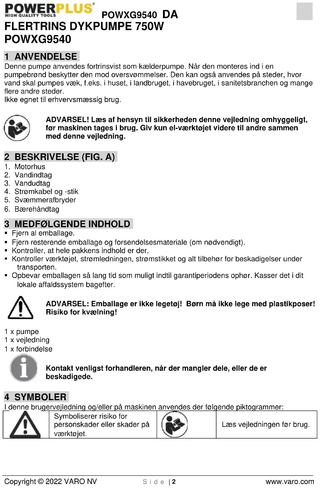 Læs vejledningen før brug.POWXG9540 DA Copyright © 2022 VARO NV S i d e | 3 www.varo.com 5 GENERELLE SIKKERHEDSFORSKRIFTER OBS! Samtlige anvisninger bør læses. Fejl pga. manglende overholdelse af anvisningerne nedenfor kan forårsage elektriske stød, brand og/eller alvorlige kvæstelser. Begrebet „El- værktøj” i det følgende refererer til netdrevne el-værktøjer (med netkabel). 6 BEMÆRK INDEN IDRIFTTAGNINGEN!