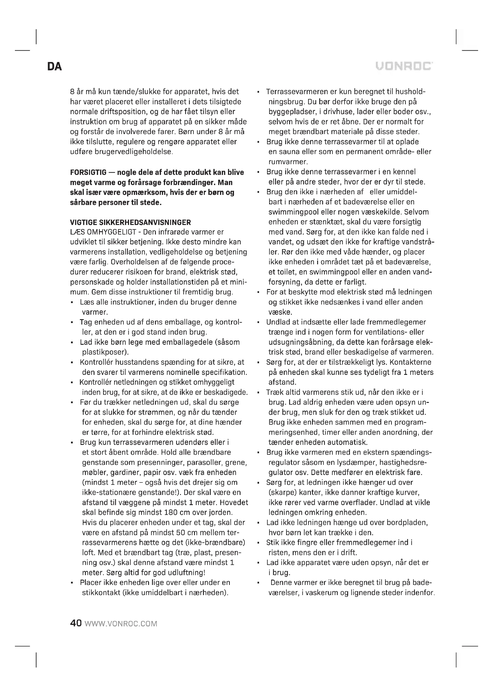 8 år må kun tænde/slukke for apparatet, hvis det har været placeret eller installeret i dets tilsigtede normale driftsposition, og de har fået tilsyn eller instruktion om brug af apparatet på en sikker måde og forstår de involverede farer. Børn under 8 år må ikke tilslutte, regulere og rengøre apparatet eller udføre brugervedligeholdelse. FORSIGTIG — nogle dele af dette produkt kan blive meget varme og forårsage forbrændinger. Man skal især være opmærksom, hvis der er børn og sårbare personer til stede. VIGTIGE SIKKERHEDSANVISNINGER LÆS OMHYGGELIGT - Den infrarøde varmer er udviklet til sikker betjening. Ikke desto mindre kan varmerens installation, vedligeholdelse og betjening være farlig. Overholdelsen af de følgende proce- durer reducerer risikoen for brand, elektrisk stød, personskade og holder installationstiden på et mini- mum. Gem disse instruktioner til fremtidig brug.