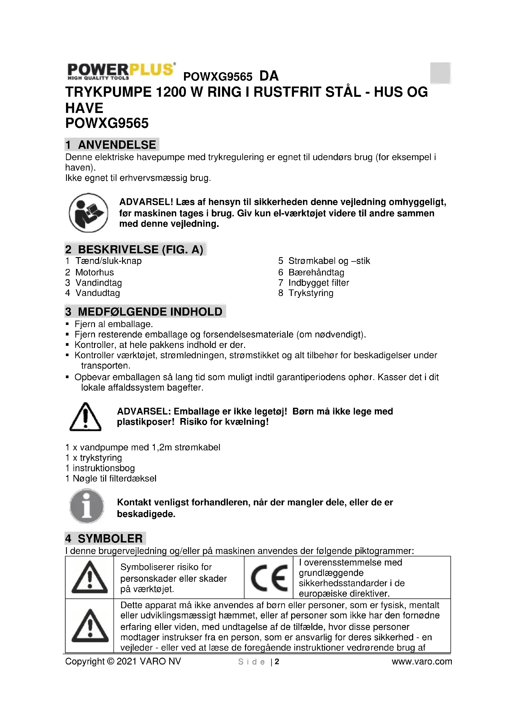 - Det samlede værktøj skal returneres til forhandleren i rimelig ren stand, i den originale blæseformede æske (hvis relevant for enheden) sammen med købsdokumentation.POWXG9565 DA Copyright © 2021 VARO NV S i d e | 8 www.varo.com 13 MILJØ Hvis maskinen skal skiftes ud efter lang tids brug, må den ikke bortskaffes som husholdningsaffald, men skal bortskaffes på en miljømæssigt forsvarlig måde. Affald produceret af de elektriske maskiner må ikke behandles som normalt husaffald. Sørg for at genbruge det, hvor der findes egnede anlæg til det. Kontakt den lokale instans eller forhandleren for at få rådgivning om indsamling og bortskaffelse. 14 KONFORMITETSERKLÆRING VARO N.V. – Vic. Van Rompuy N.V.- Joseph Van Instraat 9 – BE2500 Lier – Belgien, erklærer hermed, at Apparatbeskrivelse: Trykpumpe 1200 W Ring I Rustfrit Stål - Hus Og Have Varemærke: POWERplus Varenummer: POWXG9565 er i overensstemmelse med de væsentlige krav og andre relevante bestemmelser i gældende europæiske direktiver, der er baseret på anvendelse af europæiske harmoniserede standarder. Enhver uautoriseret modifikation af apparatet ugyldiggør denne erklæring. EU-direktiver (herunder eventuelle tillæg frem til datoen for undertegnelsen): 2014/30/EC 2014/35/EC 2011/65/EU 2000/14/EC Annex V LwA Measured 82dB(A) Guaranteed 83dB(A) Harmoniserede europæiske standarder (herunder eventuelle tillæg frem til datoen for undertegnelsen): EN60335-1 : 2012 EN60335-2-41 : 2003 EN55014-1 : 2017 EN55014-2 : 2015