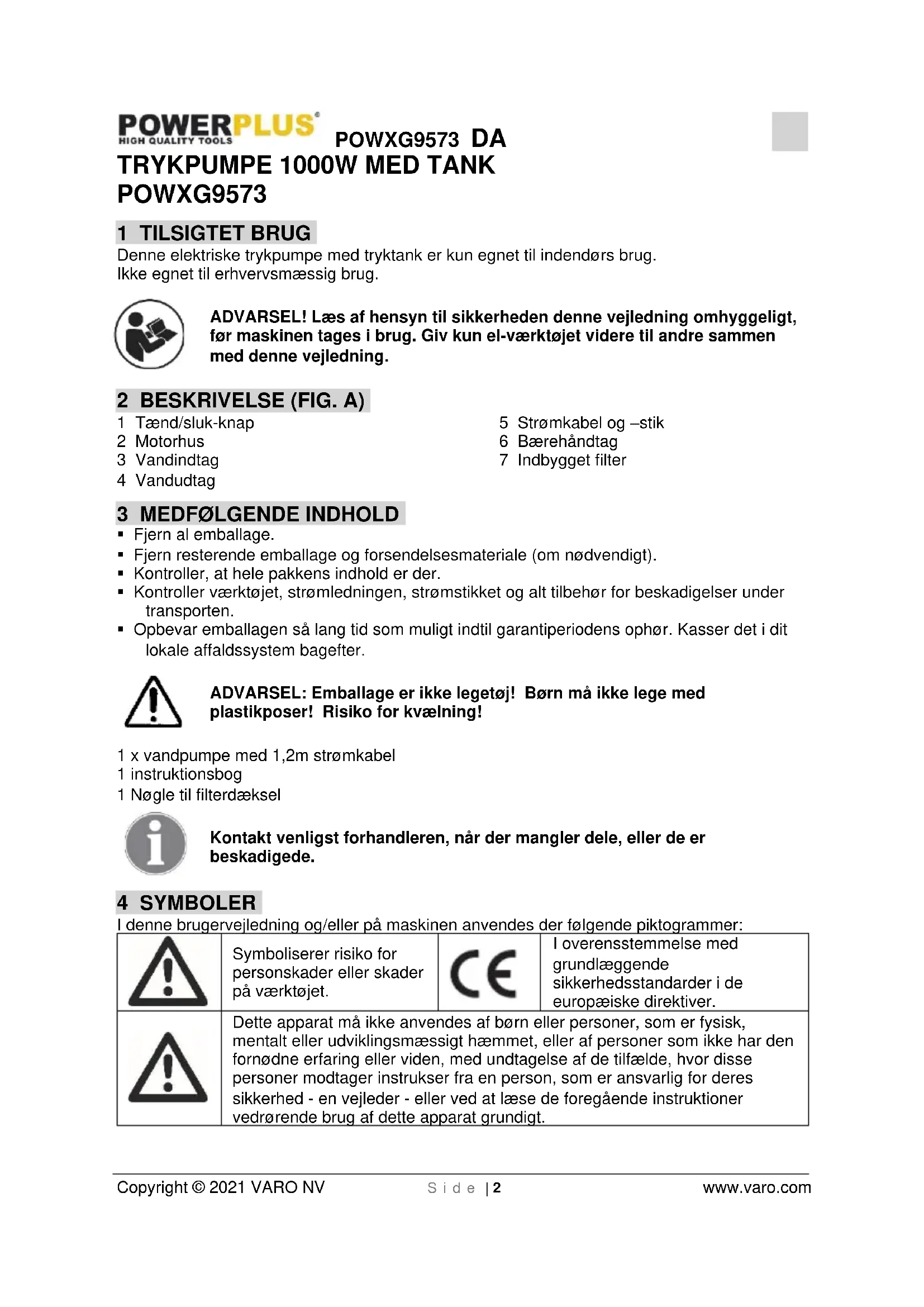 - Det samlede værktøj skal returneres til forhandleren i rimelig ren stand, i den originale blæseformede æske (hvis relevant for enheden) sammen med købsdokumentation.POWXG9573 DA Copyright © 2021 VARO NV S i d e | 8 www.varo.com 14 MILJØ Hvis maskinen skal skiftes ud efter lang tids brug, må den ikke bortskaffes som husholdningsaffald, men skal bortskaffes på en miljømæssigt forsvarlig måde. Affald produceret af de elektriske maskiner må ikke behandles som normalt husaffald. Sørg for at genbruge det, hvor der findes egnede anlæg til det. Kontakt den lokale instans eller forhandleren for at få rådgivning om indsamling og bortskaffelse. 15 KONFORMITETSERKLÆRING VARO N.V. – Vic. Van Rompuy N.V. Joseph Van Instraat 9 – BE2500 Lier – Belgien, erklærer hermed, at Apparatbeskrivelse: TRYKPUMPE 1000W MED TANK Varemærke: POWERplus Varenummer: POWXG9573 er i overensstemmelse med de væsentlige krav og andre relevante bestemmelser i gældende europæiske direktiver, der er baseret på anvendelse af europæiske harmoniserede standarder. Enhver uautoriseret modifikation af apparatet ugyldiggør denne erklæring. EU-direktiver (herunder eventuelle tillæg frem til datoen for undertegnelsen): 2011/65/EU 2014/35/EU 2014/30/EU 2014/68/EU 2000/14/EC Annex V LwA Measured 82dB(A) Guaranteed 84dB(A) Harmoniserede europæiske standarder (herunder eventuelle tillæg frem til datoen for undertegnelsen): EN60335-1 : 2012 EN60335-2-41 : 2003