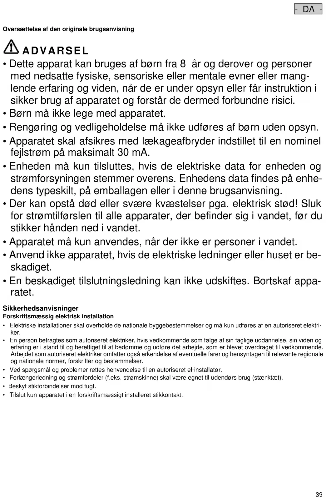 - Der kan opstå død eller svære kvæstelser pga. elektrisk stød! Sluk for strømtilførslen til alle apparater, der befinder sig i vandet, før du stikker hånden ned i vandet.