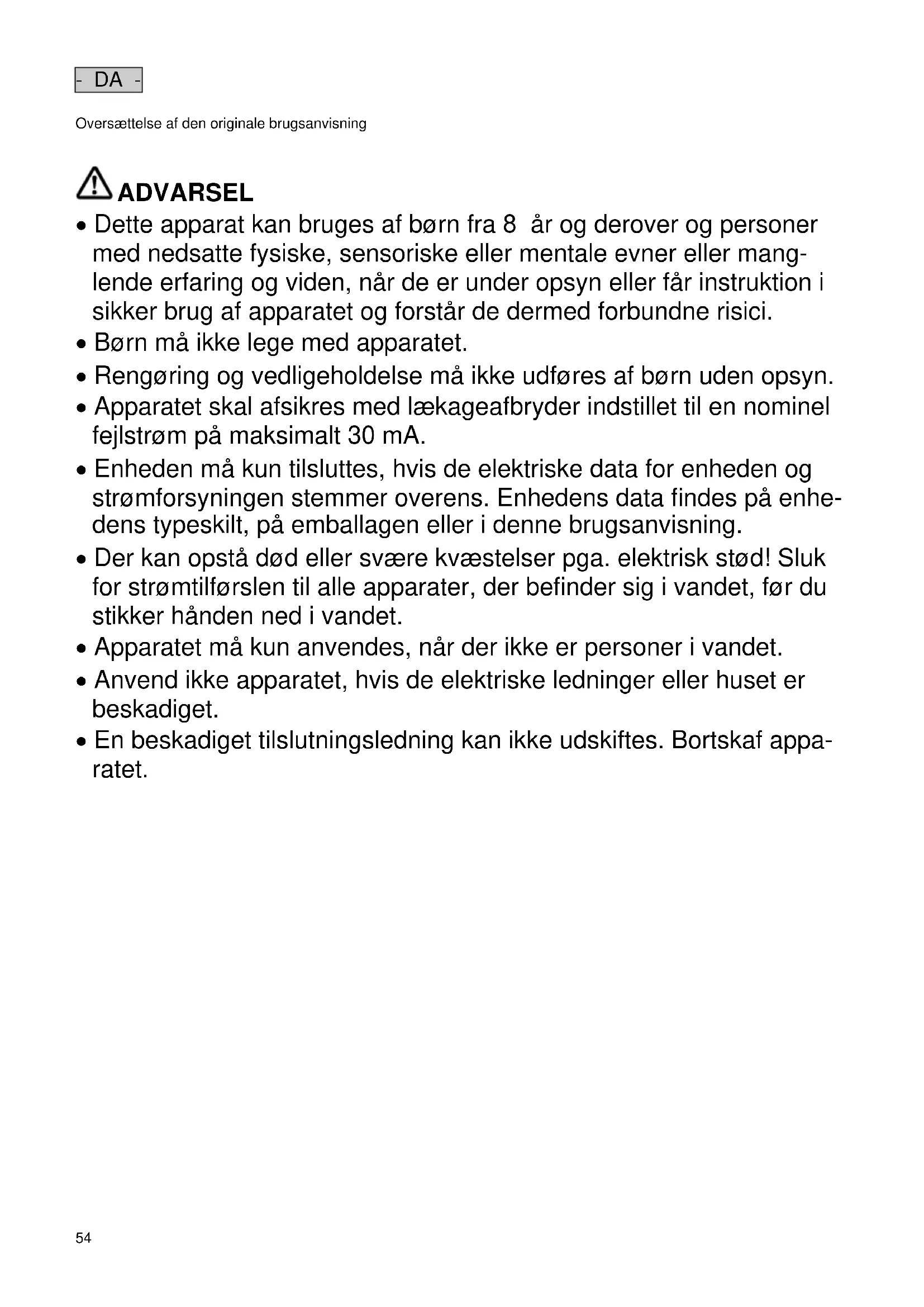 ADVARSEL ADVARSEL Dette apparat kan bruges af børn fra 8 år og derover og personer med nedsatte fysiske, sensoriske eller mentale evner eller mang- lende erfaring og viden, når de er under opsyn eller får instruktion i sikker brug af apparatet og forstår de dermed forbundne risici. Børn må ikke lege med apparatet. Rengøring og vedligeholdelse må ikke udføres af børn uden opsyn. Apparatet skal afsikres med lækageafbryder indstillet til en nominel fejlstrøm på maksimalt 30 mA. Enheden må kun tilsluttes, hvis de elektriske data for enheden og strømforsyningen stemmer overens. Enhedens data findes på enhe- dens typeskilt, på emballagen eller i denne brugsanvisning. Der kan opstå død eller svære kvæstelser pga. elektrisk stød! Sluk for strømtilførslen til alle apparater, der befinder sig i vandet, før du stikker hånden ned i vandet. Apparatet må kun anvendes, når der ikke er personer i vandet. Anvend ikke apparatet, hvis de elektriske ledninger eller huset er beskadiget. En beskadiget tilslutningsledning kan ikke udskiftes. Bortskaf appa- ratet.- DA -