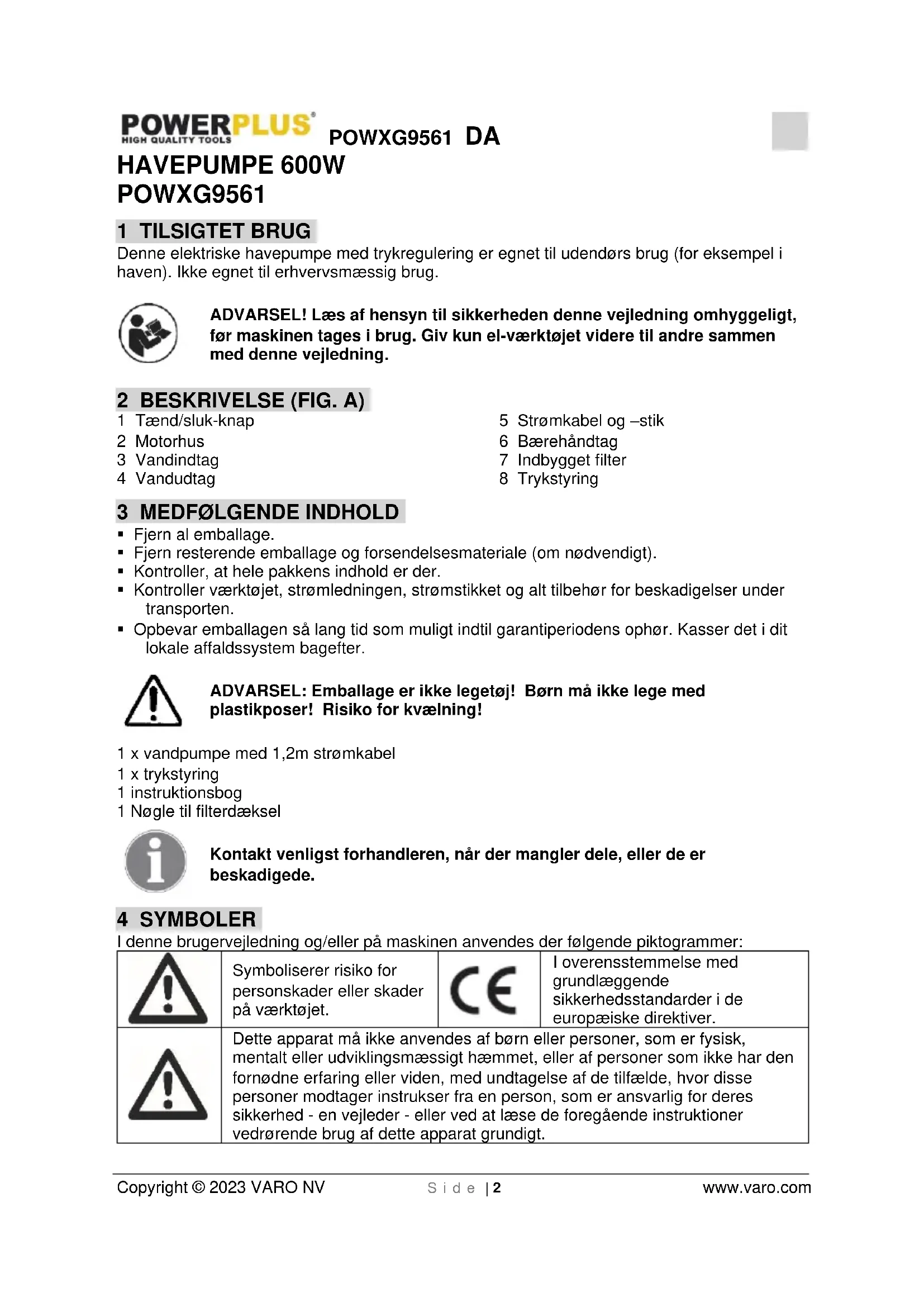 Copyright © 2023 VARO NV S i d e | 2 www.varo.com HAVEPUMPE 600W POWXG9561 1 TILSIGTET BRUG Denne elektriske havepumpe med trykregulering er egnet til udendørs brug (for eksempel i haven). Ikke egnet til erhvervsmæssig brug. ADVARSEL! Læs af hensyn til sikkerheden denne vejledning omhyggeligt, før maskinen tages i brug. Giv kun el-værktøjet videre til andre sammen med denne vejledning. 2 BESKRIVELSE (FIG. A) 1 Tænd/sluk-knap 2 Motorhus 3 Vandindtag 4 Vandudtag 5 Strømkabel og –stik 6 Bærehåndtag 7 Indbygget filter 8 Trykstyring
