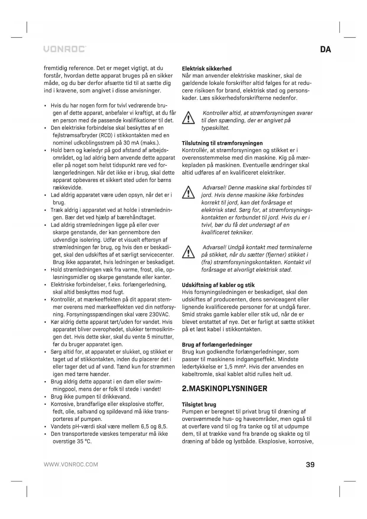 Tilsigtet brug Pumpen er beregnet til privat brug til dræning af oversvømmede hus- og haveområder, men også til at overføre vand til og fra tanke og til at udpumpe dem, til at trække vand fra brønde og skakte og til dræning af både og lystbåde. Eksplosive, korrosive,40