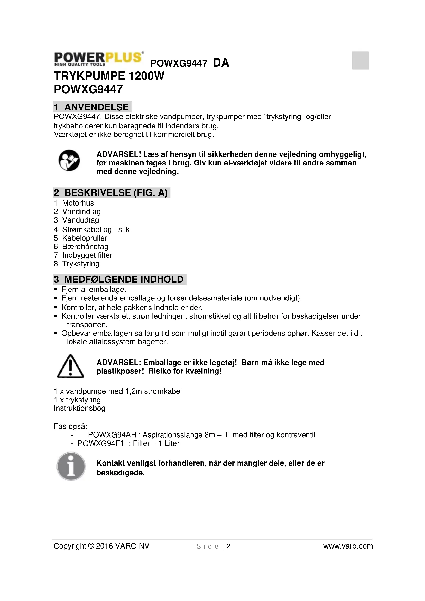Se den særskilte manual i kassen.POWXG9447 DA Copyright © 2016 VARO NV S i d e | 8 www.varo.com 13 GARANTI Produktet dækkes af garanti i henhold til gældende retlige bestemmelser i en periode på 36 måneder fra den første købers købsdato. Garantien dækker alle materiale- eller produktionsfejl. Den omfatter ikke: batterier, opladere, dele, der udsættes for normal slitage, såsom lejer, børster, ledninger, stik eller tilbehør såsom bor, borebits, savklinger, osv., beskadigelse eller defekter som følge af misbrug, ulykke eller ændring eller transportomkostninger. Beskadigelse og/eller defekter som følge af misbrug er heller ikke omfattet af nærværende garanti. Vi fraskriver os også alt ansvar for enhver personskade som følge af forkert brug af værktøjet. Reparationer må kun udføres af et autoriseret kundeservicecenter til Powerplus- værktøjer. Du kan altid få mere information på tlf. 00 32 3 292 92 90. Alle transportomkostninger skal altid afholdes af kunden, medmindre andet er aftalt skriftligt. Ligeledes kan der ikke forlanges erstatning under nærværende garanti, hvis skaden på apparatet er opstået som følge af uagtsom vedligeholdelse eller overbelastning. Garantien dækker ikke skader der opstår som følge af gennemtrængt væske, overdreven støveksponering, bevidst beskadigelse (forsætligt eller ved grov uagtsomhed), upassende anvendelse (brug til formål som apparatet ikke er egnet til), ukompetent brug (såsom ikke at respektere instrukserne i denne vejledning), inkompetent montering, lynnedslag, forkert netspænding. Denne liste er ikke fuldstændig. Accept af krav under garantien kan ikke føre til forlængelse af garantiperioden eller påbegyndelsen af en ny garantiperiode, hvis apparatet udskiftes. Apparater eller dele, som udskiftes under garantien, bliver Varo NV's ejendom. Vi forbeholder os retten til at afvise alle krav, hvis købet ikke kan bekræftes, eller hvis det er tydeligt, at produktet ikke har været behørigt vedligeholdt. (rene udluftningsåbninger, regelmæssig service af kulbørster,…) Købskvitteringen skal opbevares som bevis på købsdatoen. Det samlede værktøj skal returneres til forhandleren i rimelig ren stand, i den originale blæseformede æske (hvis relevant for enheden) sammen med købsdokumentation. 14 MILJØ Hvis maskinen skal skiftes ud efter lang tids brug, må den ikke bortskaffes som husholdningsaffald, men skal bortskaffes på en miljømæssigt forsvarlig måde. Affald produceret af de elektriske maskiner må ikke behandles som normalt husaffald. Sørg for at genbruge det, hvor der findes egnede anlæg til det. Kontakt den lokale instans eller forhandleren for at få rådgivning om indsamling og bortskaffelse.POWXG9447 DA Copyright © 2016 VARO NV S i d e | 9 www.varo.com 15 KONFORMITETSERKLÆRING VARO N.V. – Joseph Van Instraat 9 – BE2500 Lier – Belgien, erklærer hermed, at Apparatbeskrivelse: Trykpumpe Varemærke: POWERplus Varenummer: POWXG9447 er i overensstemmelse med de væsentlige krav og andre relevante bestemmelser i gældende europæiske direktiver, der er baseret på anvendelse af europæiske harmoniserede standarder. Enhver uautoriseret modifikation af apparatet ugyldiggør denne erklæring. EU-direktiver (herunder eventuelle tillæg frem til datoen for undertegnelsen): 2011/65/EU 2006/95/EF 2004/108/EF 2000/14/EF Annex V LwA 81dB(A) / 84dB(A) Harmoniserede europæiske standarder (herunder eventuelle tillæg frem til datoen for undertegnelsen): EN60335-1 : 2012 EN60335-2-41 : 2003 EN55014-1 : 2006 EN55014-2 : 1997 EN61000-3-2 : 2006 EN61000-3-3 : 2013 Indehaver af den tekniske dokumentation: Philippe Vankerkhove, VARO - Vic. Van Rompuy N.V. Undertegnede handler på vegne af selskabets administrerende direktør, Hugo Cuypers Regulatory Affairs (afdelingen for juridiske anliggender) 26/06/2015POWXG9447 SV Copyright © 2016 VARO NV S i d a | 1 www.varo.com