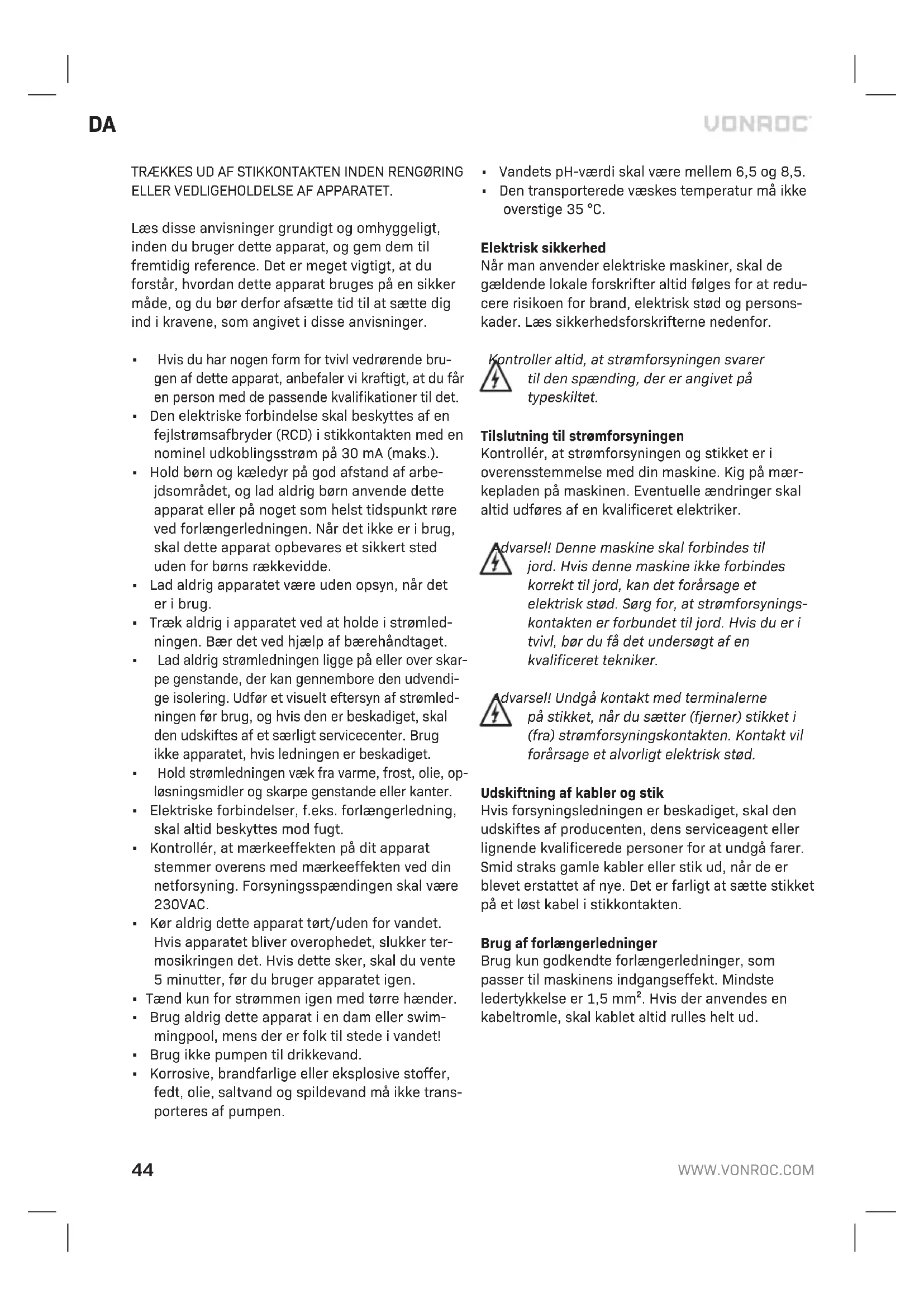 - Den transporterede væskes temperatur må ikke overstige 35 °C. Elektrisk sikkerhed Når man anvender elektriske maskiner, skal de gældende lokale forskrifter altid følges for at redu- cere risikoen for brand, elektrisk stød og persons- kader. Læs sikkerhedsforskrifterne nedenfor. Kontroller altid, at strømforsyningen svarer til den spænding, der er angivet på typeskiltet. Tilslutning til strømforsyningen Kontrollér, at strømforsyningen og stikket er i overensstemmelse med din maskine. Kig på mær- kepladen på maskinen. Eventuelle ændringer skal altid udføres af en kvalificeret elektriker. Advarsel! Denne maskine skal forbindes til jord. Hvis denne maskine ikke forbindes korrekt til jord, kan det forårsage et elektrisk stød. Sørg for, at strømforsynings- kontakten er forbundet til jord. Hvis du er i tvivl, bør du få det undersøgt af en kvalificeret tekniker. Advarsel! Undgå kontakt med terminalerne på stikket, når du sætter (fjerner) stikket i (fra) strømforsyningskontakten. Kontakt vil forårsage et alvorligt elektrisk stød. Udskiftning af kabler og stik Hvis forsyningsledningen er beskadiget, skal den udskiftes af producenten, dens serviceagent eller lignende kvalificerede personer for at undgå farer. Smid straks gamle kabler eller stik ud, når de er blevet erstattet af nye. Det er farligt at sætte stikket på et løst kabel i stikkontakten. Brug af forlængerledninger Brug kun godkendte forlængerledninger, som passer til maskinens indgangseffekt. Mindste ledertykkelse er 1,5 mm². Hvis der anvendes en kabeltromle, skal kablet altid rulles helt ud.DA