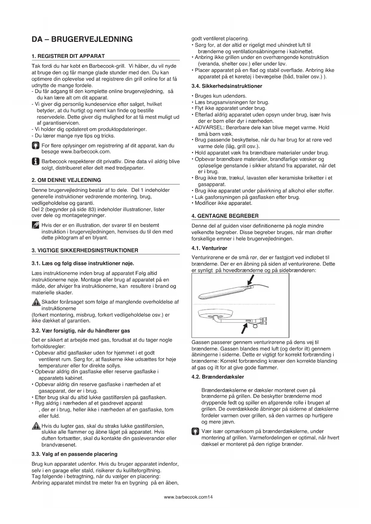 Denne del af guiden viser denitionerne på nogle mindre velkendte begreber. Disse begreber bruges, når man drøfter forskellige emner i hele brugervejledningen. 4.1. Venturirør Venturirørene er de små rør, der er fastgjort ved indløbet til brænderne. Der er en åbning på siden af venturirørene. Dette er synligt på hovedbrænderne og på sidebrænderen: Gassen passerer gennem venturirørene på dens vej til brænderne. Gassen blandes med luft (og derfor ilt) gennem åbningerne i siderne. Dette er vigtigt for korrekt forbrænding i brænderne: Korrekt forbrænding kræver den korrekte blanding af gas og ilt for at give gode ammer. 4.2. Brænderdæksler Brænderdækslerne er dæksler monteret oven på brænderne på grillen. De beskytter brænderne mod dryppende fedt og spiller en afgørende rolle i brugen af grillen. De overdækkede åbninger på siderne af dækslerne fordeler varmen over grillen, så den varmes op hurtigere og mere jævn. Vær især opmærksom på brænderdækslerne, under montering af grillen. Varmefordelingen er optimal, når hvert dæksel er monteret på den rigtige brænder. www.barbecook.com144.3. Emalje Nogle dele af apparatet er dækket af et lag smeltet glas, også kendt som emalje. Denne emalje beskytter det underliggende metal mod korrosion. Emalje er et materiale af høj kvalitet: Det er korrosionsbestandigt, det nedbrydes ikke under påvirkning af høje temperaturer, og det er meget let at vedligeholde. Da emaljen er mindre eksibel end metallet, som den påføres på, kan emaljestykker knække af, når apparatet bruges forkert. For at undgå dette problem skal du være forsigtig, når du monterer emaljebelagte dele, og du skal altid vedligeholde emaljen i henhold til instruktionerne i denne vejledning. 4.4. Opblussen Opblussen er pludselige ammer, der gnister fra skålen, når du griller De forårsages normalt af dryppende fedt eller marinade.