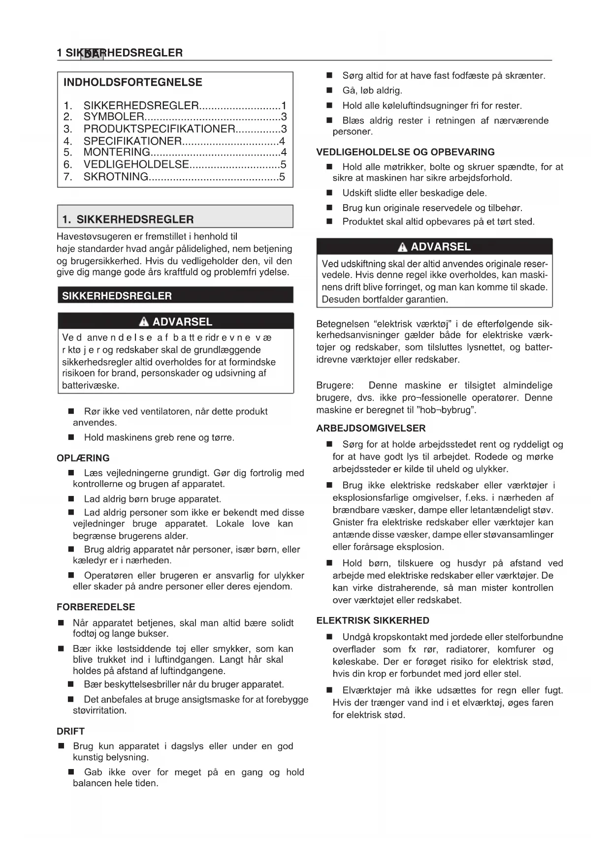 Havestøvsugeren er fremstillet i henhold til høje standarder hvad angår pålidelighed, nem betjening og brugersikkerhed. Hvis du vedligeholder den, vil den give dig mange gode års kraftfuld og problemfri ydelse. SIKKERHEDSREGLER ADVARSEL Ve d anve n d e l s e a f b a tt e ridr e v n e v æ r ktø j e r og redskaber skal de grundlæggende sikkerhedsregler altid overholdes for at formindske risikoen for brand, personskader og udsivning af batterivæske. Rør ikke ved ventilatoren, når dette produkt anvendes. Hold maskinens greb rene og tørre. OPLÆRING Læs vejledningerne grundigt. Gør dig fortrolig med kontrollerne og brugen af apparatet. Lad aldrig børn bruge apparatet. Lad aldrig personer som ikke er bekendt med disse vejledninger bruge apparatet. Lokale love kan begrænse brugerens alder. Brug aldrig apparatet når personer, især børn, eller kæledyr er i nærheden. Operatøren eller brugeren er ansvarlig for ulykker eller skader på andre personer eller deres ejendom. FORBEREDELSE Når apparatet betjenes, skal man altid bære solidt fodtøj og lange bukser. Bær ikke løstsiddende tøj eller smykker, som kan blive trukket ind i luftindgangen. Langt hår skal holdes på afstand af luftindgangene. Bær beskyttelsesbriller når du bruger apparatet. Det anbefales at bruge ansigtsmaske for at forebygge støvirritation. DRIFT Brug kun apparatet i dagslys eller under en god kunstig belysning. Gab ikke over for meget på en gang og hold balancen hele tiden. Sørg altid for at have fast fodfæste på skrænter. Gå, løb aldrig. Hold alle køleluftindsugninger fri for rester. Blæs aldrig rester i retningen af nærværende personer.