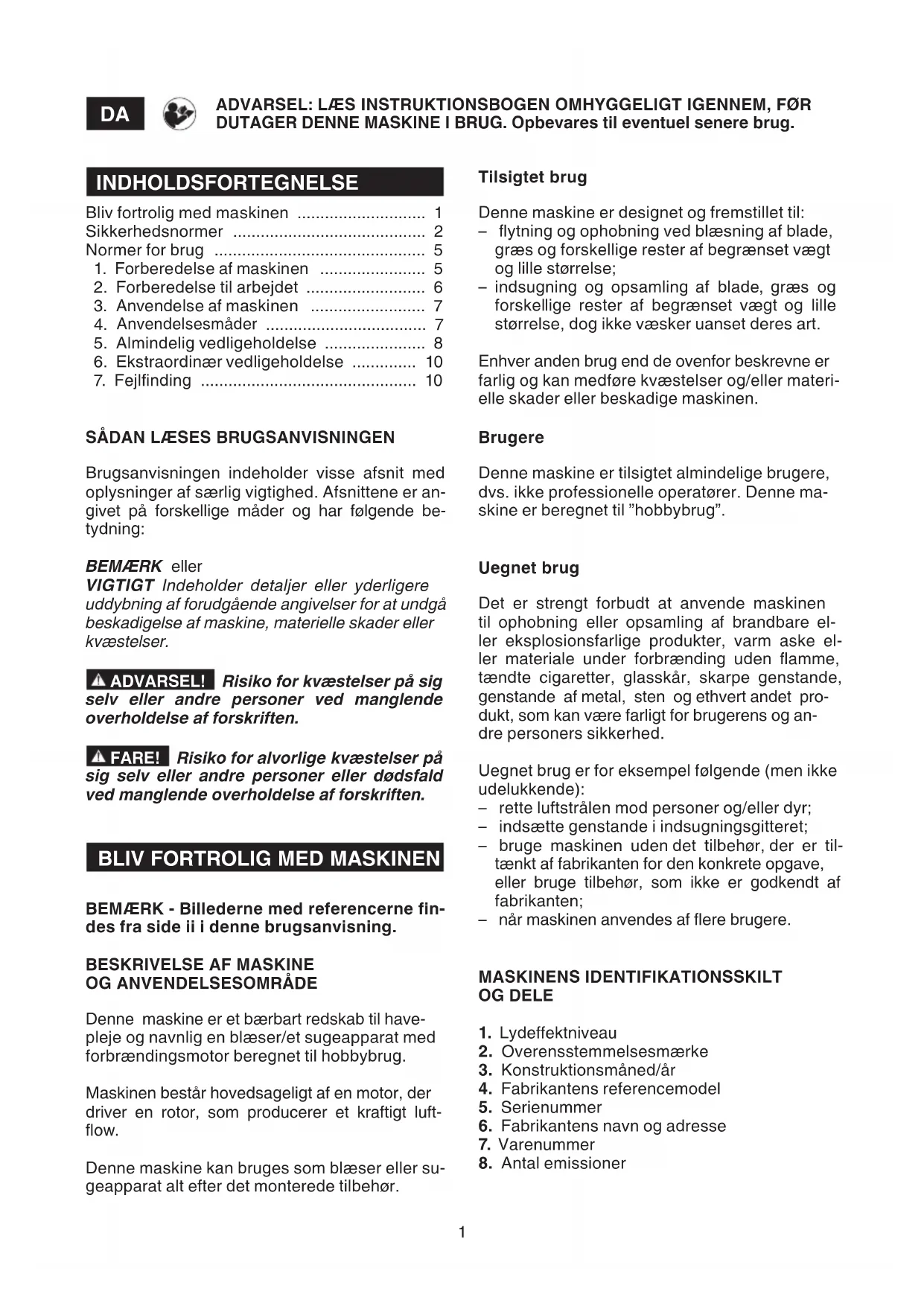Denne maskine er et bærbart redskab til have- pleje og navnlig en blæser/et sugeapparat med forbrændingsmotor beregnet til hobbybrug. Maskinen består hovedsageligt af en motor, der driver en rotor, som producerer et kraftigt luft- ow. Denne maskine kan bruges som blæser eller su- geapparat alt efter det monterede tilbehør. Tilsigtet brug Denne maskine er designet og fremstillet til: – ytning og ophobning ved blæsning af blade, græs og forskellige rester af begrænset vægt og lille størrelse; – indsugning og opsamling af blade, græs og forskellige rester af begrænset vægt og lille størrelse, dog ikke væsker uanset deres art. Enhver anden brug end de ovenfor beskrevne er farlig og kan medføre kvæstelser og/eller materi- elle skader eller beskadige maskinen. Brugere Denne maskine er tilsigtet almindelige brugere, dvs. ikke professionelle operatører. Denne ma- skine er beregnet til ”hobbybrug”. Uegnet brug Det er strengt forbudt at anvende maskinen til ophobning eller opsamling af brandbare el- ler eksplosionsfarlige produkter, varm aske el- ler materiale under forbrænding uden amme, tændte cigaretter, glasskår, skarpe genstande, genstande af metal, sten og ethvert andet pro- dukt, som kan være farligt for brugerens og an- dre personers sikkerhed. Uegnet brug er for eksempel følgende (men ikke udelukkende): – rette luftstrålen mod personer og/eller dyr; – indsætte genstande i indsugningsgitteret; – bruge maskinen uden det tilbehør, der er til- tænkt af fabrikanten for den konkrete opgave, eller bruge tilbehør, som ikke er godkendt af fabrikanten; – når maskinen anvendes af ere brugere. MASKINENS IDENTIFIKATIONSSKILT OG DELE